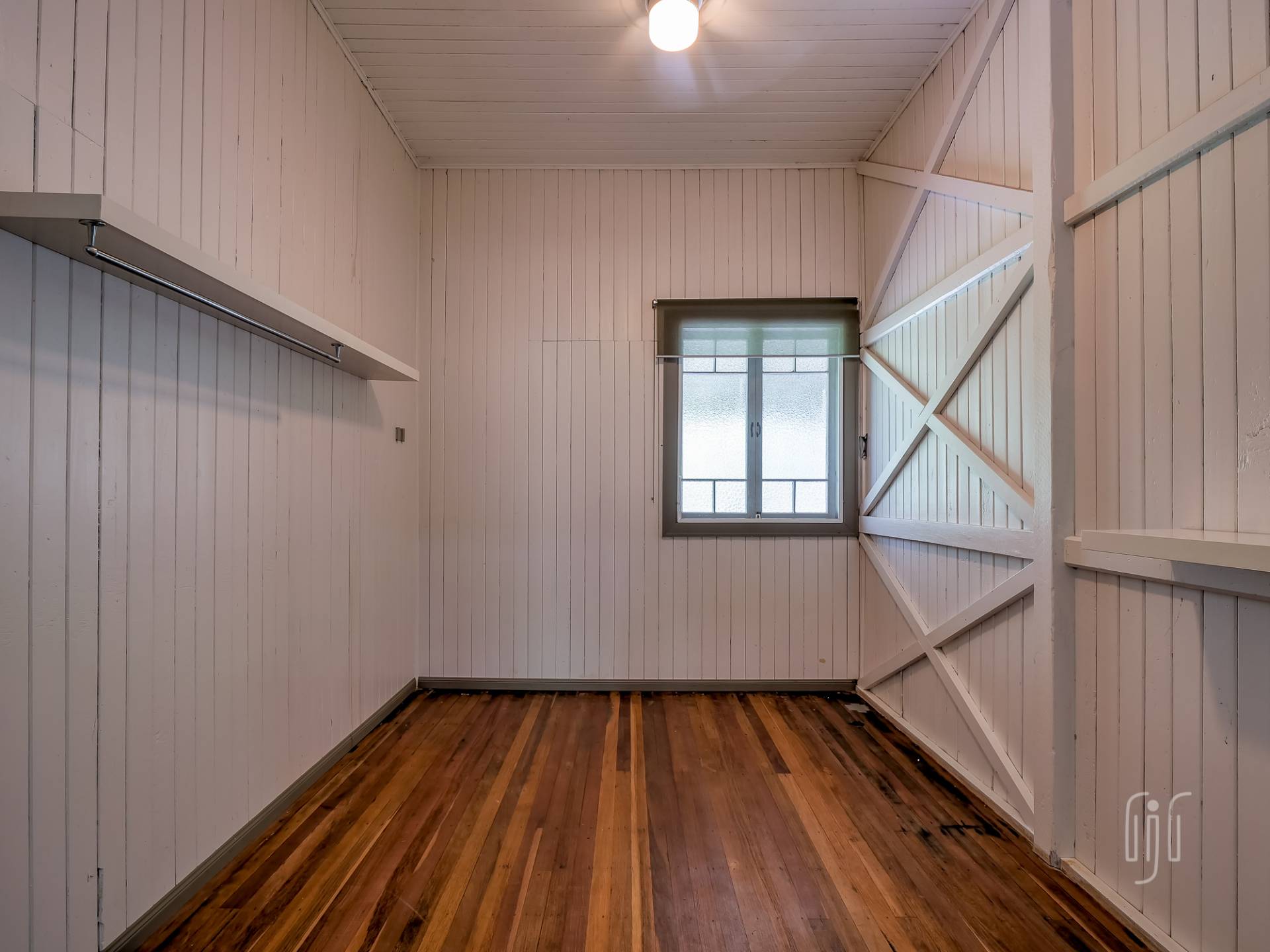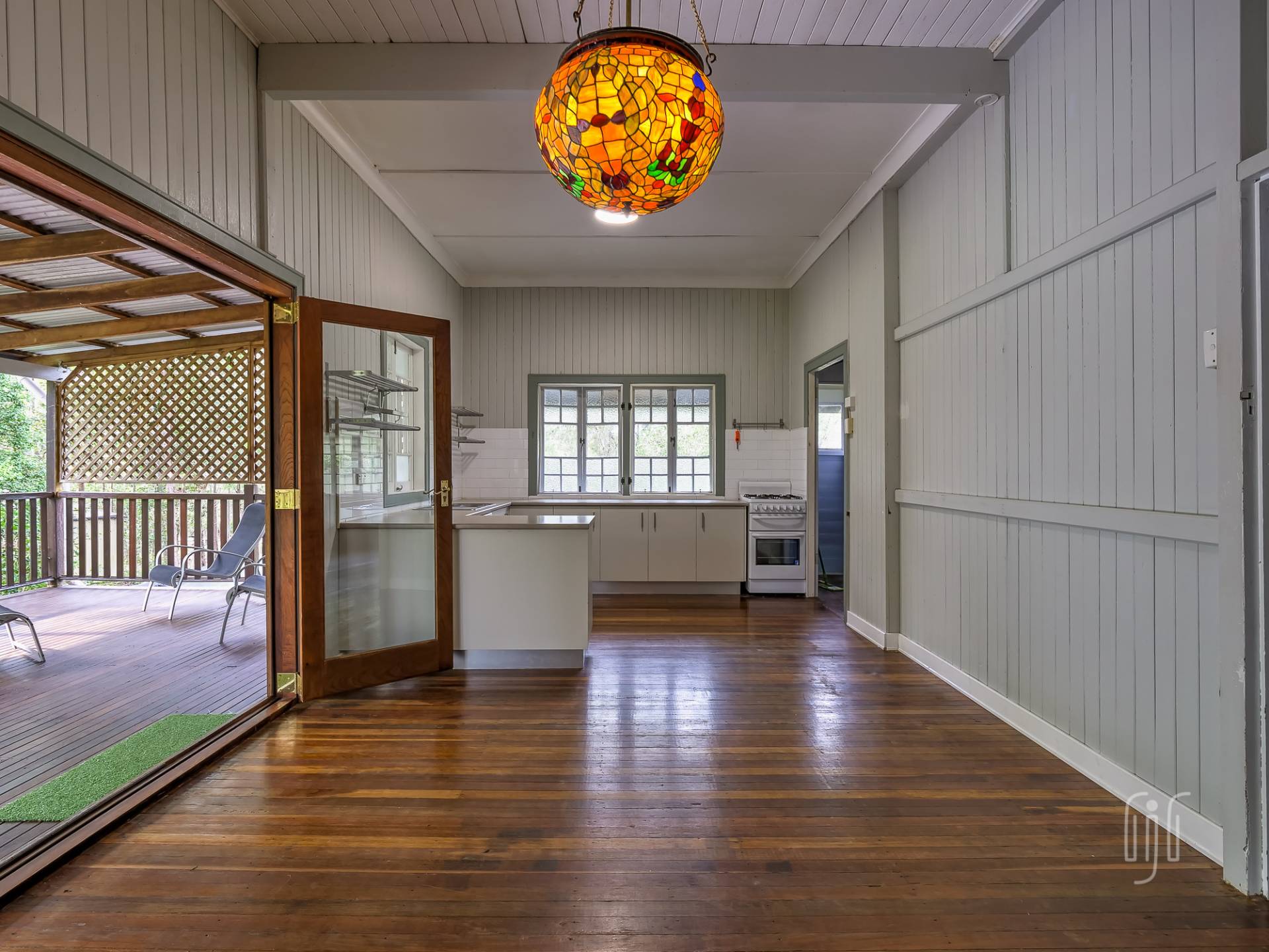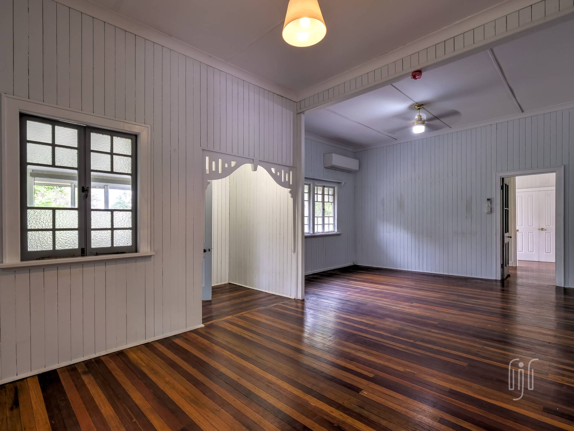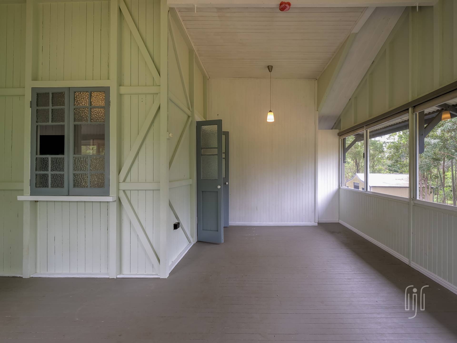 Externally, it’s a weatherboard-clad house, partially screened from the road. Internally, you enter from the front stairs to an enclosed veranda/sleepout, very characteristic of Queenslanders, where verandas were enclosed to provide additional space.