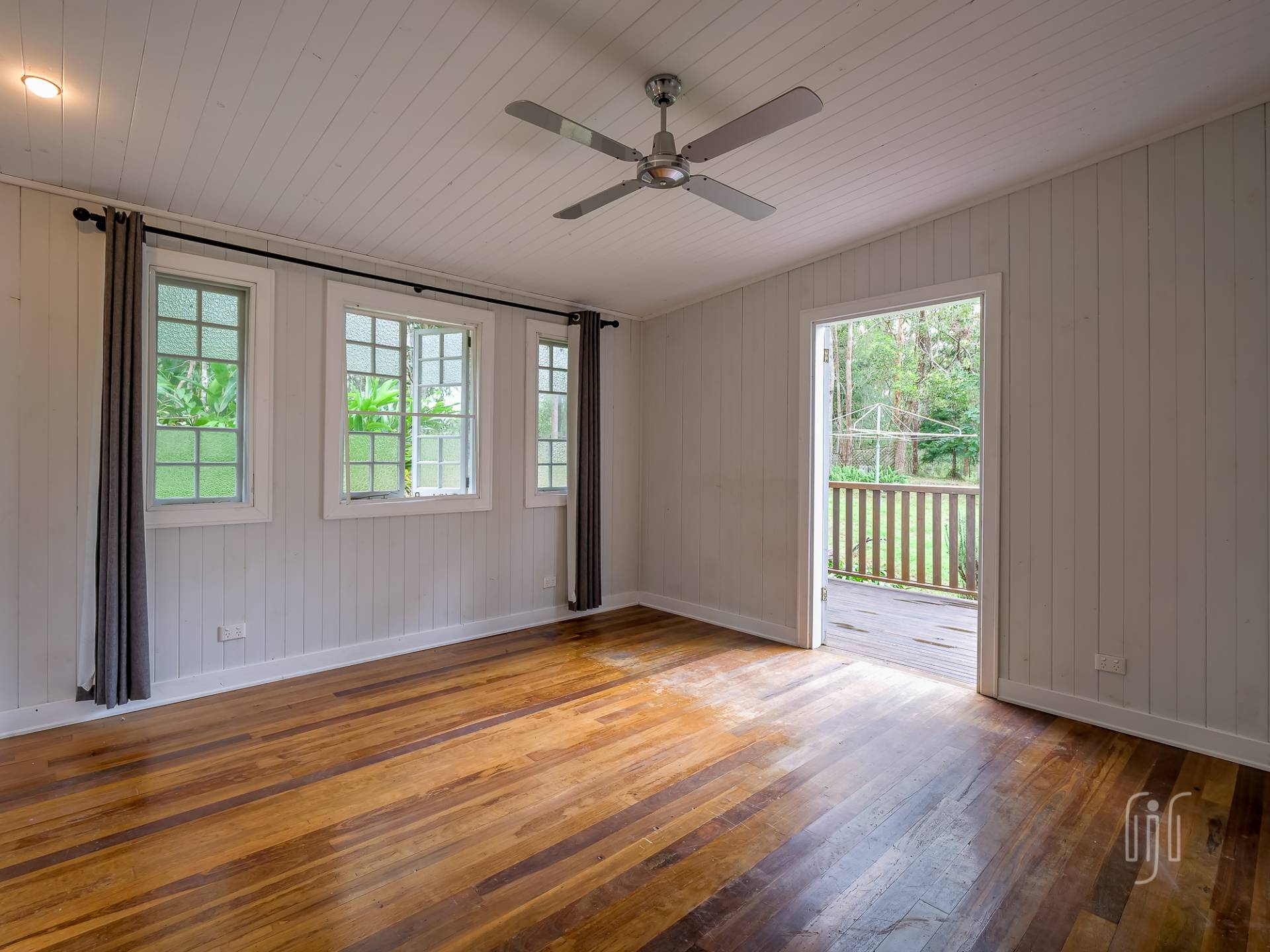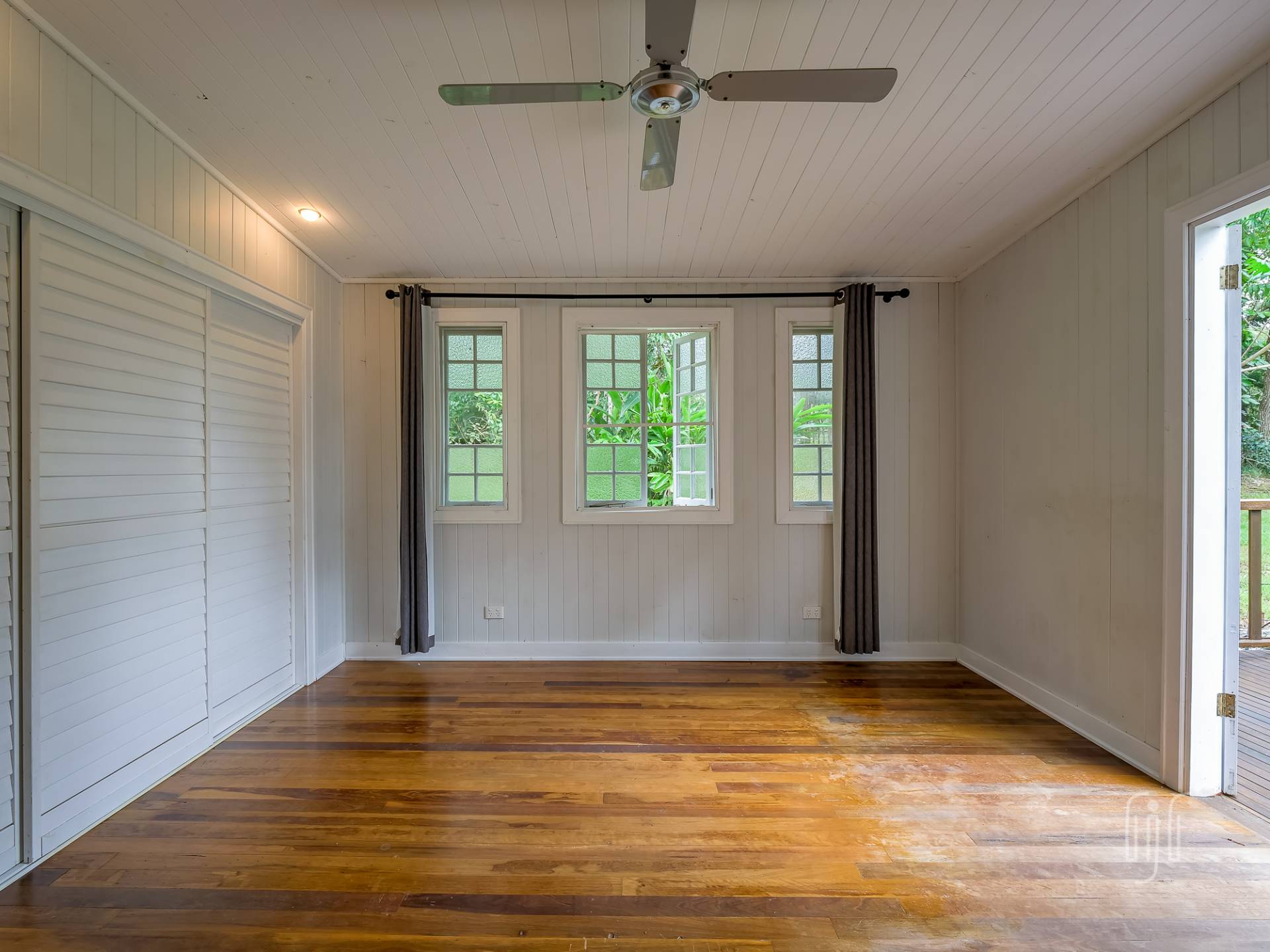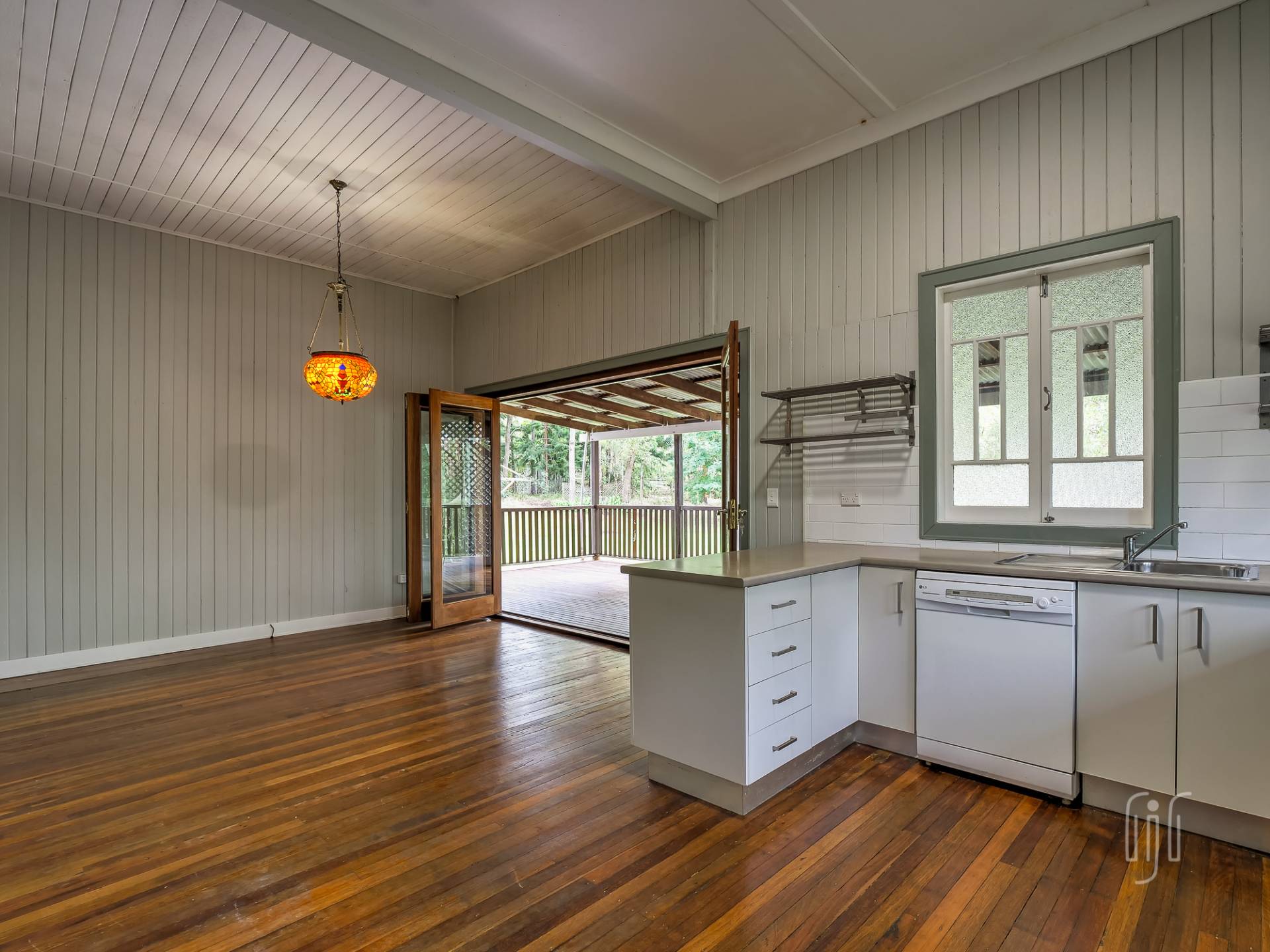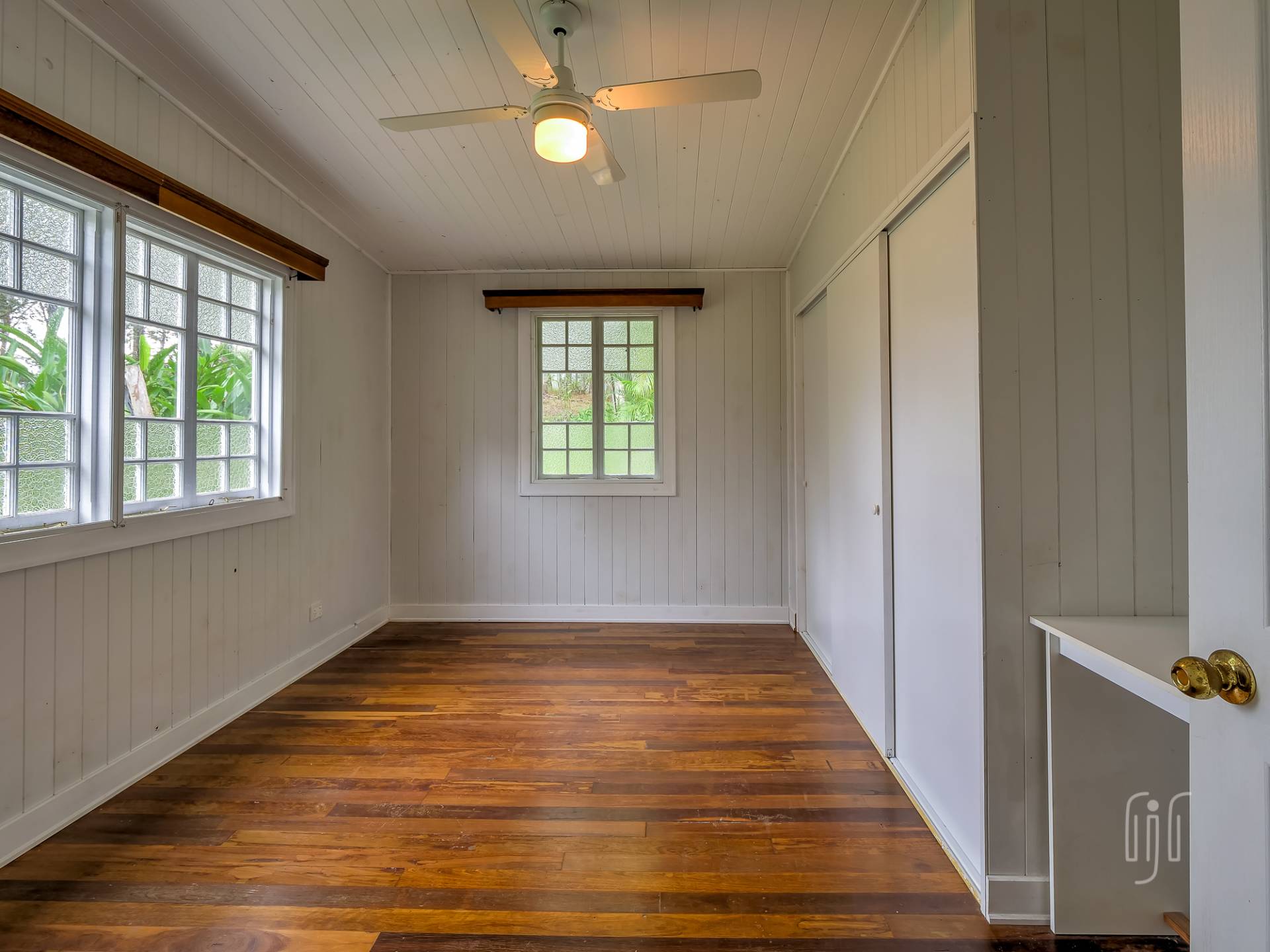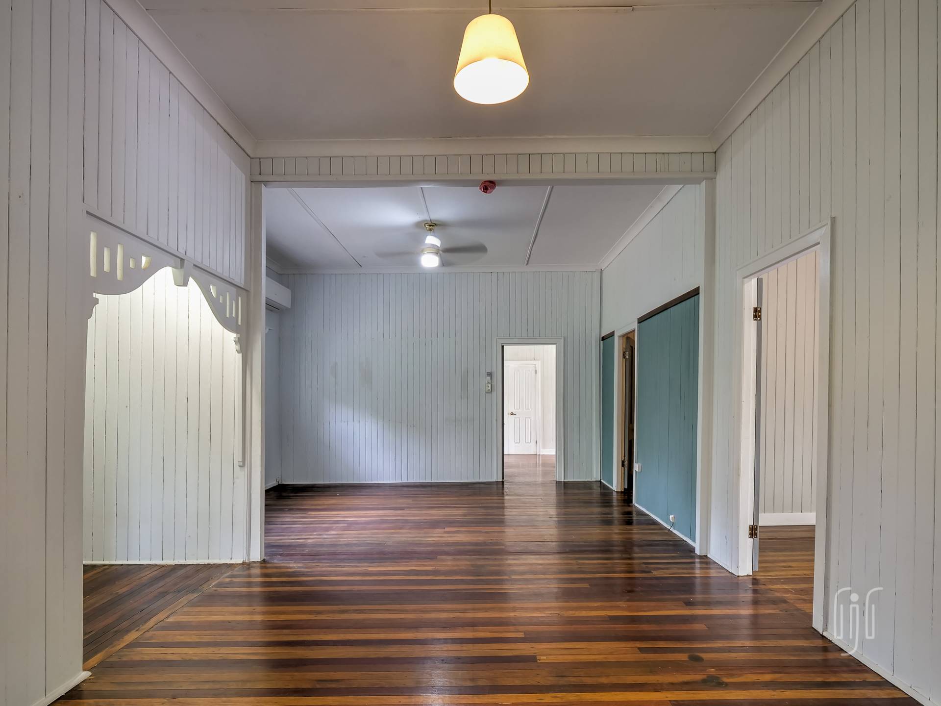 Externally, it’s a weatherboard-clad house, partially screened from the road. Internally, you enter from the front stairs to an enclosed veranda/sleepout, very characteristic of Queenslanders, where verandas were enclosed to provide additional space.