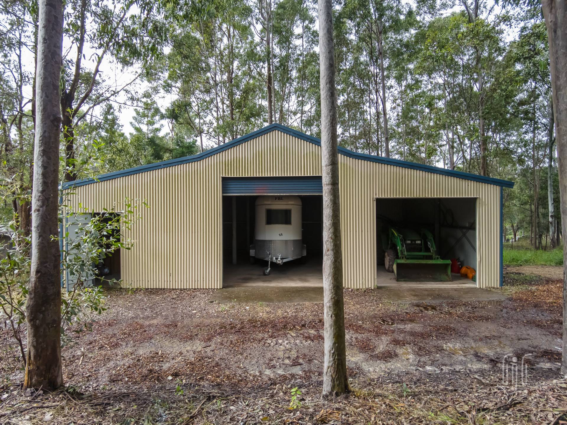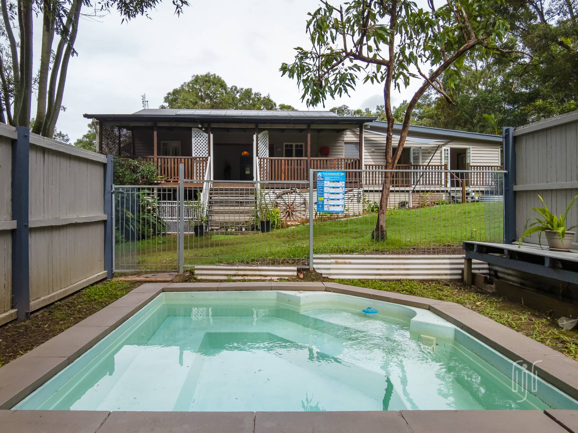 The rear deck has multiple access points, to/from the dining room, hallway & main bedroom as well as stairs towards the spa-pool. This north-facing deck overlooks the spa-pool & beyond. While there is parking space for 2 vehicles under the home, the 3-bay garage at the back looks after all workshop, storage & 2 additional vehicle parking bays including 1 high access bay. There is a paddock with a dam at the back and services include solar power, back to the grid.