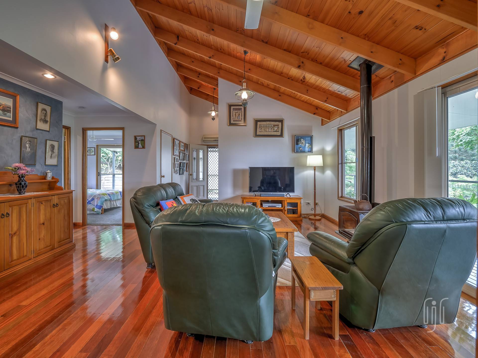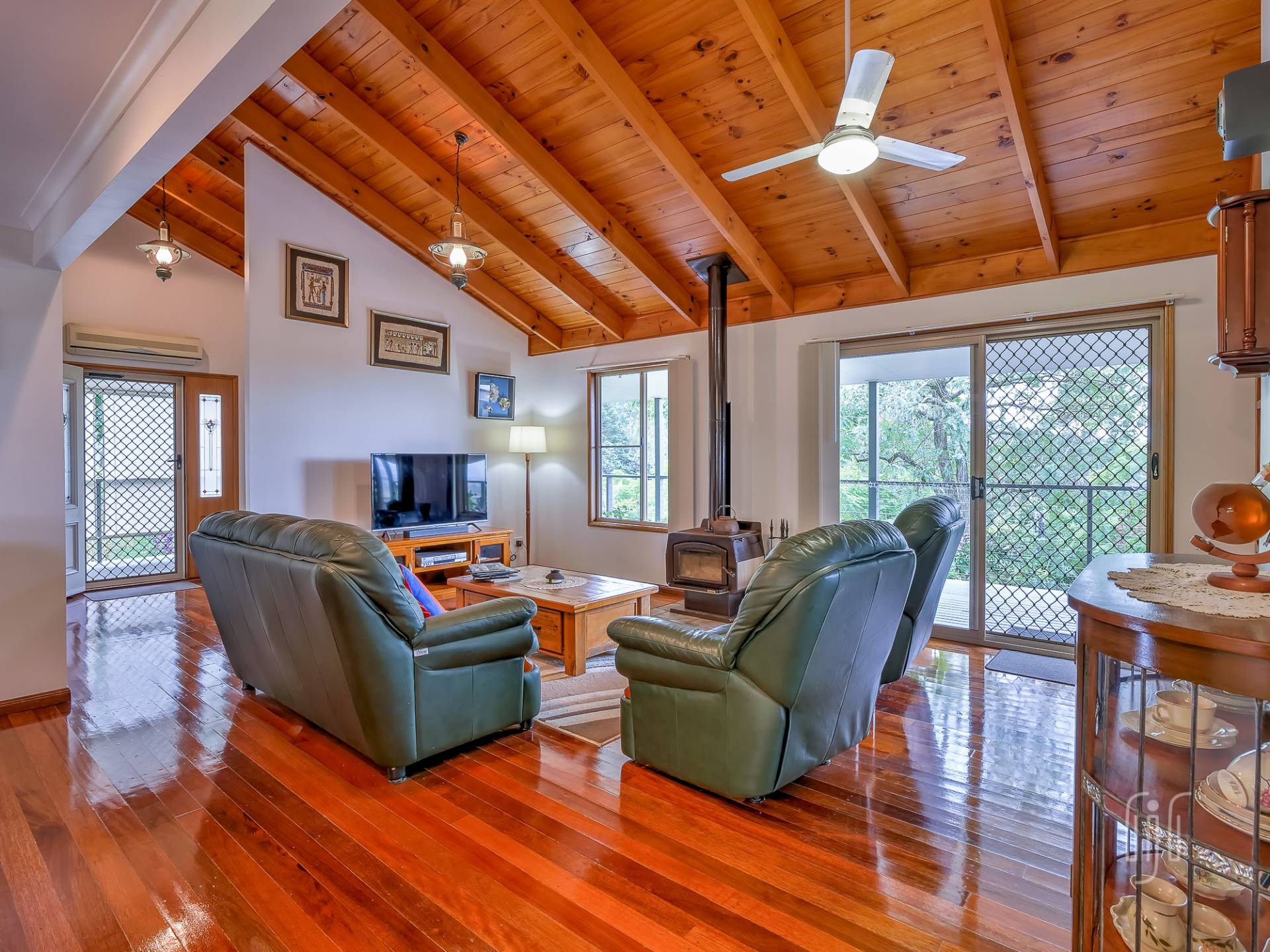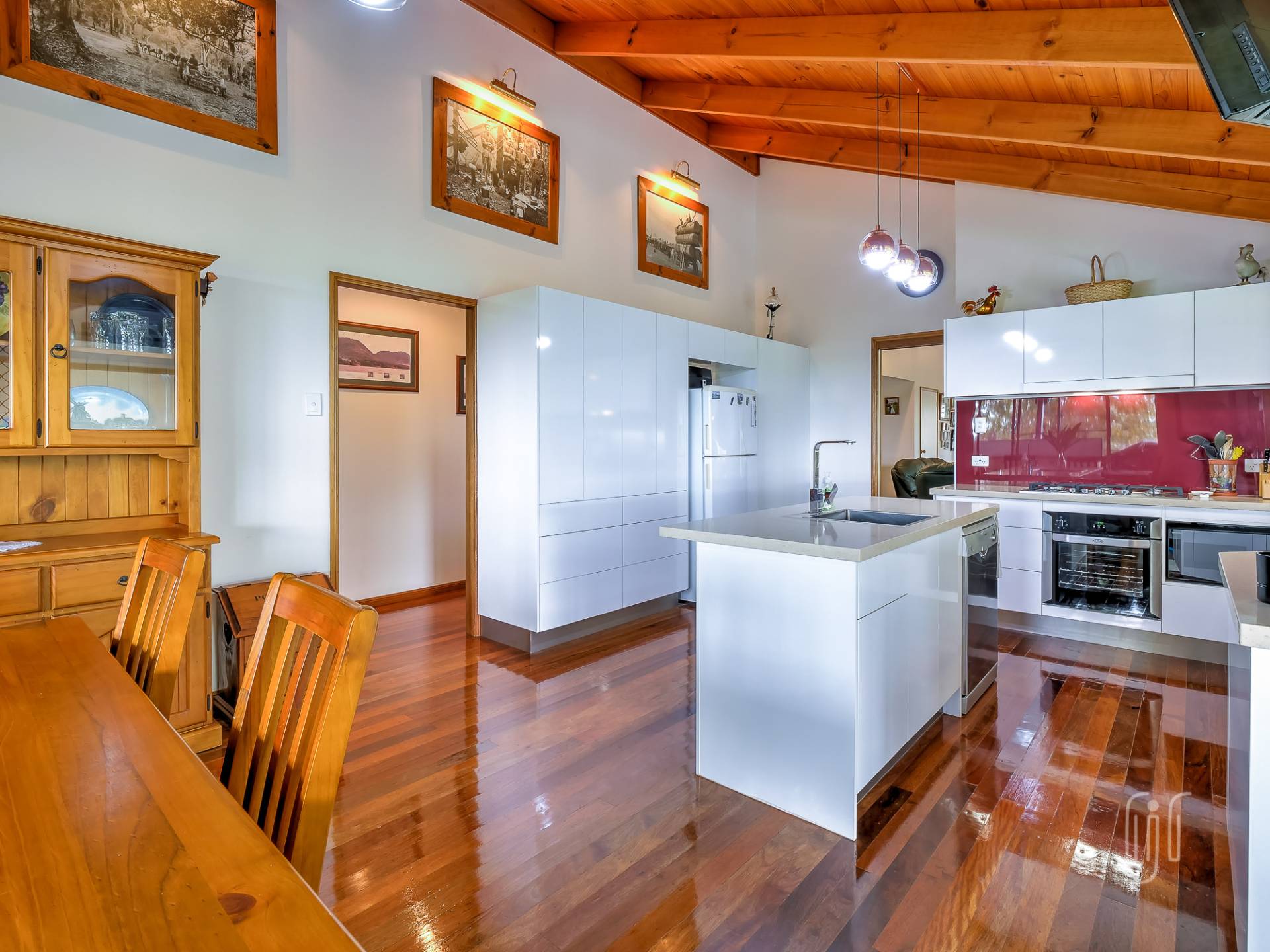 Common entry to the hardiplank-clad homestead is to the kitchen / dining room, the way all country homes should be. The kitchen has gas cooking & dishwasher, an island bench & plenty of storage, glass splashback & a great outlook. The loungeroom has both air-conditioning & slow combustion heating, while all living areas have polished timber floors & timber-lined, cathedral ceilings.