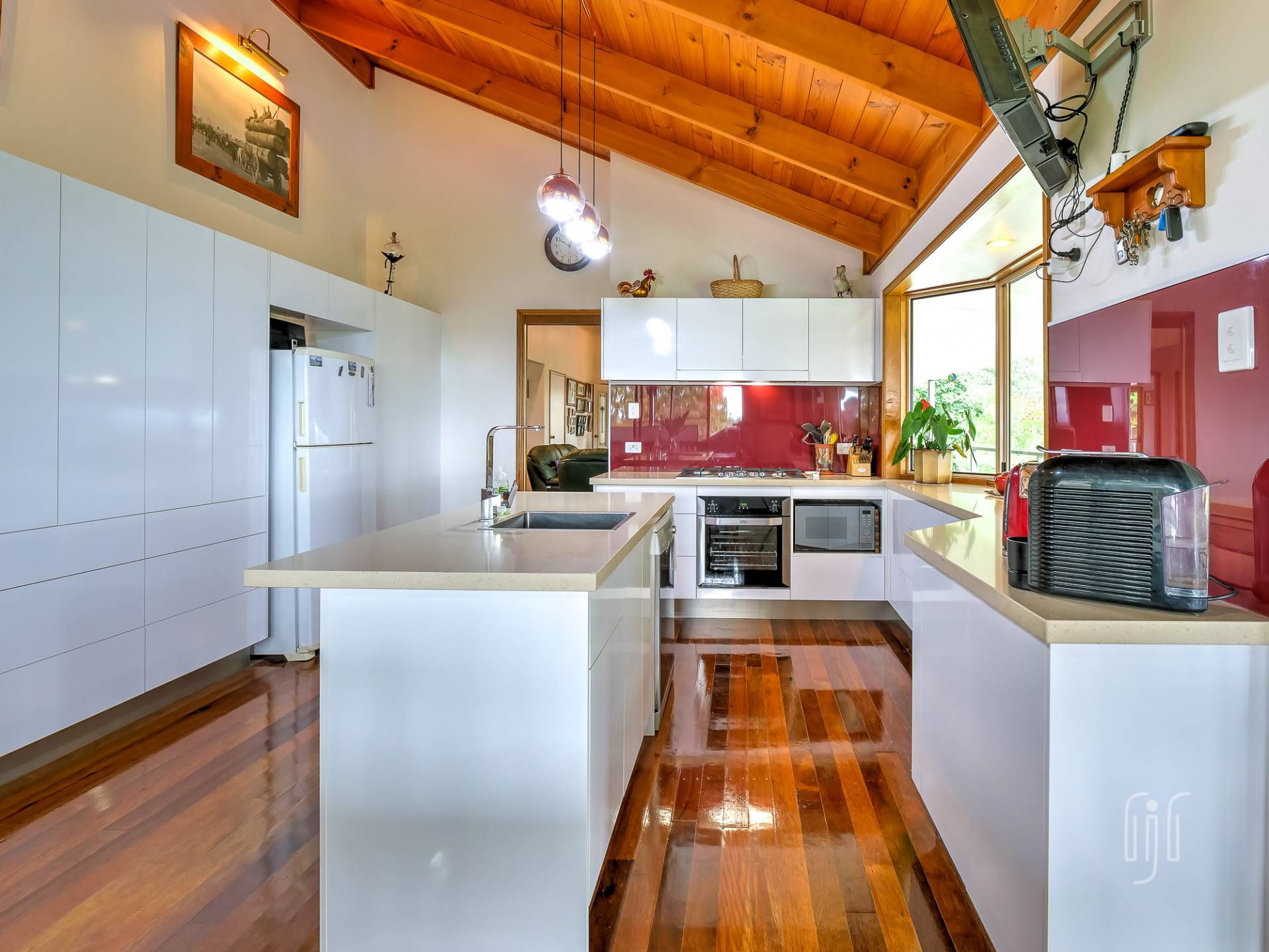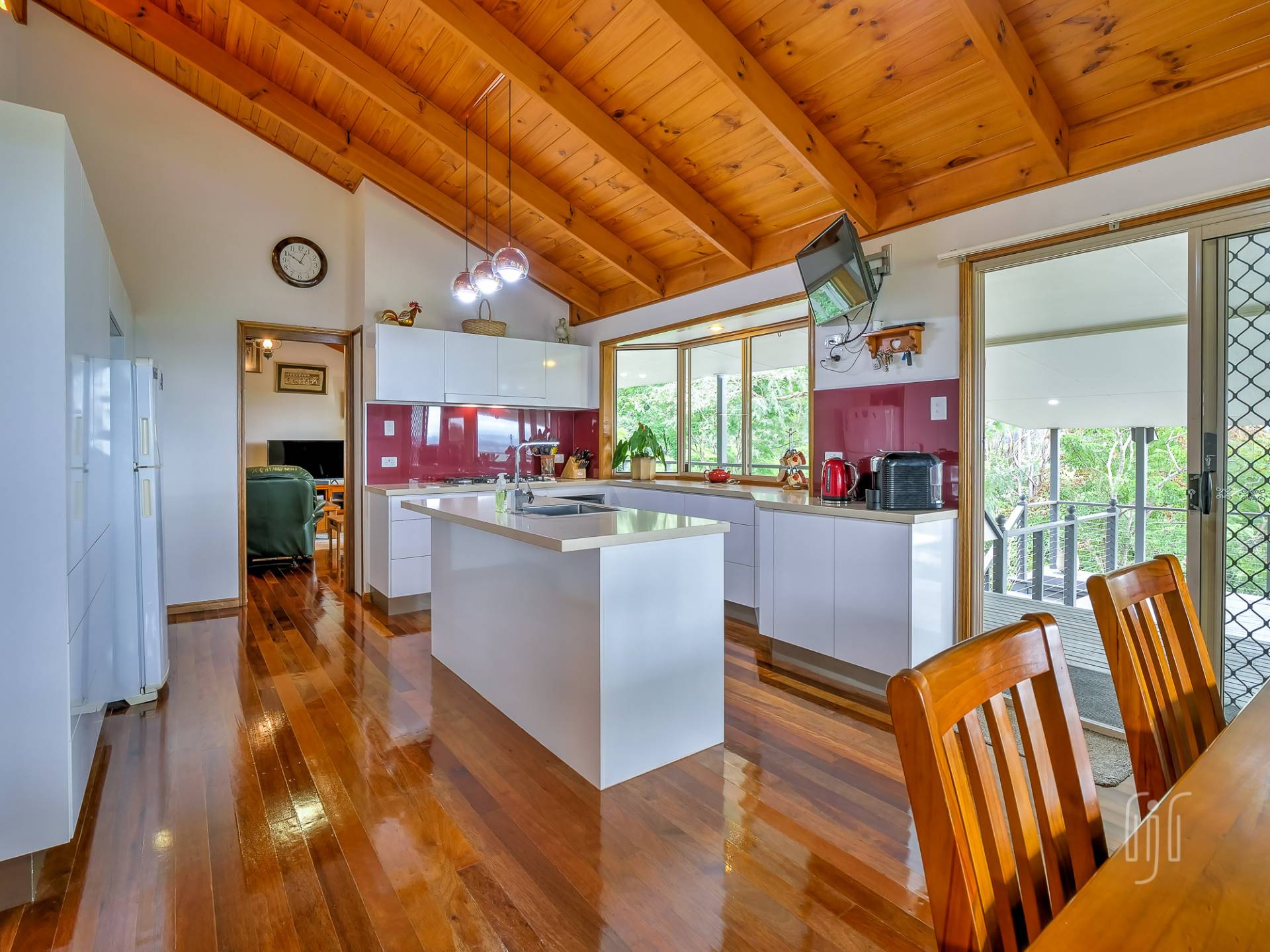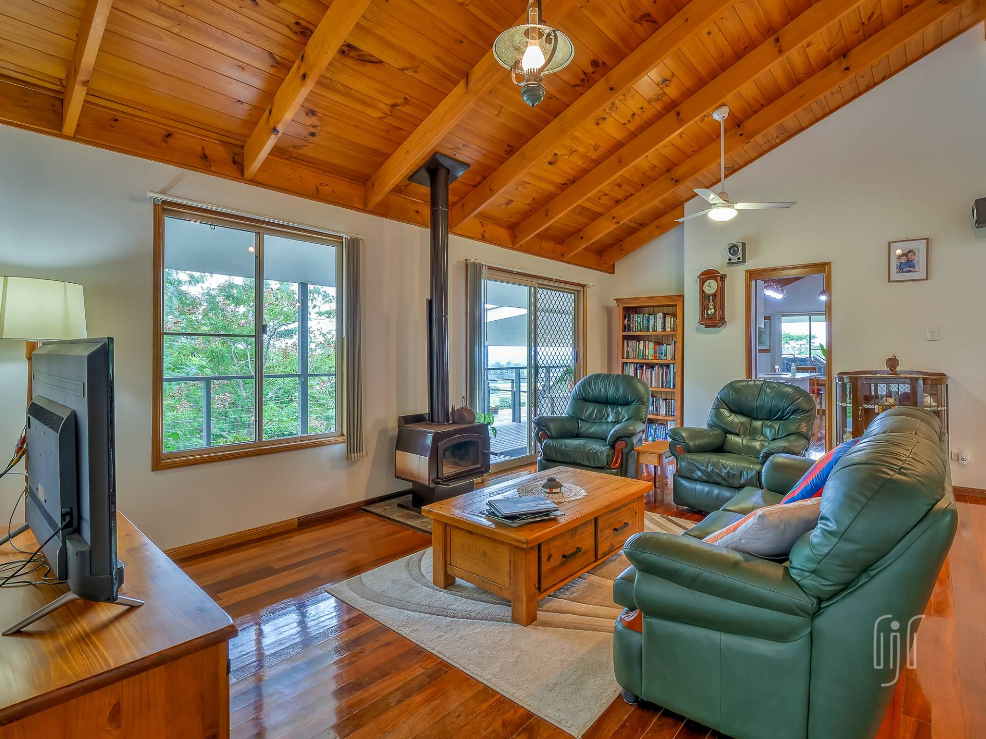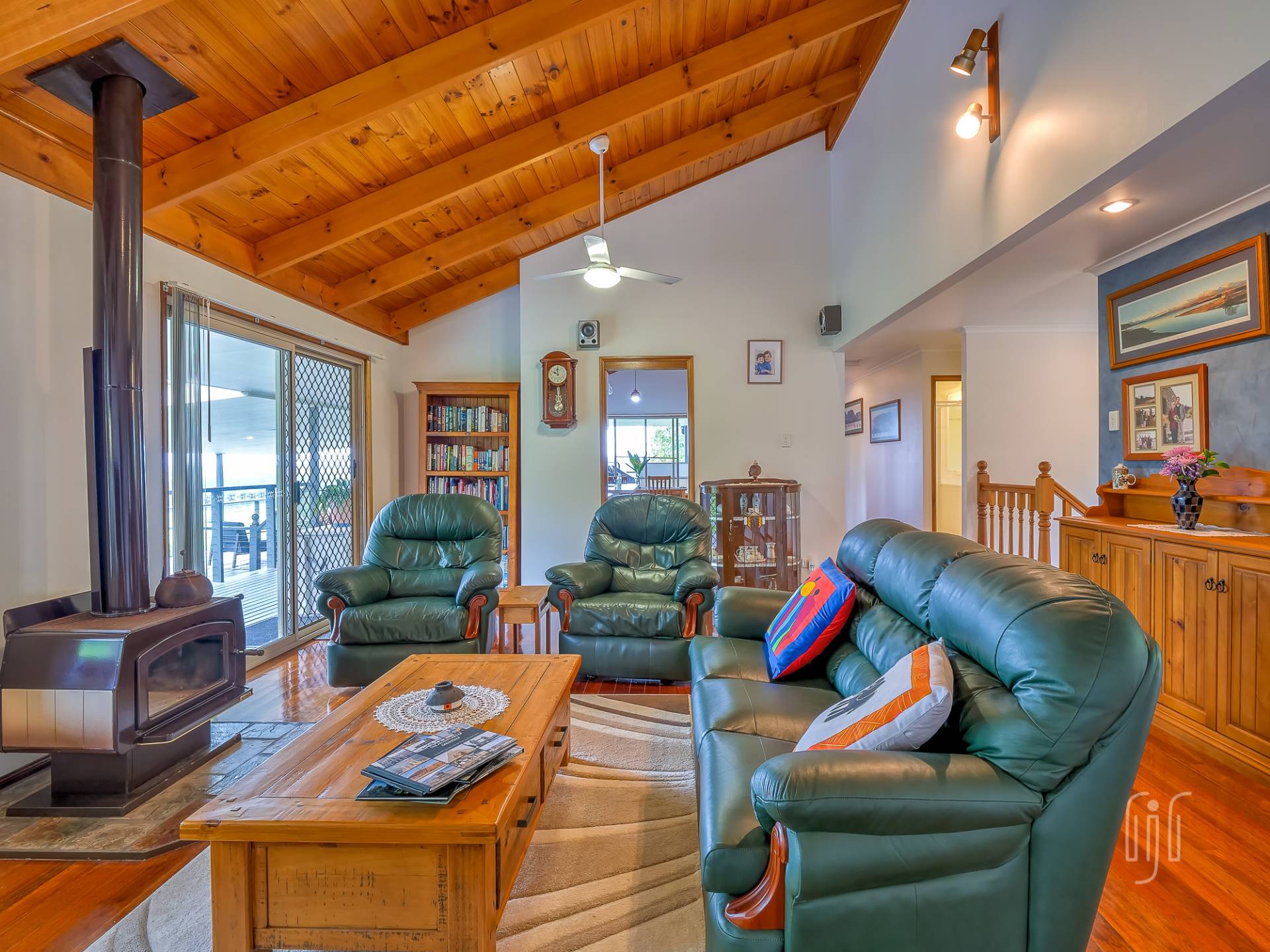 Common entry to the hardiplank-clad homestead is to the kitchen / dining room, the way all country homes should be. The kitchen has gas cooking & dishwasher, an island bench & plenty of storage, glass splashback & a great outlook. The loungeroom has both air-conditioning & slow combustion heating, while all living areas have polished timber floors & timber-lined, cathedral ceilings.