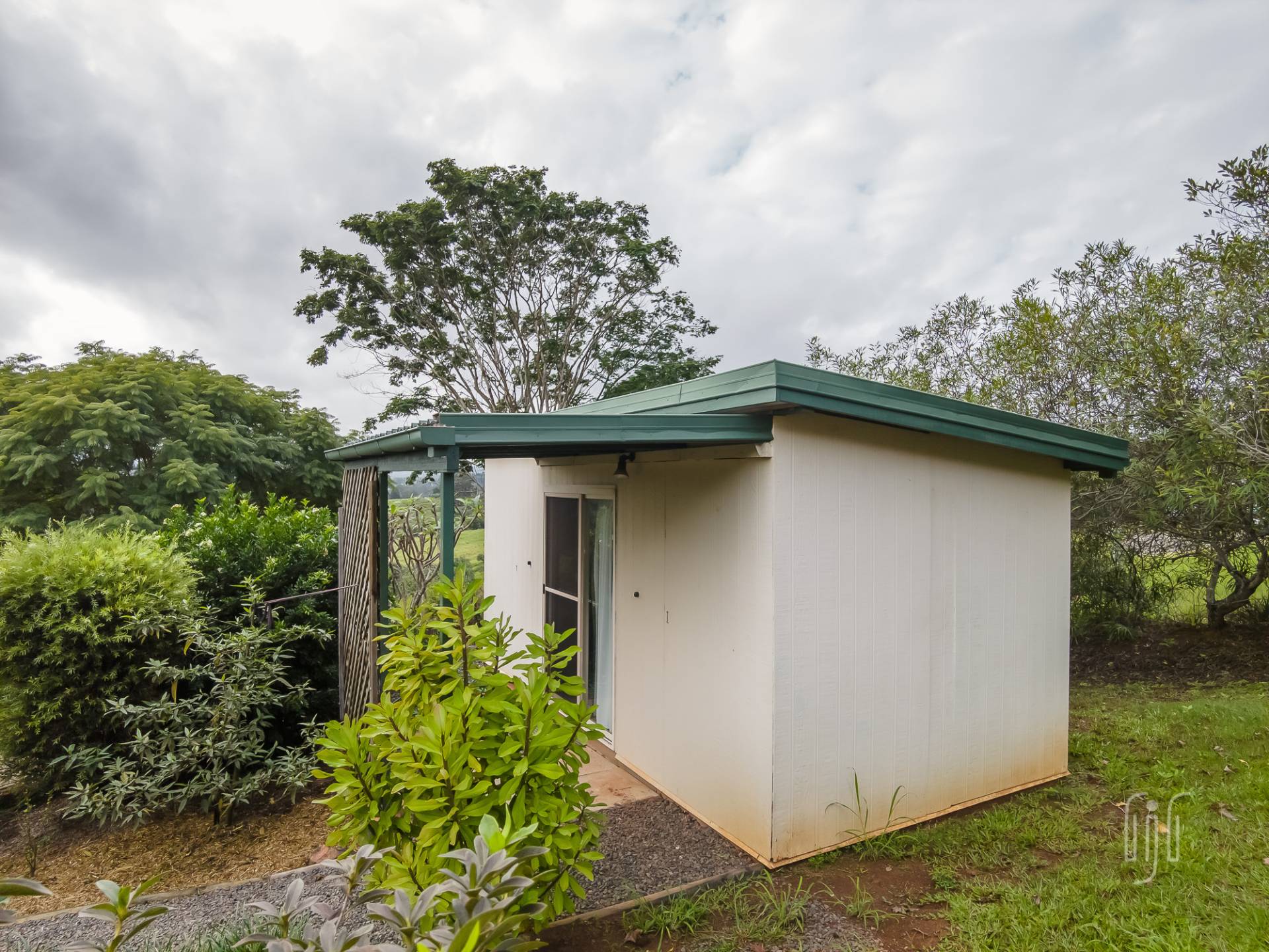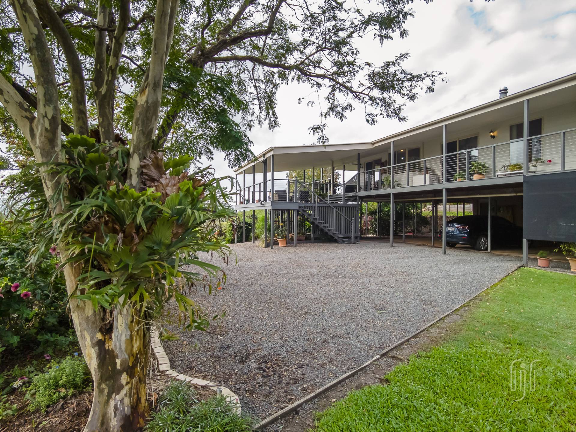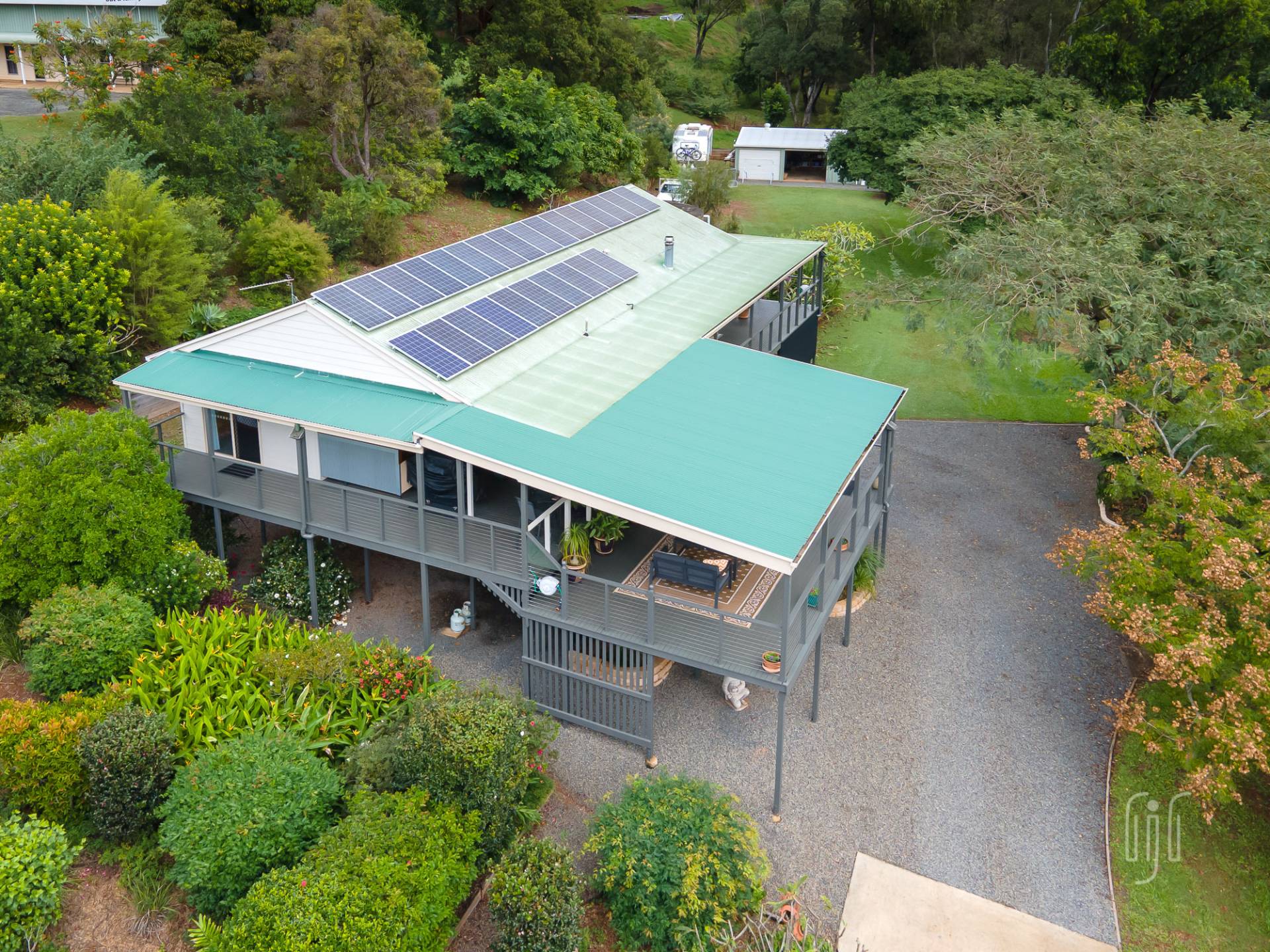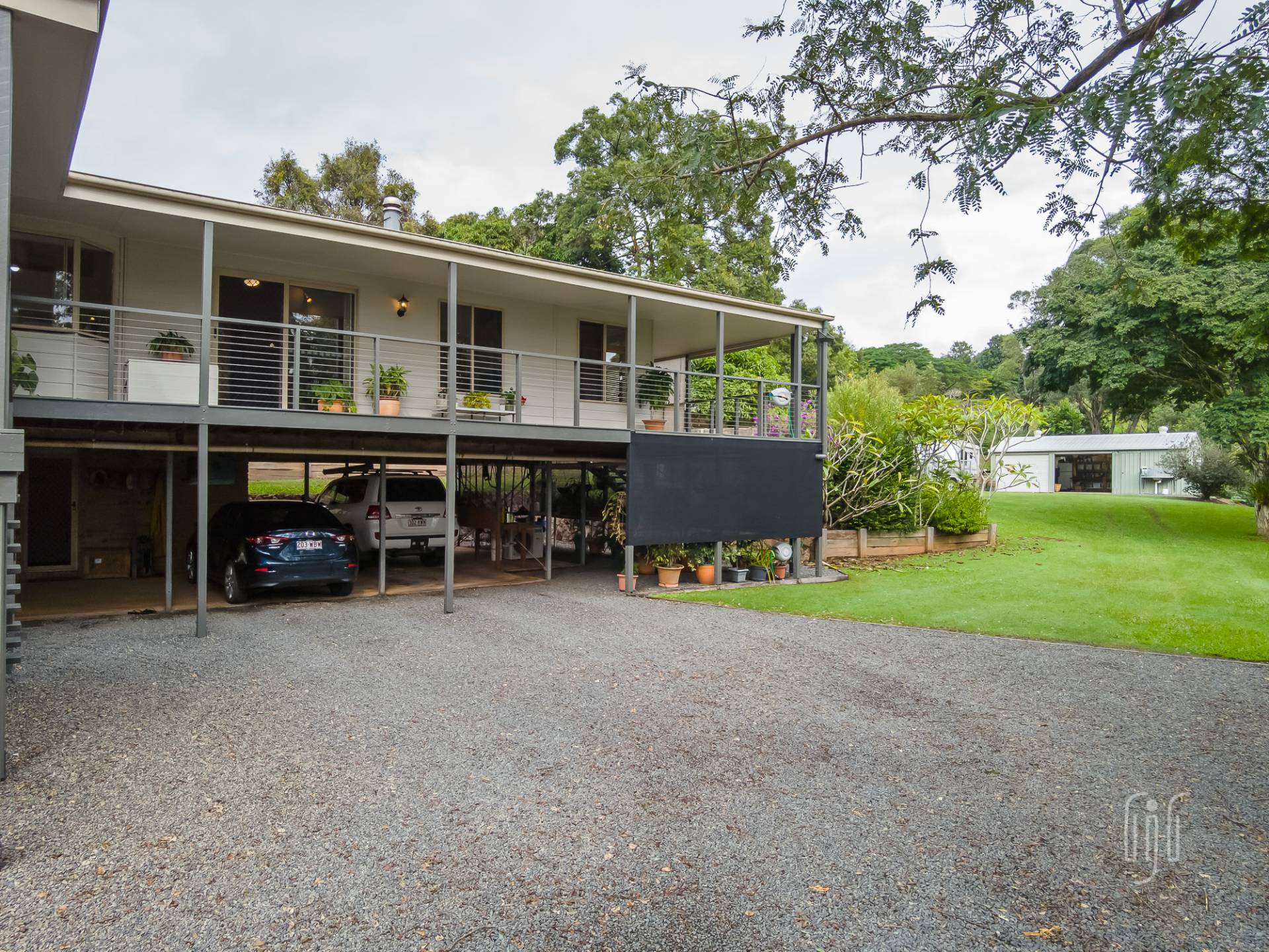 There are 3 bedrooms, all with built-in robes, the main with an en-suite. The main bathroom has a separate toilet and there is a dedicated study area. The laundry is downstairs, at the vehicle parking entry to the home. While under the house provides parking for 2 vehicles plus storage and entertaining areas, other outbuildings include a lined studio, hidden in the garden, and a 3-bay garage to cater for workshop, storage & two more vehicle parking spots. Property services include solar power, back to the grid.