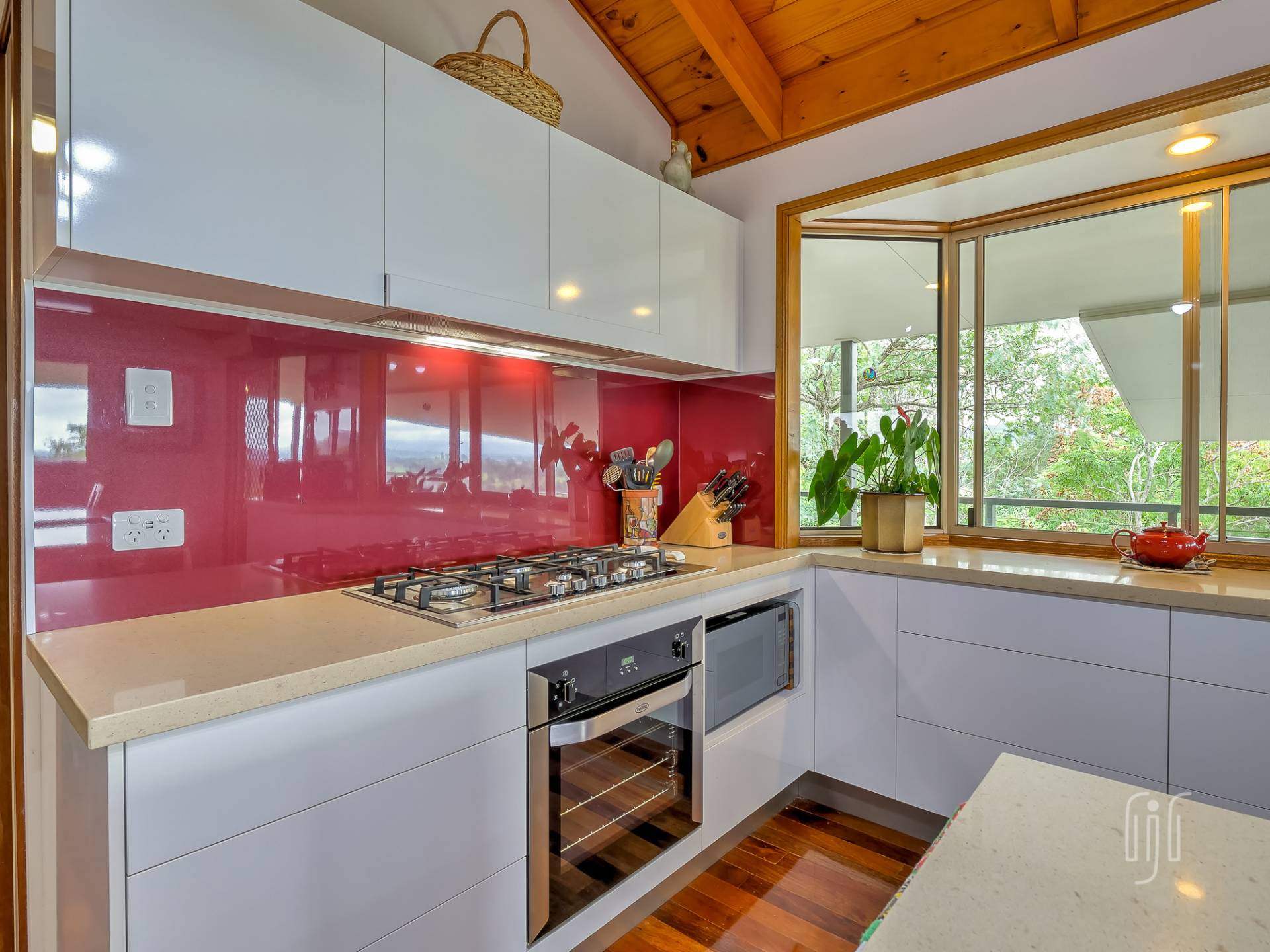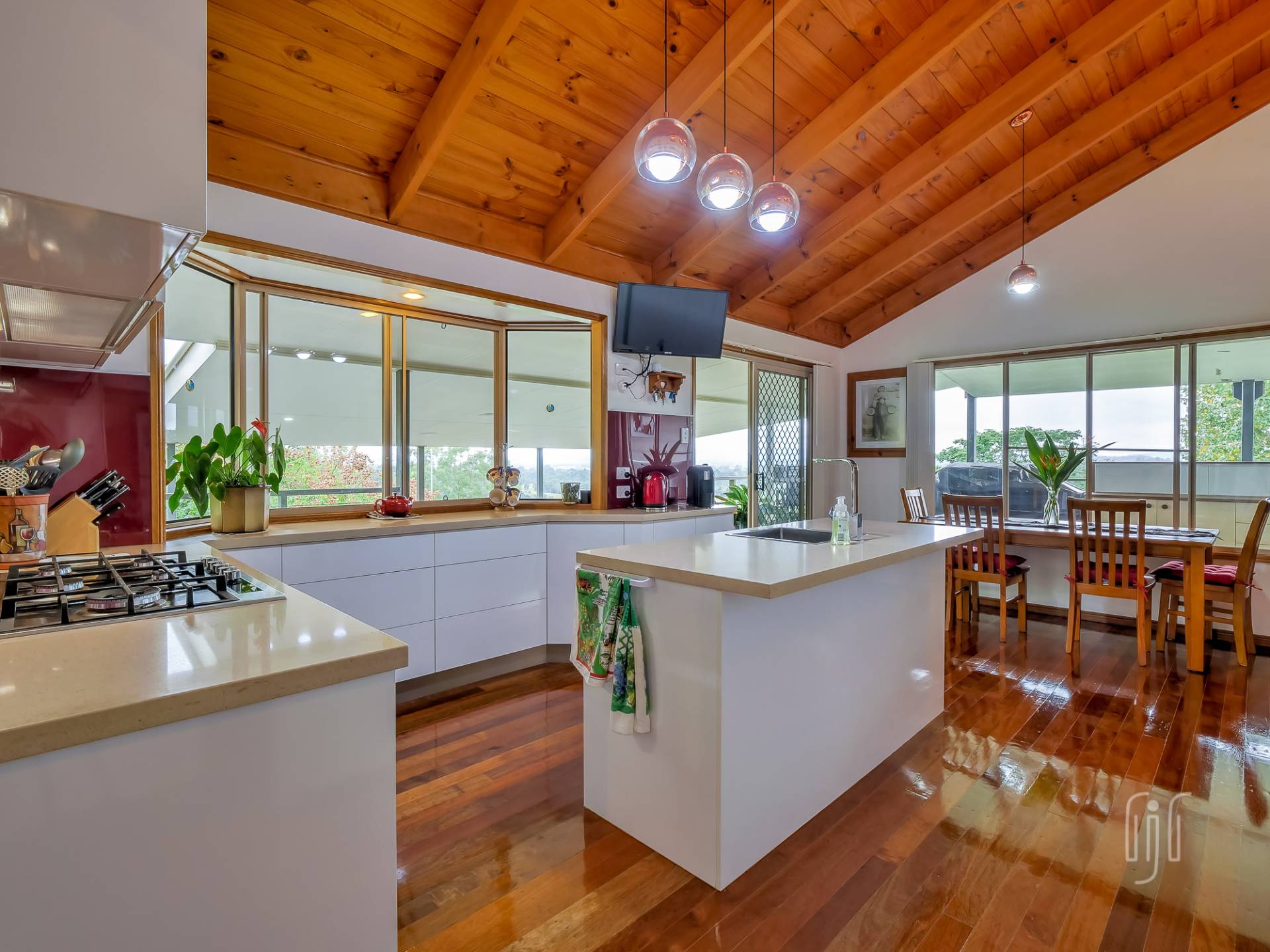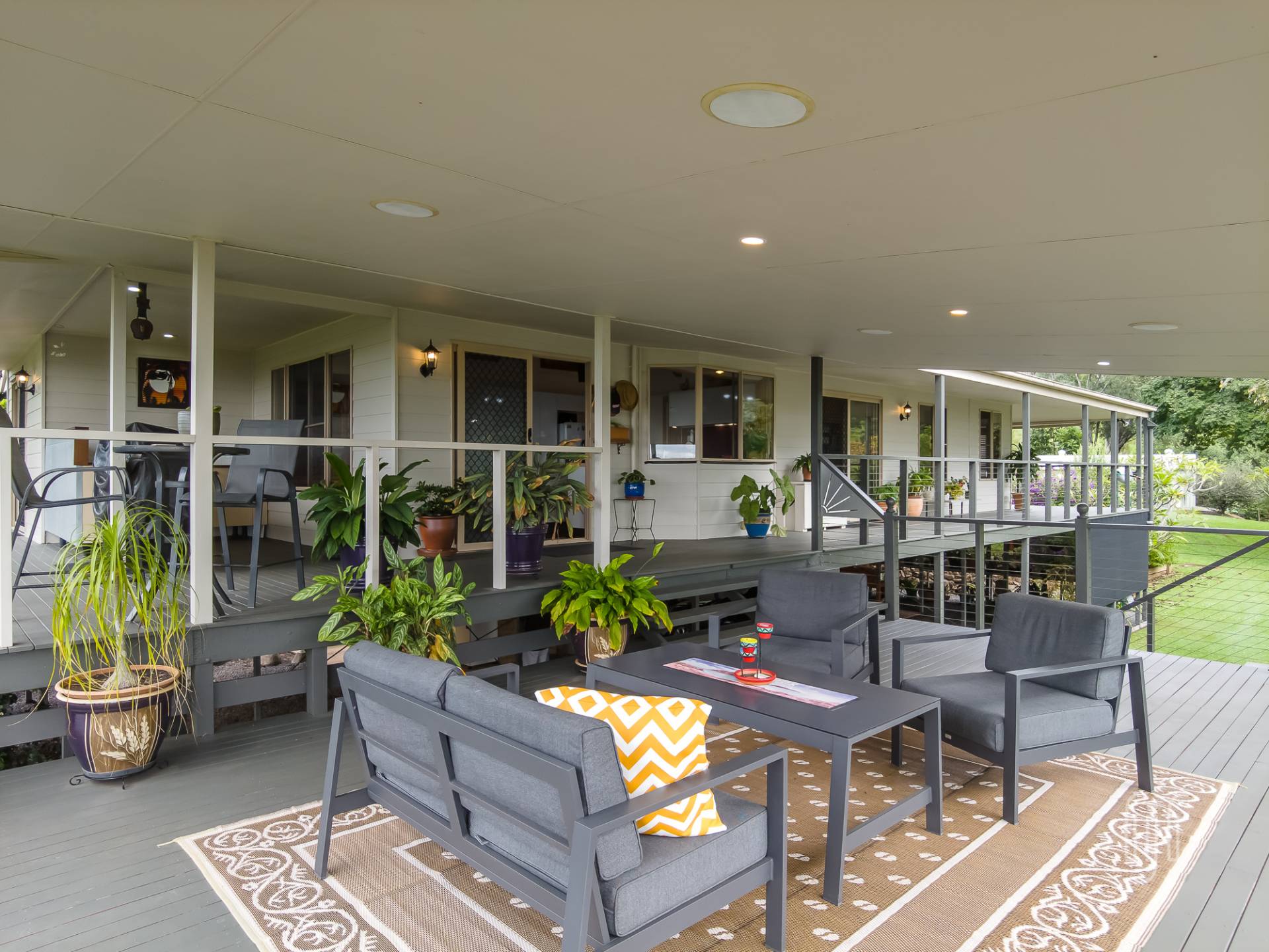The front deck is the place to be! It’s a generous size that adds additional room to the original veranda ... it captures the breezes & the magnificent views. It’s the entry point that stops you, every time, on your way to inside. The veranda, on 3 sides, incorporates an outdoor kitchen.