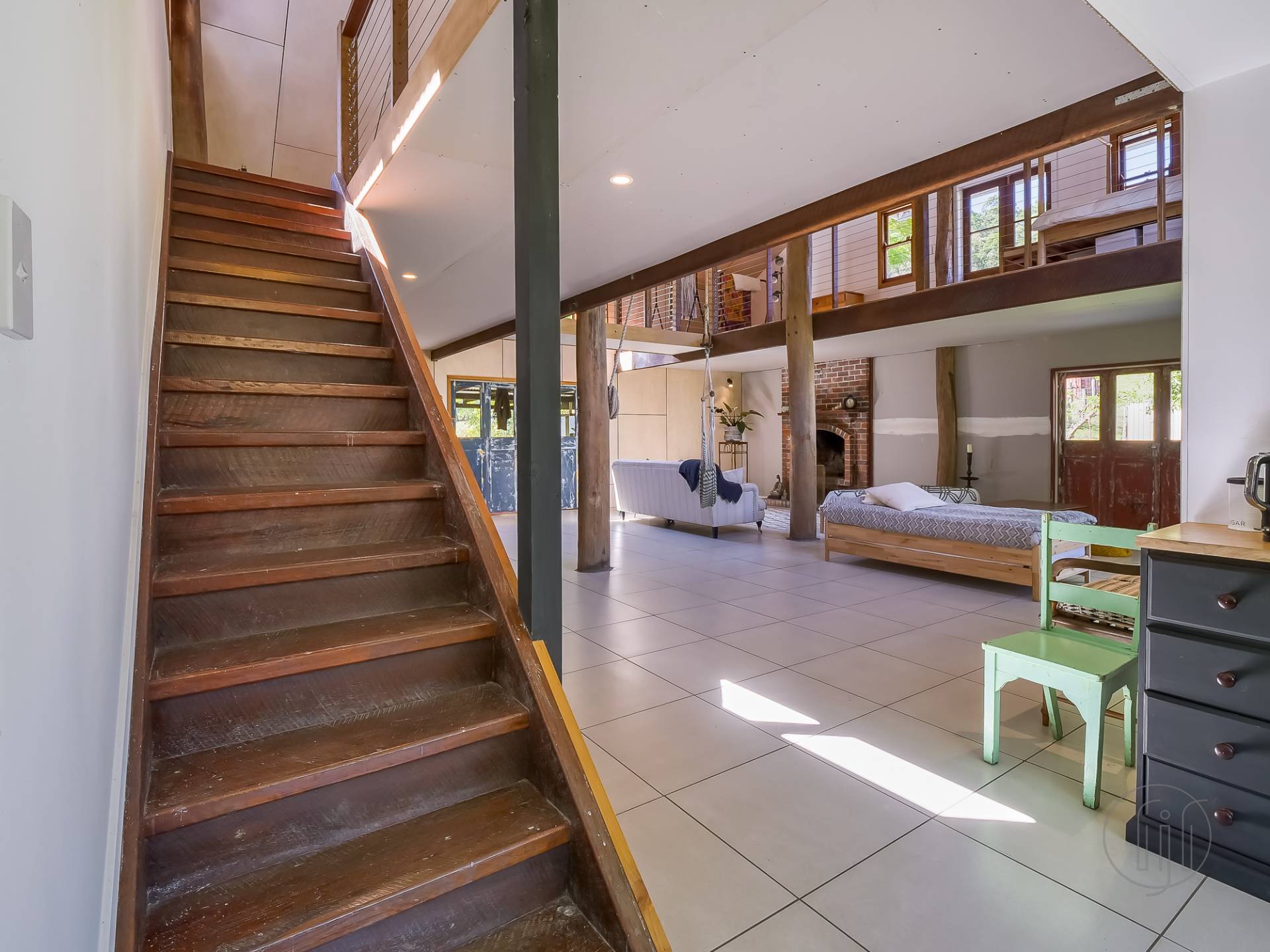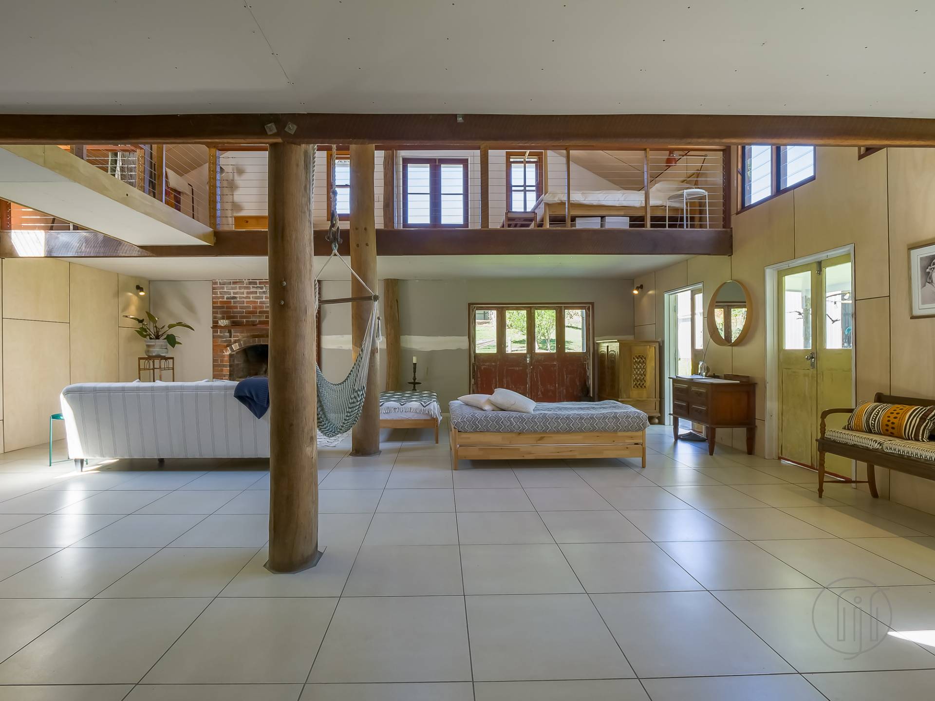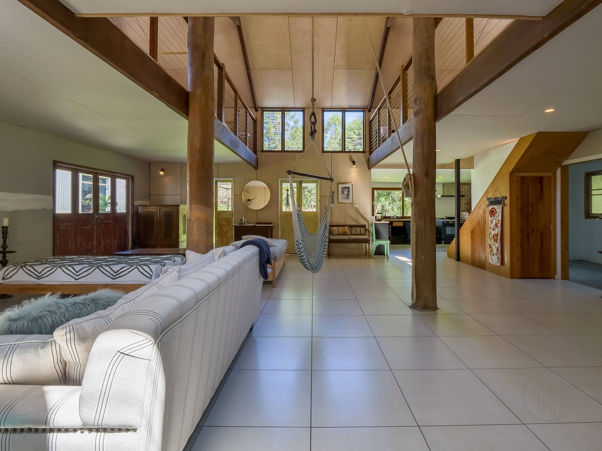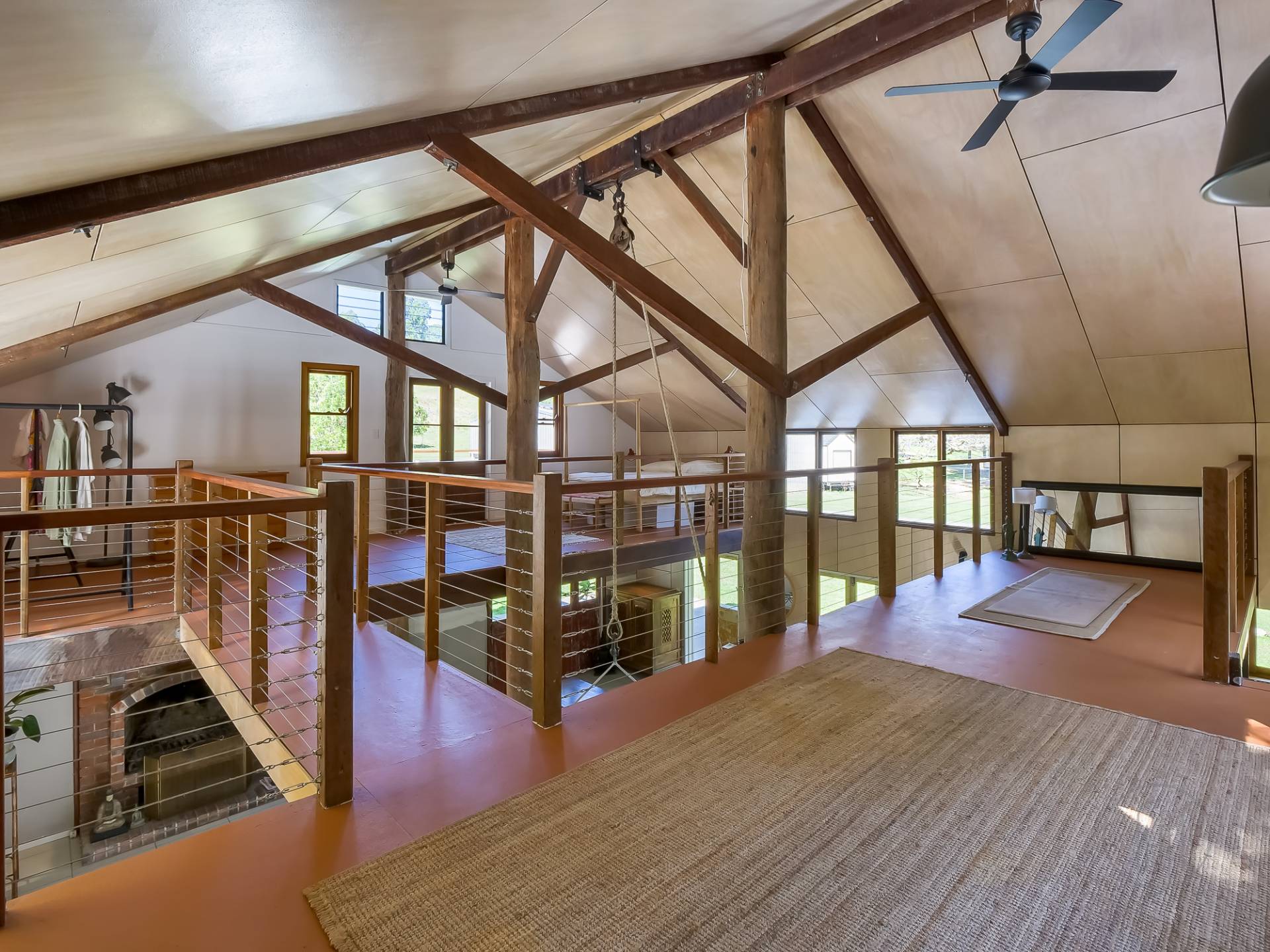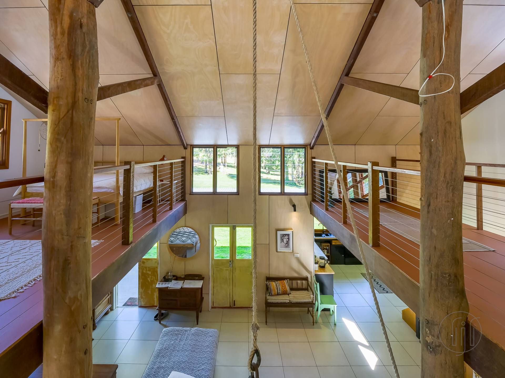 The main house, transformed by the current owners, is awesome! Externally, it’s a white-painted, timber-clad home with an L-shaped front veranda. Entry to the inside, via antique-look French doors, is straight into an open plan living area where the features are immediately on display: vaulted ceilings that span two floors, large round poles, tiled floors and an open fireplace ... plus a centrally located swing!