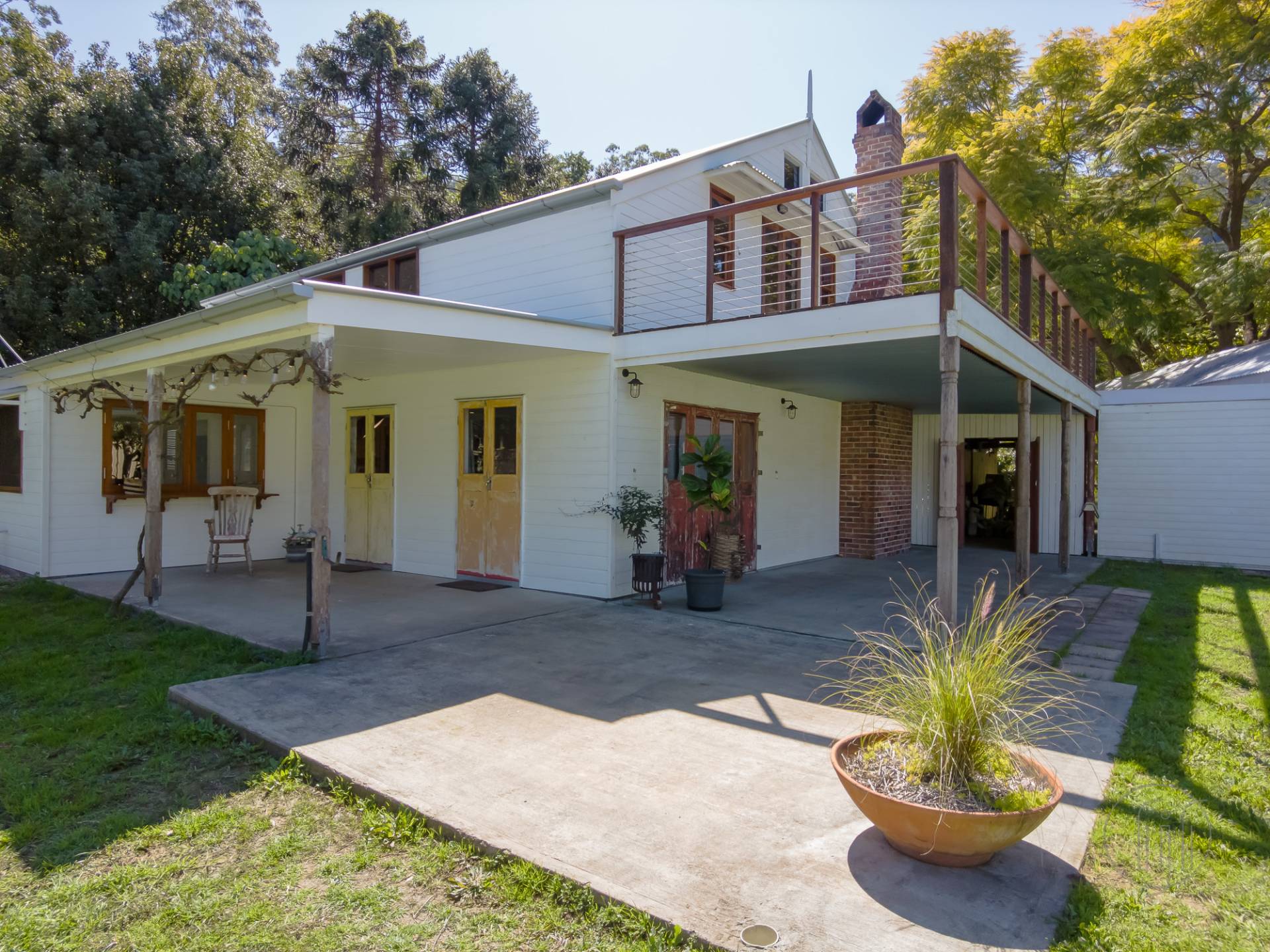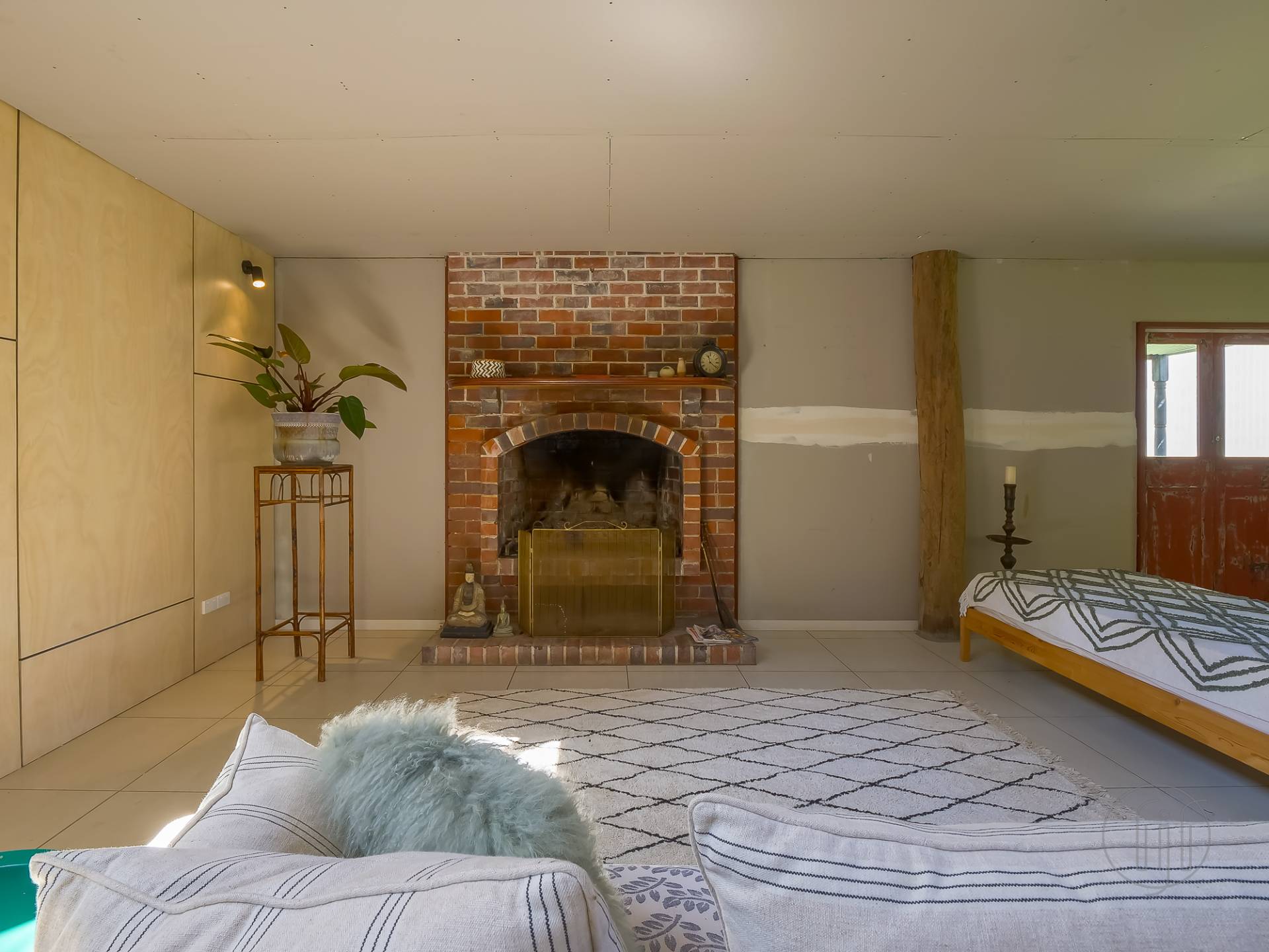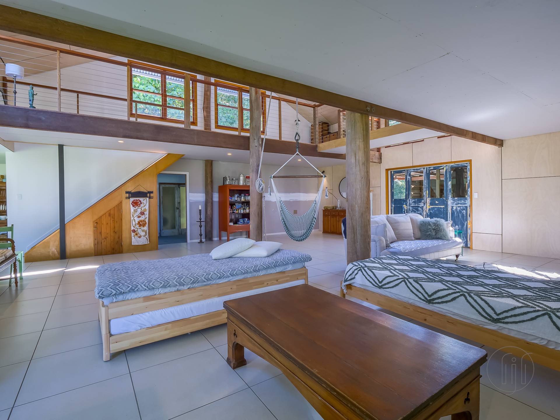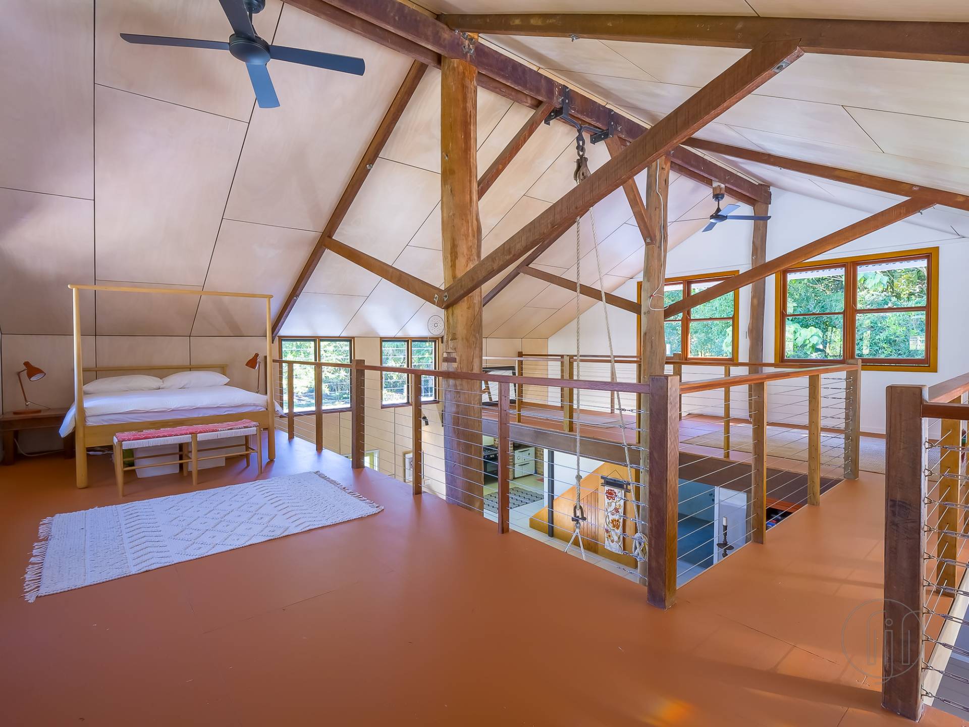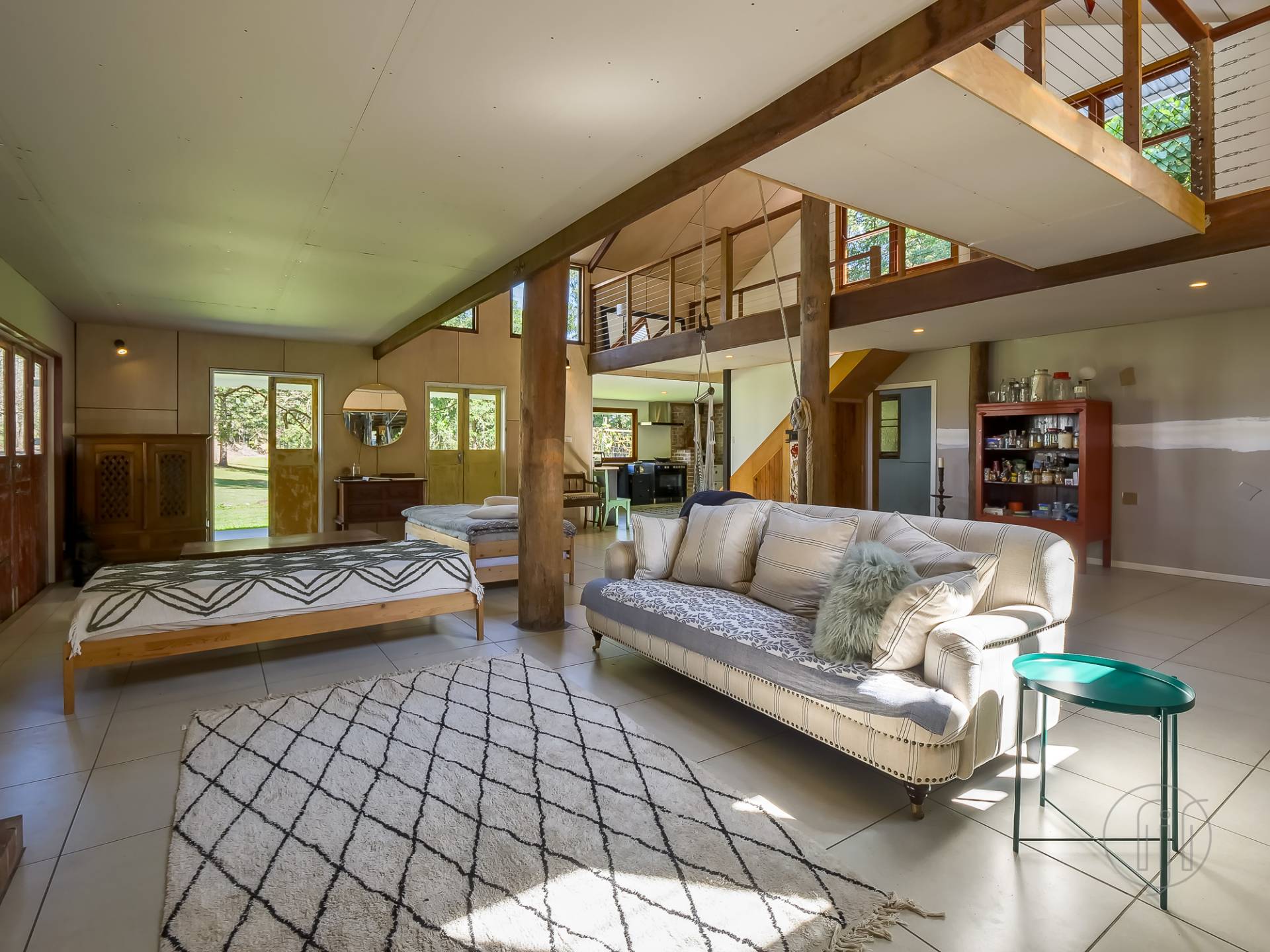 The main house, transformed by the current owners, is awesome! Externally, it’s a white-painted, timber-clad home with an L-shaped front veranda. Entry to the inside, via antique-look French doors, is straight into an open plan living area where the features are immediately on display: vaulted ceilings that span two floors, large round poles, tiled floors and an open fireplace ... plus a centrally located swing!