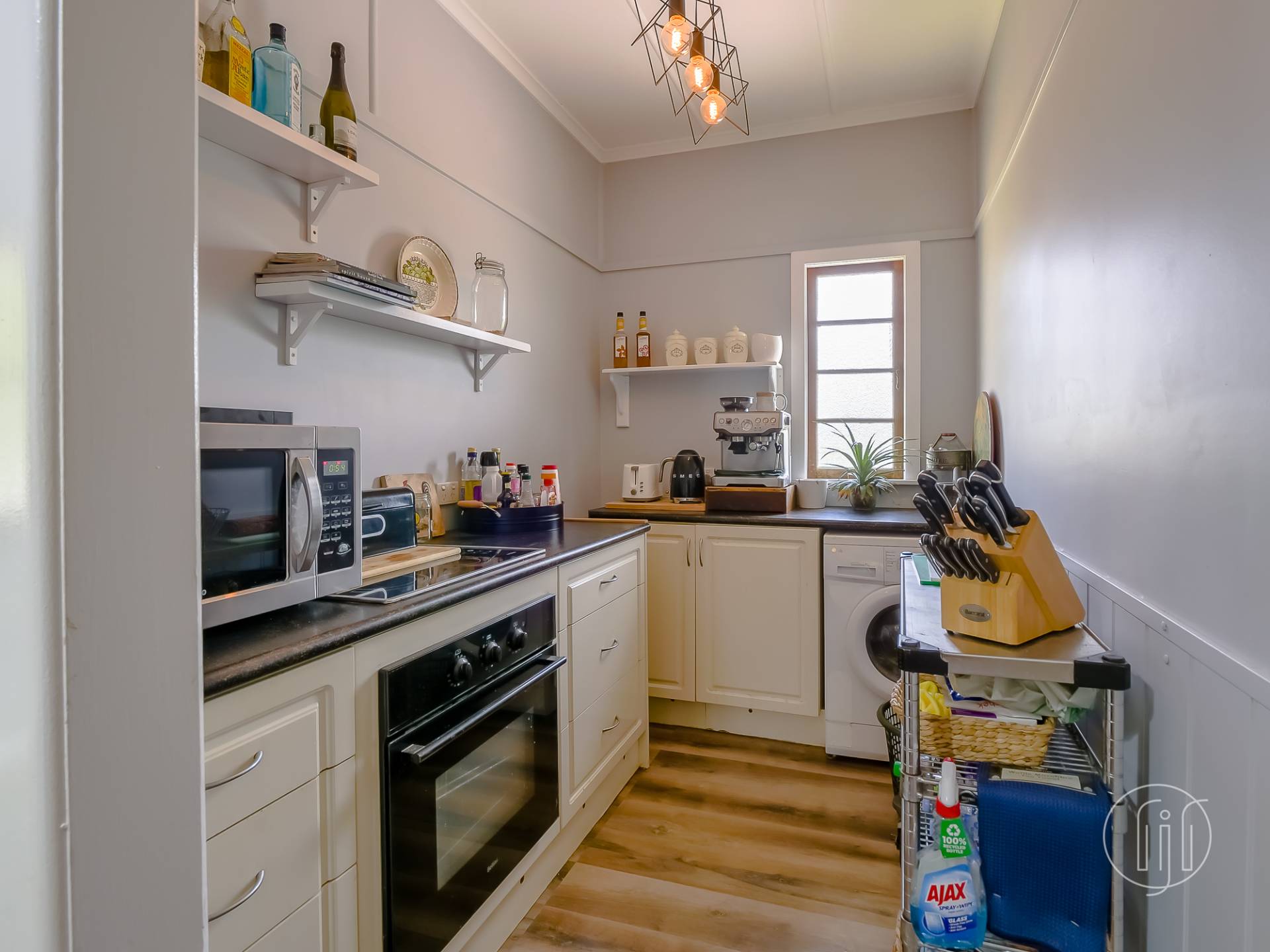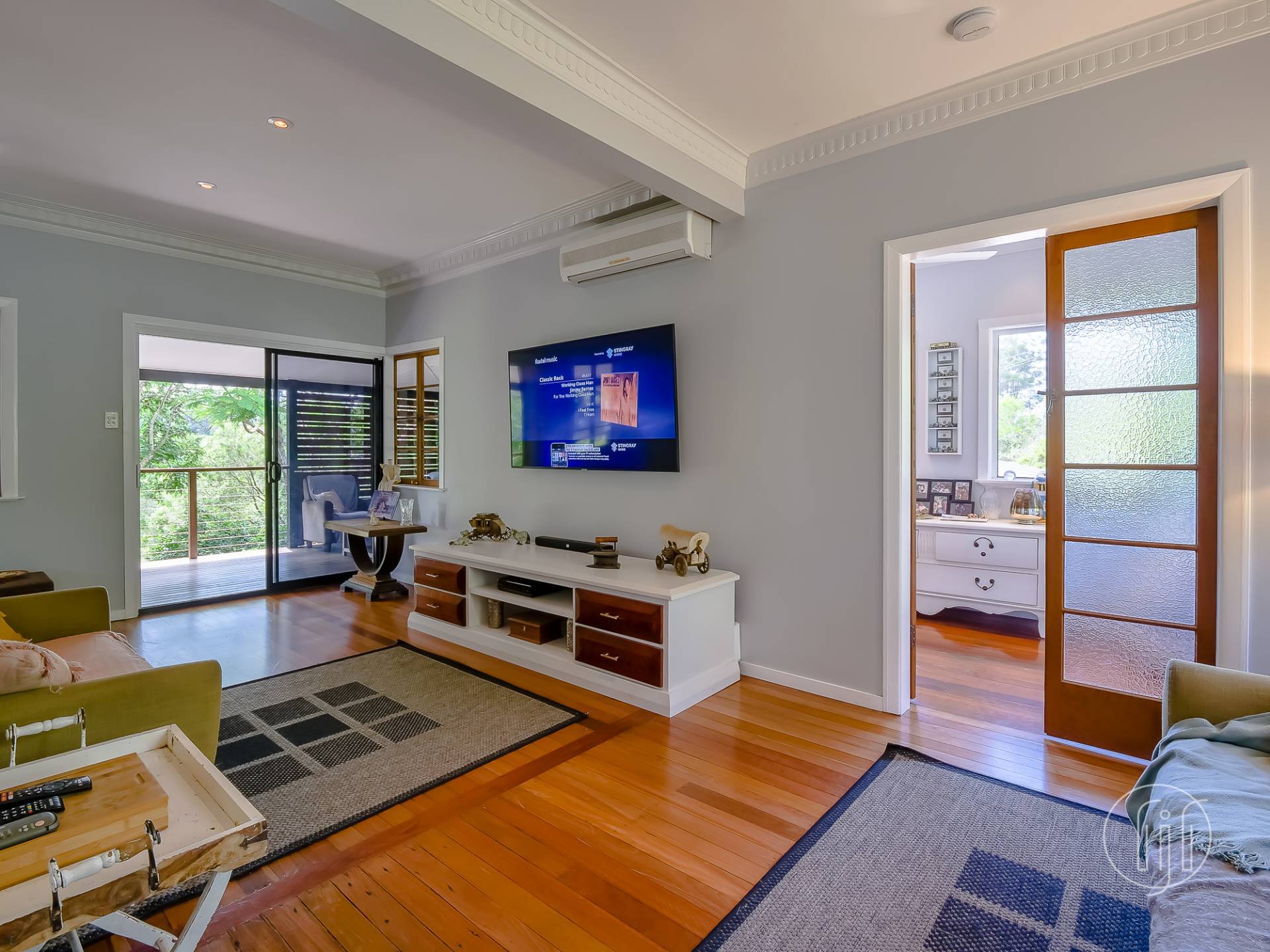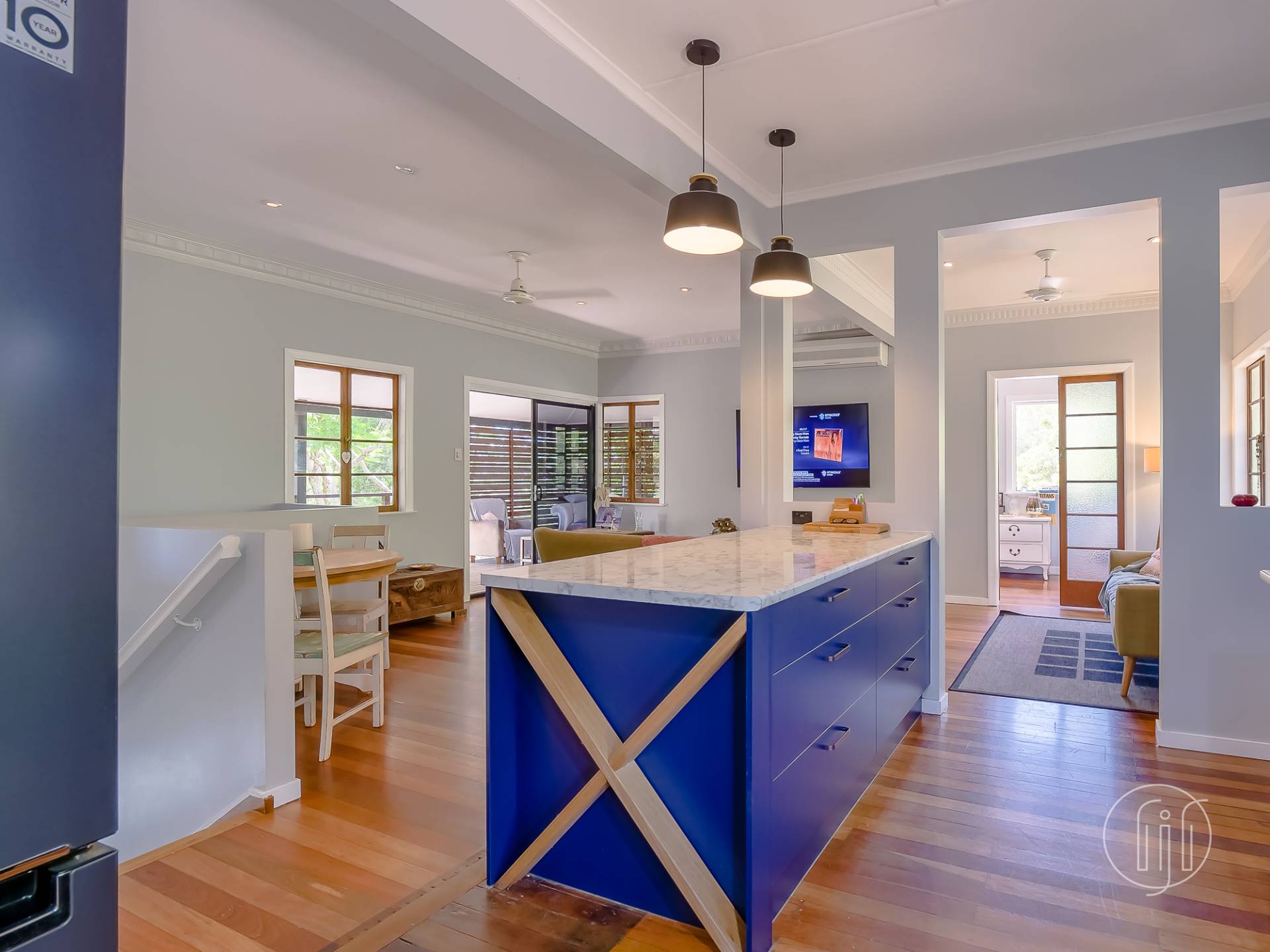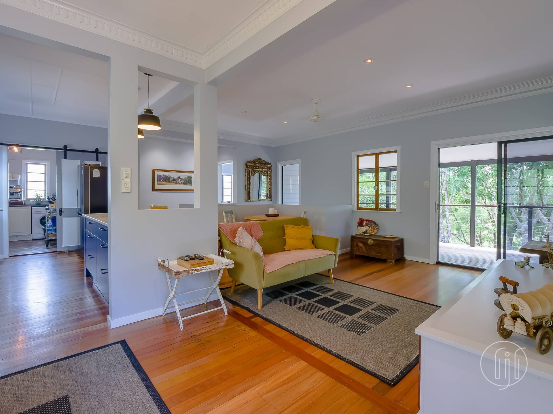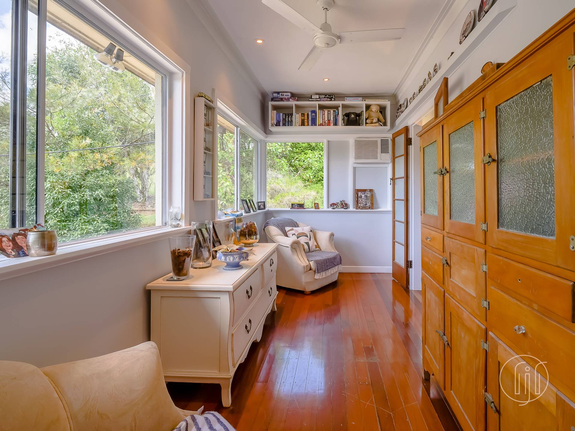 Upstairs, in the old Queenslander, it’s open plan living that takes in the lounge, dining & kitchen. This level has polished timber floors, high ceilings and ornate cornices. The galley kitchen has a distinctive colour & style and is well-appointed with gas cooking, dishwasher and a butler’s pantry. It is separated from the dining area by a breakfast bar. The air-conditioned living area is complimented by a small sitting/reading room and the wide full-length covered deck with a northerly view over the dam.