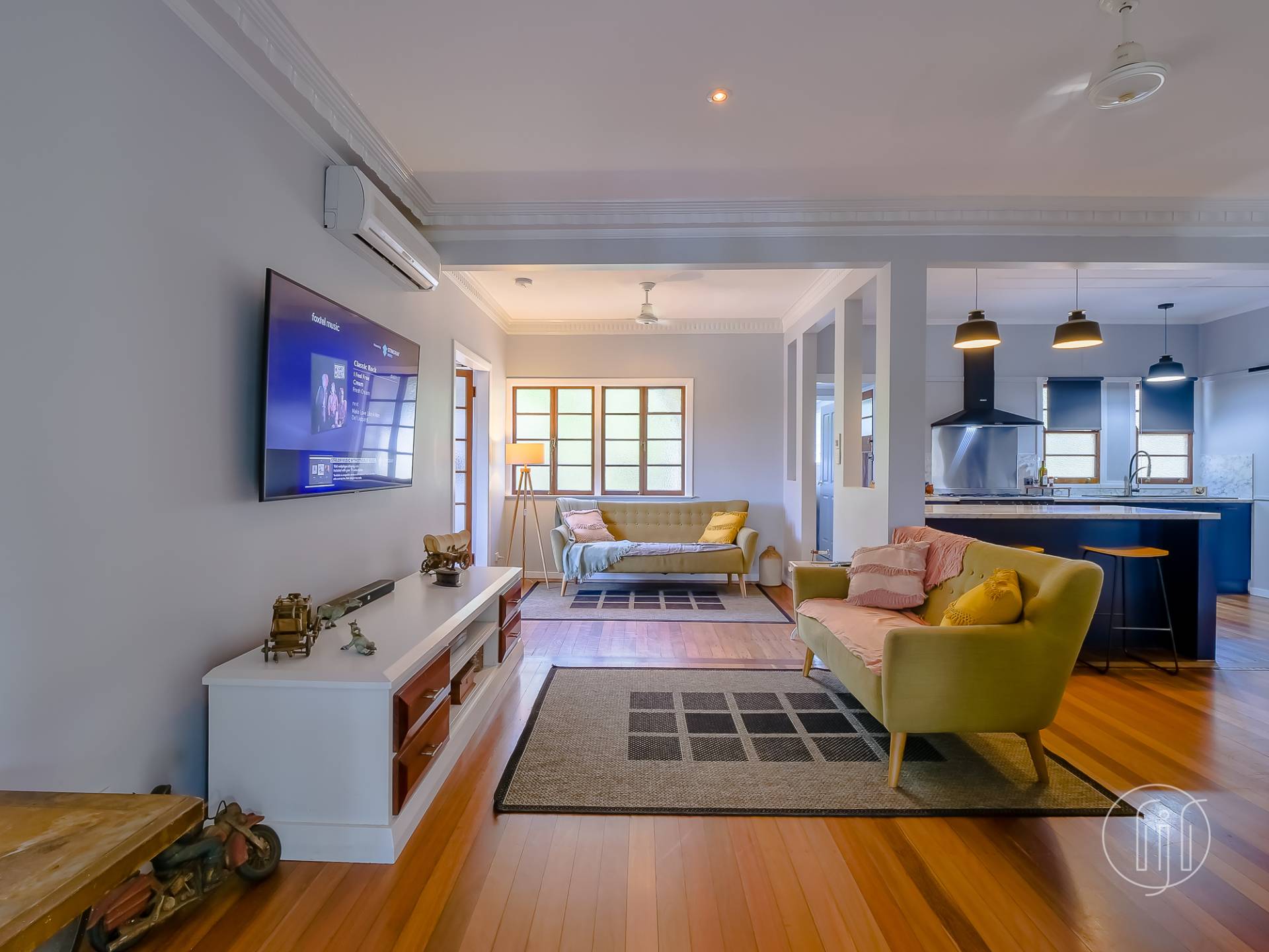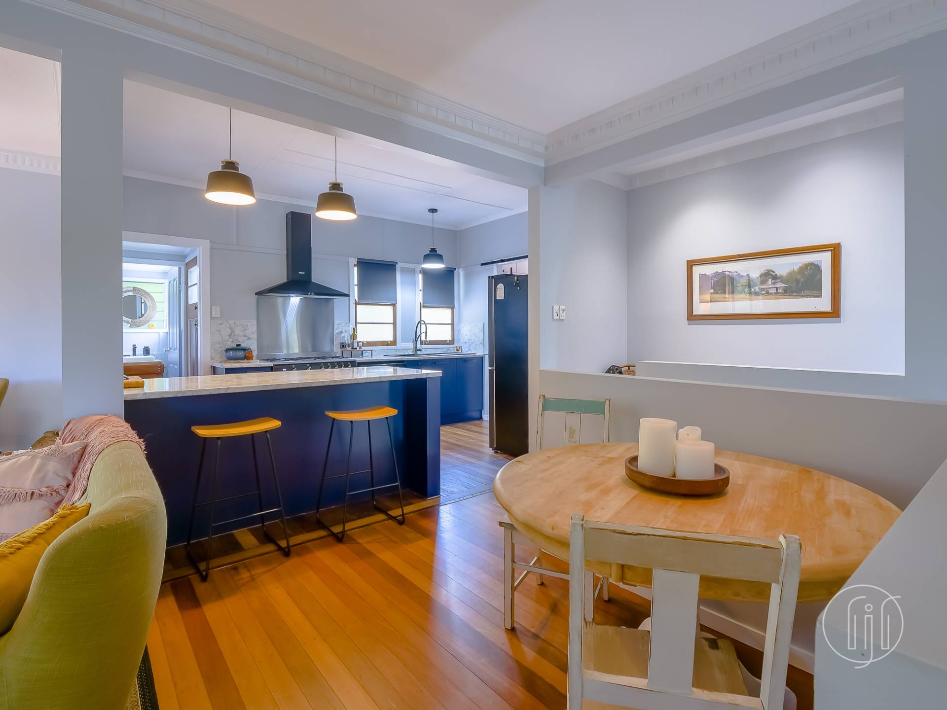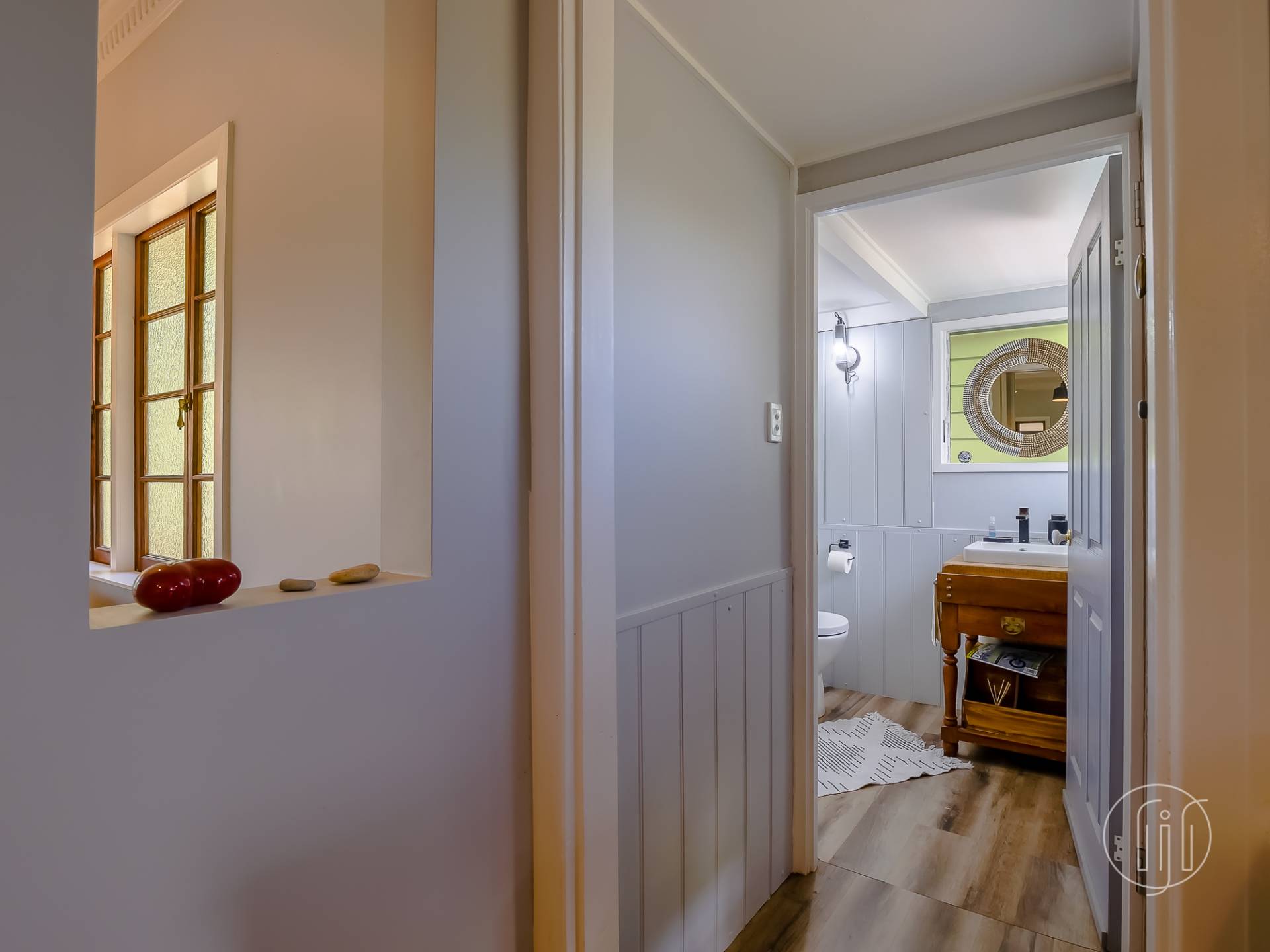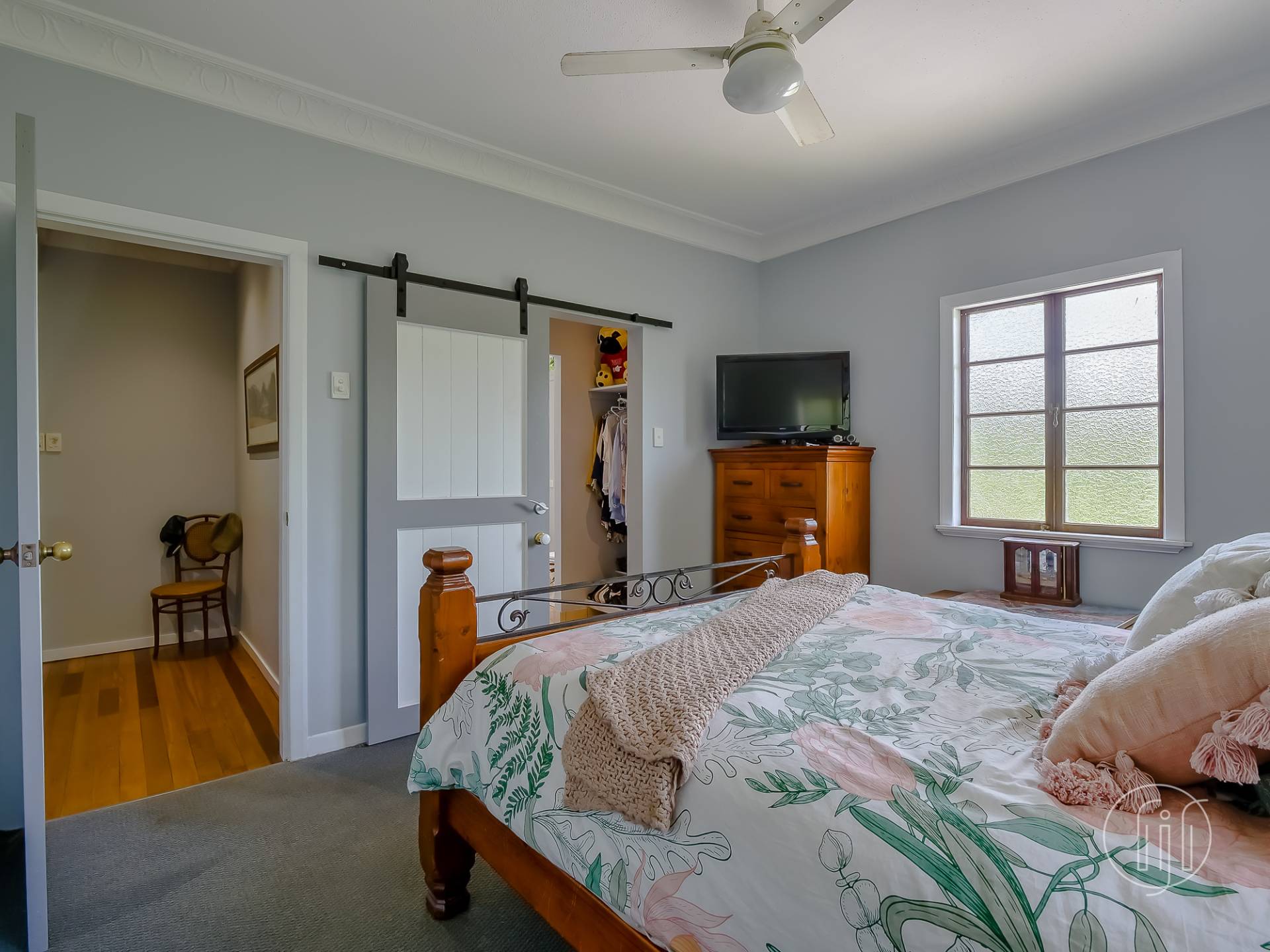 Upstairs, in the old Queenslander, it’s open plan living that takes in the lounge, dining & kitchen. This level has polished timber floors, high ceilings and ornate cornices. The galley kitchen has a distinctive colour & style and is well-appointed with gas cooking, dishwasher and a butler’s pantry. It is separated from the dining area by a breakfast bar. The air-conditioned living area is complimented by a small sitting/reading room and the wide full-length covered deck with a northerly view over the dam.