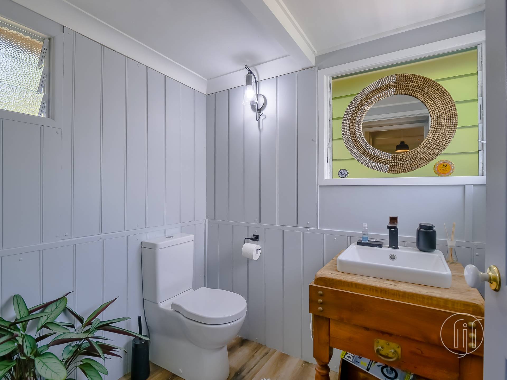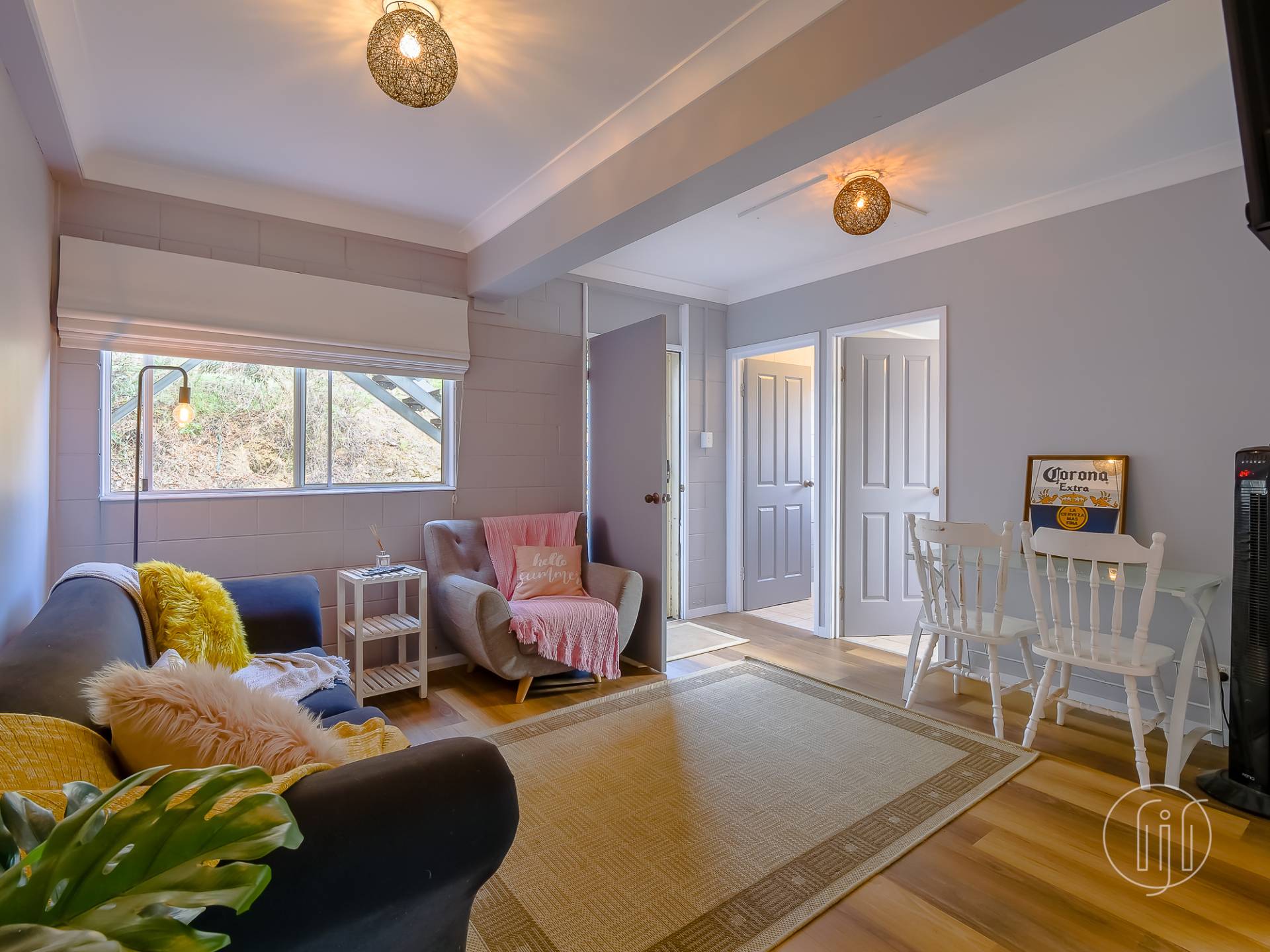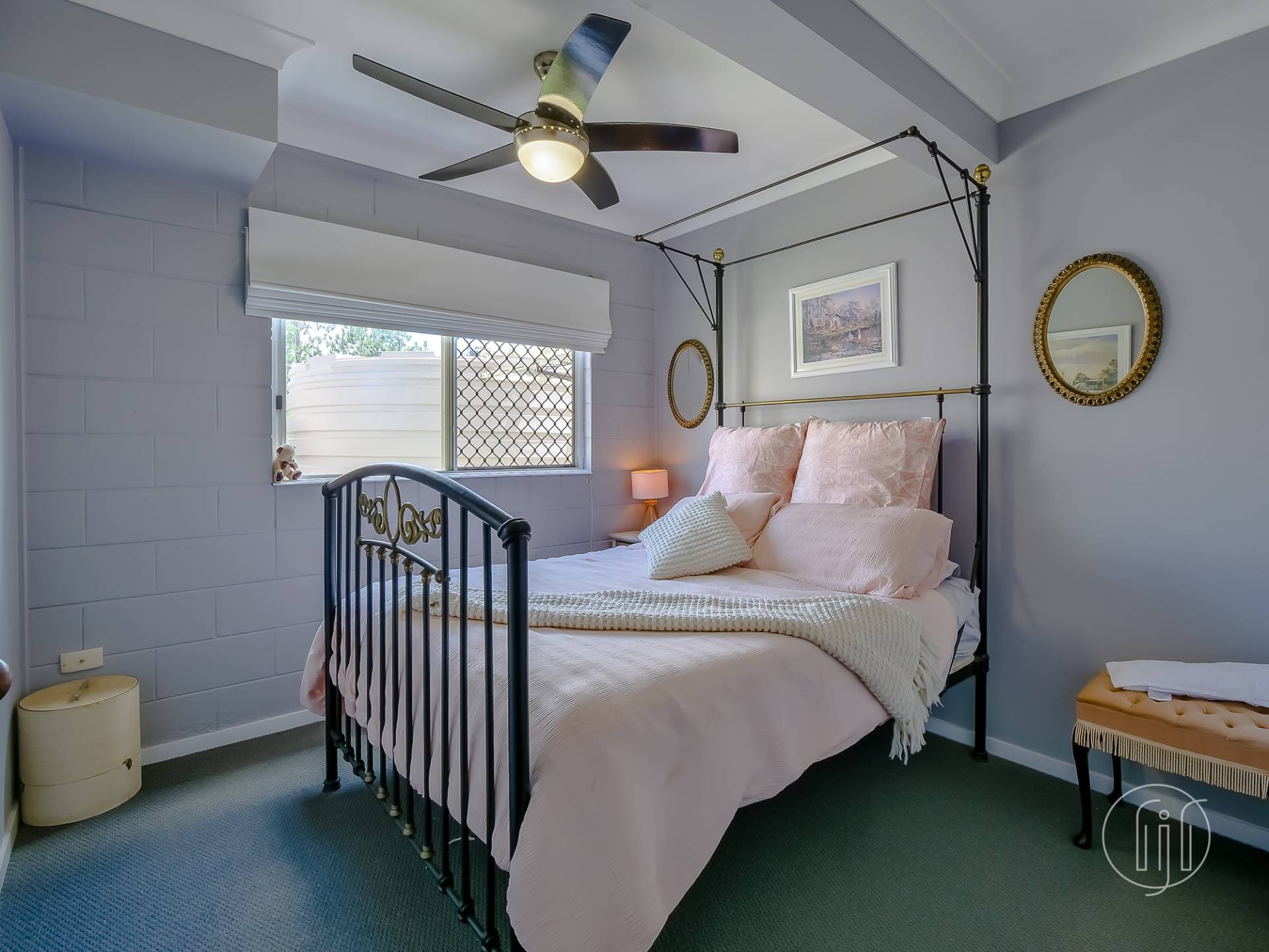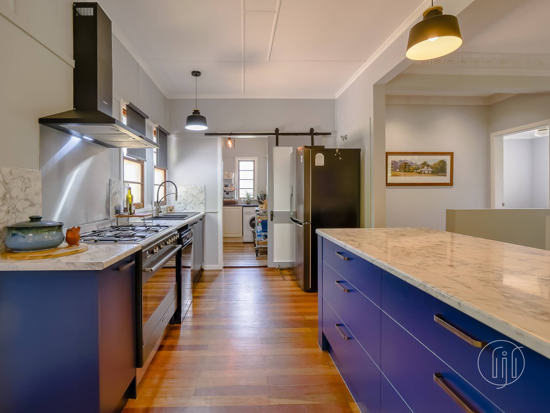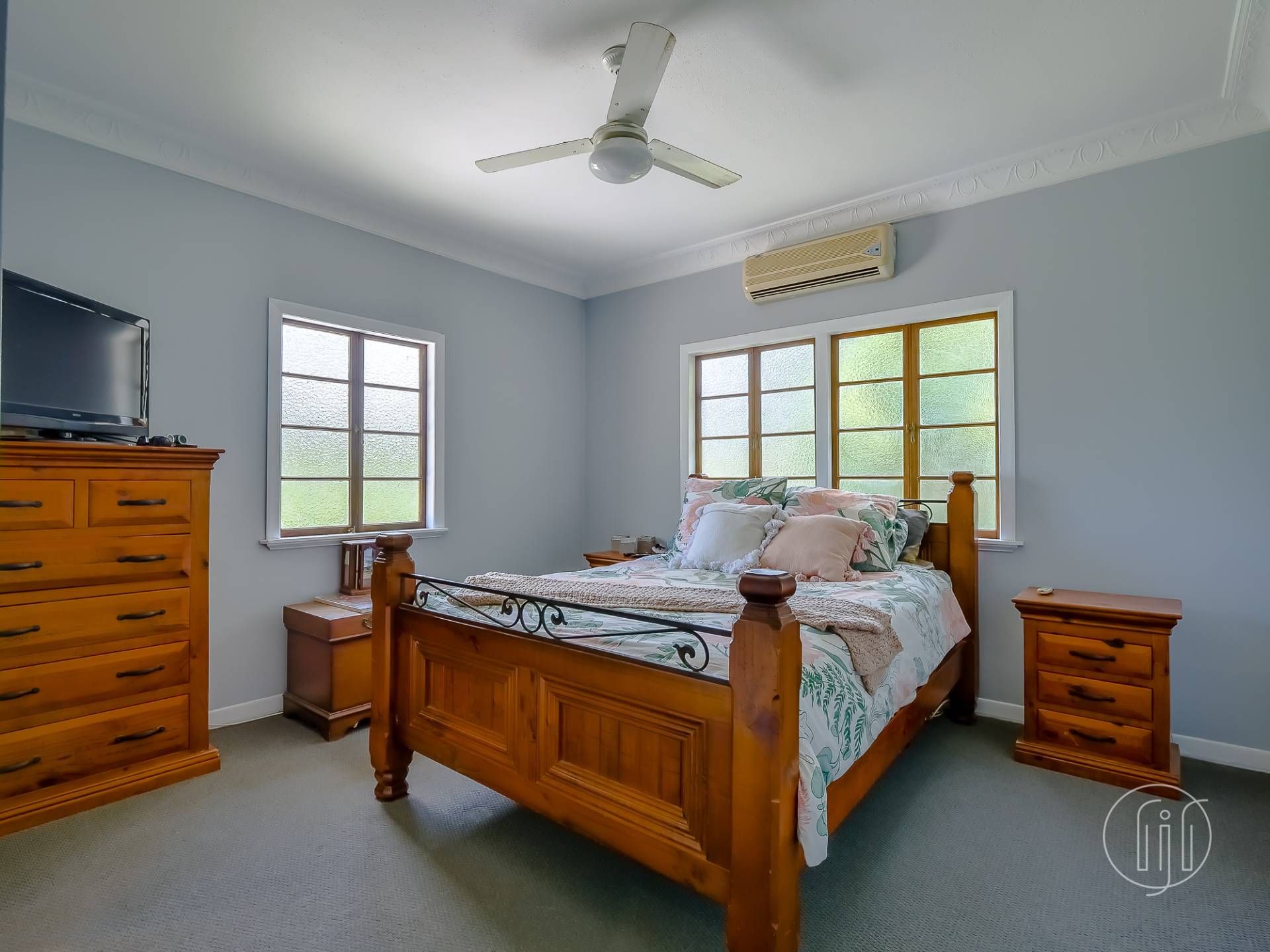Upstairs, in the old Queenslander, it’s open plan living that takes in the lounge, dining & kitchen. This level has polished timber floors, high ceilings and ornate cornices. The galley kitchen has a distinctive colour & style and is well-appointed with gas cooking, dishwasher and a butler’s pantry. It is separated from the dining area by a breakfast bar. The air-conditioned living area is complimented by a small sitting/reading room and the wide full-length covered deck with a northerly view over the dam.