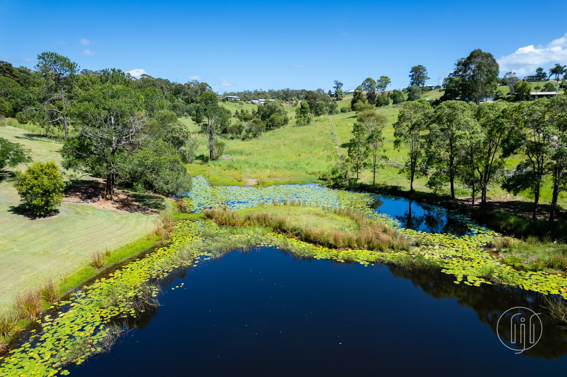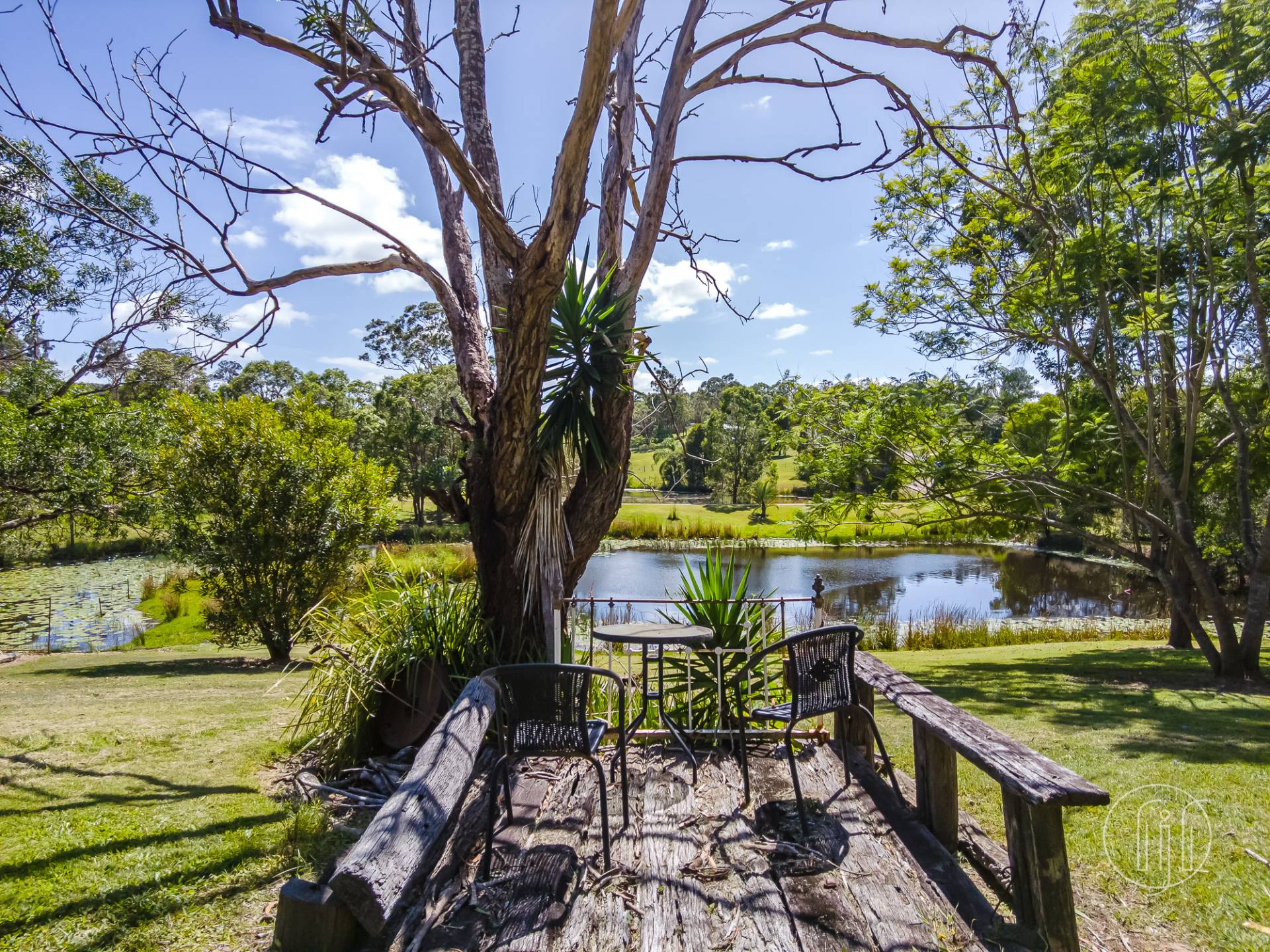 The double-storey home on this fully-fenced 5-acre (2 ha) Mothar Mountain property is set in established grounds that feature mature trees and a picturesque spring-fed dam with an island. The house is positioned for the best view!