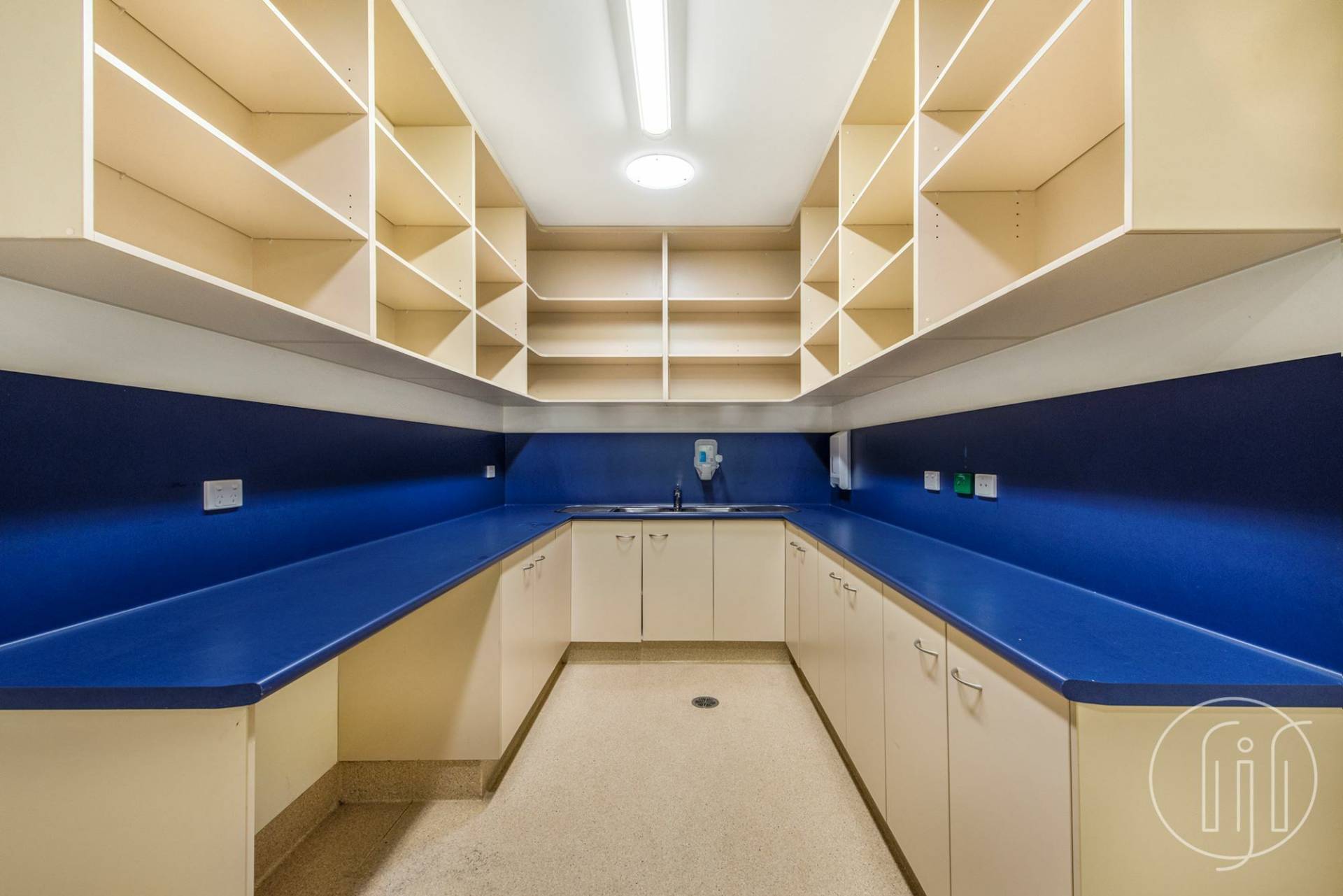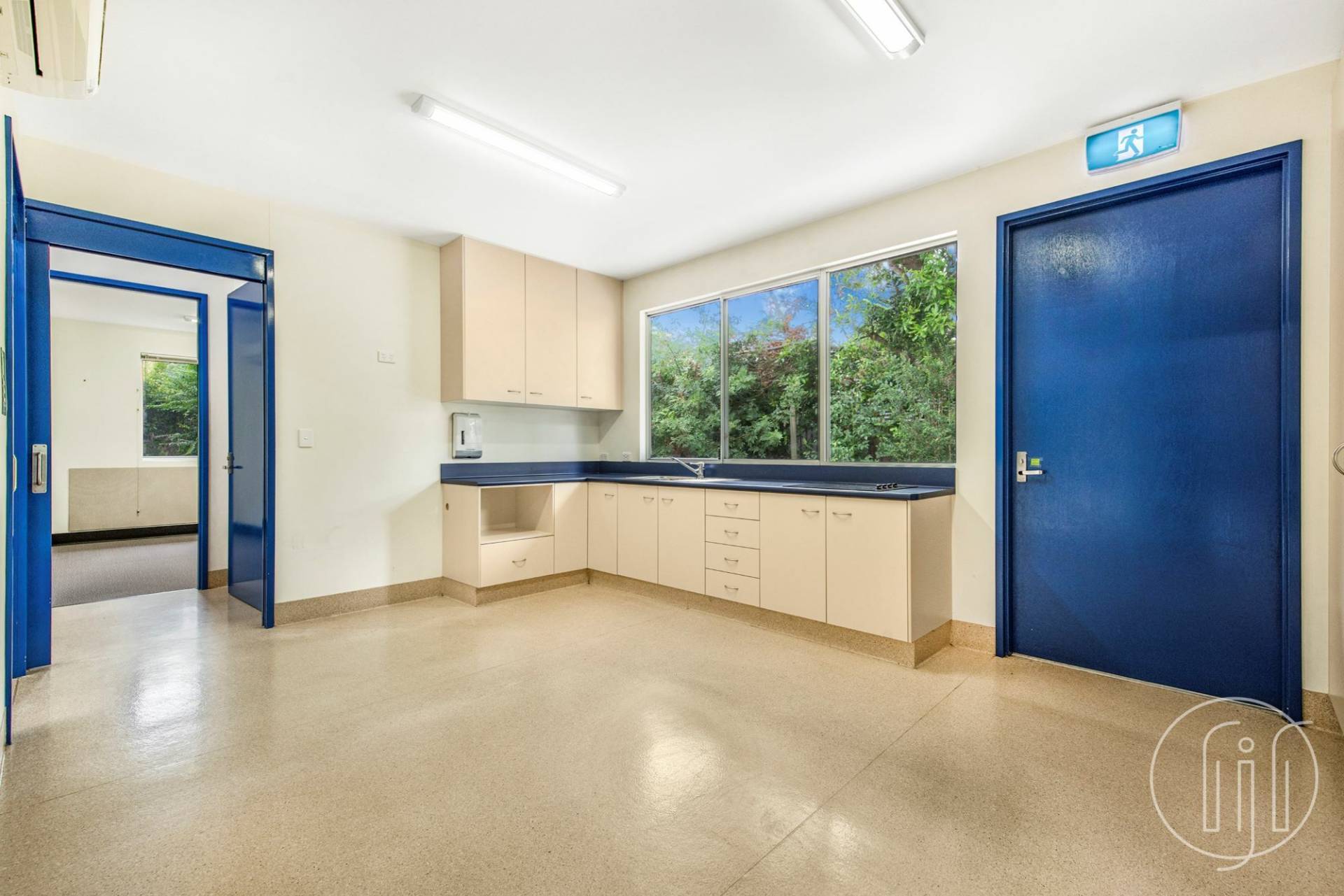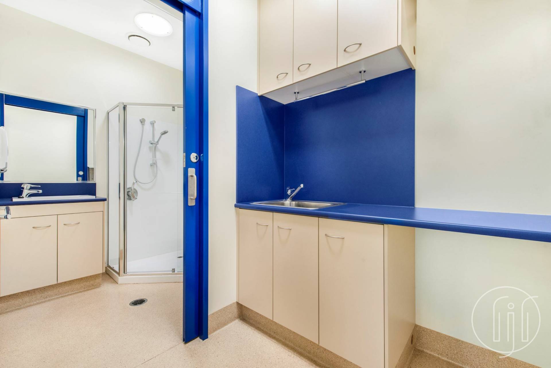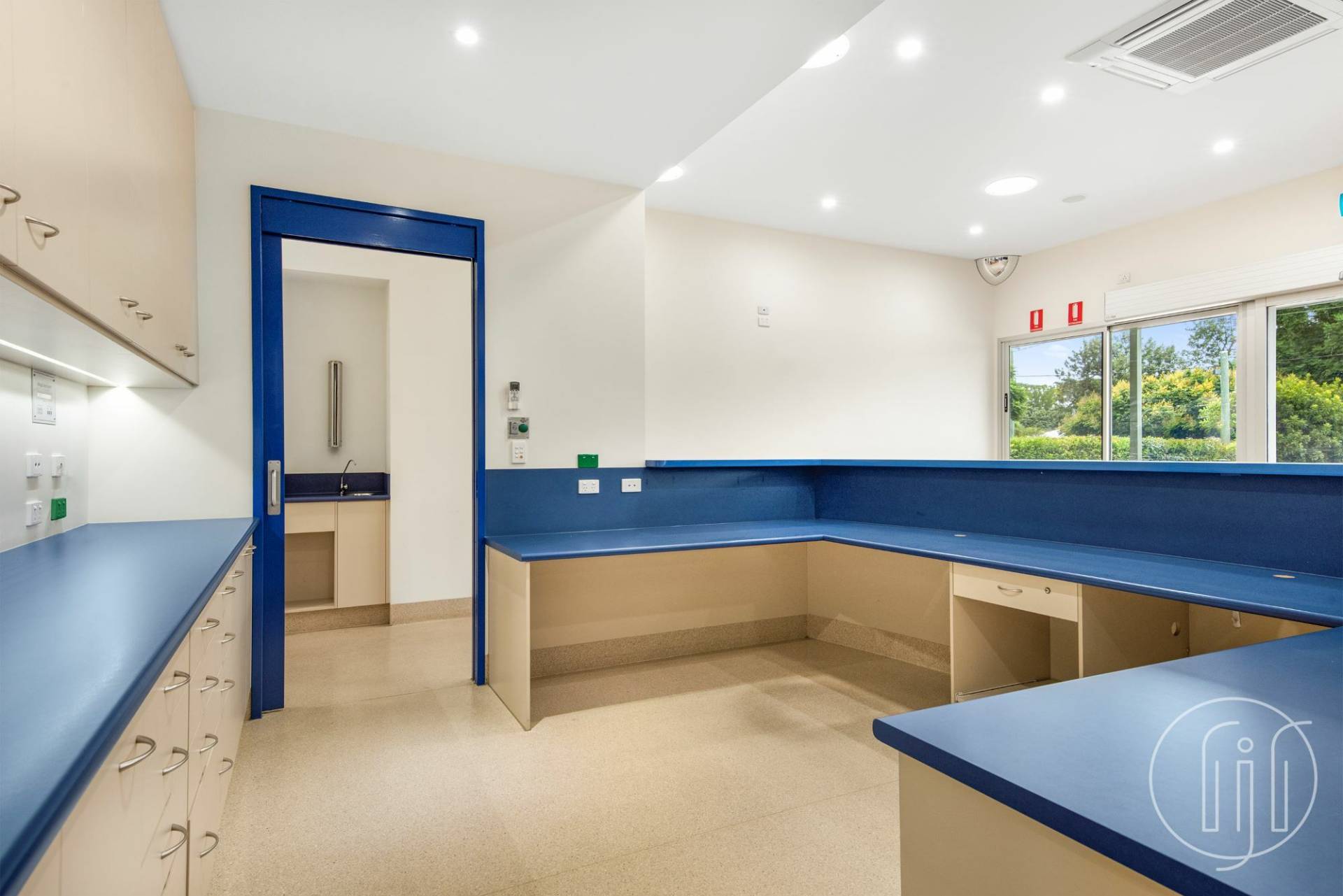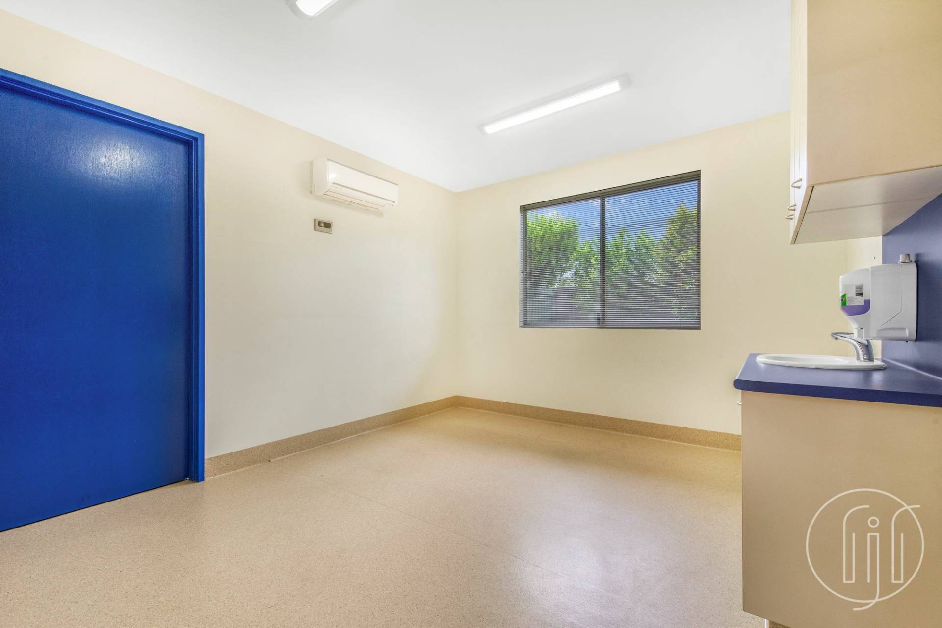 Entry is via a covered veranda and through large glass sliding doors into a well ventilated and open planned waiting room & reception space. The reception area allows for several people to work together with well-designed shelving and storage behind.