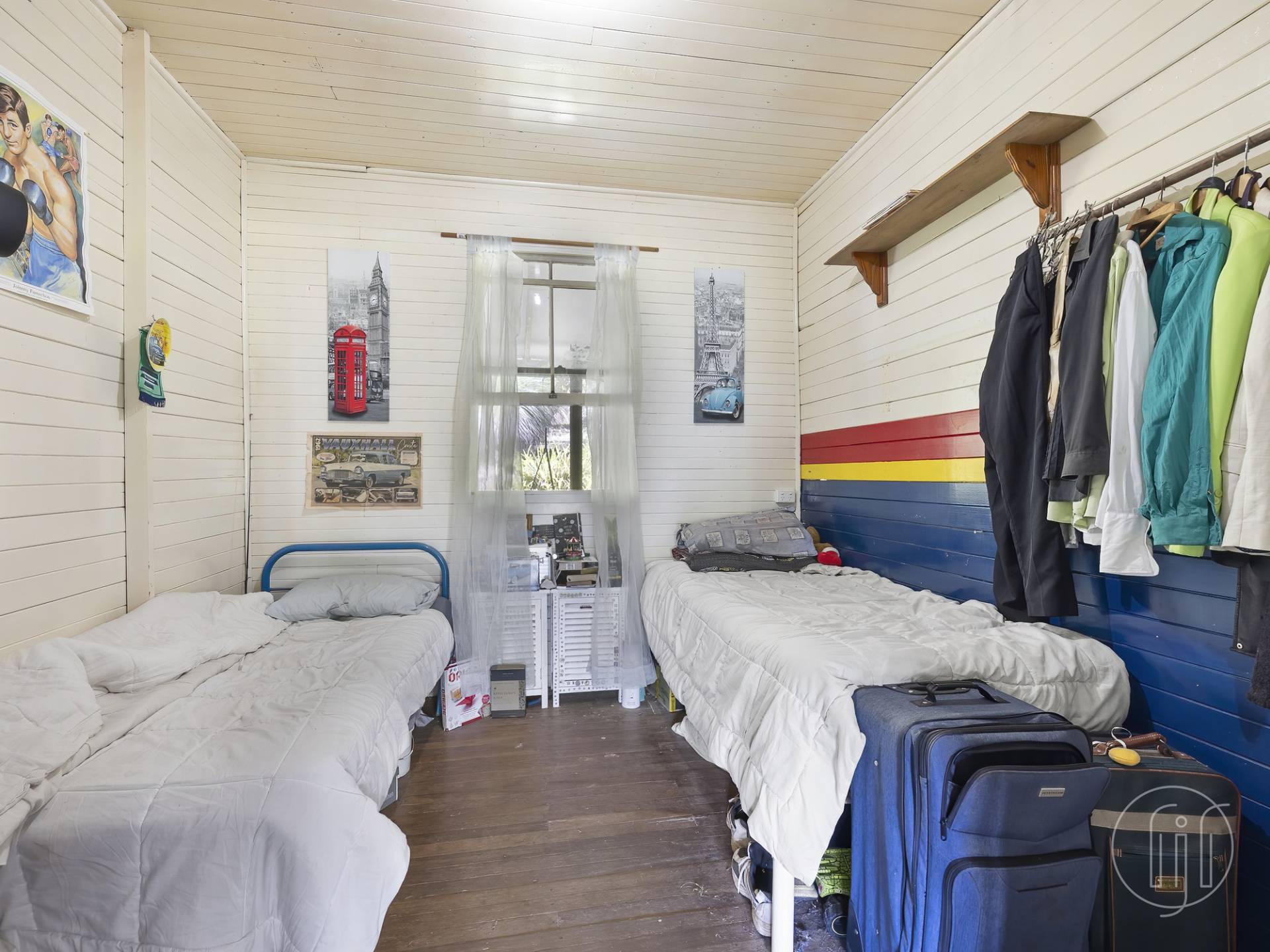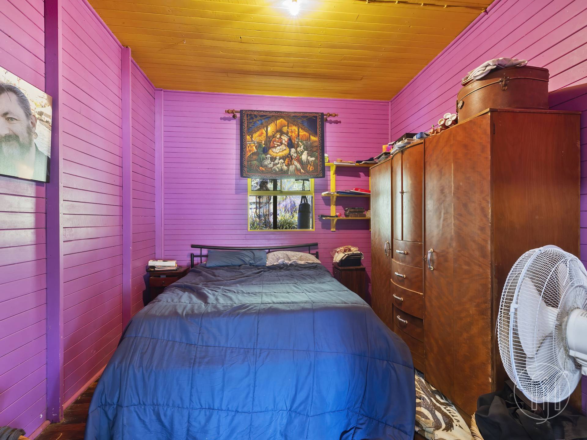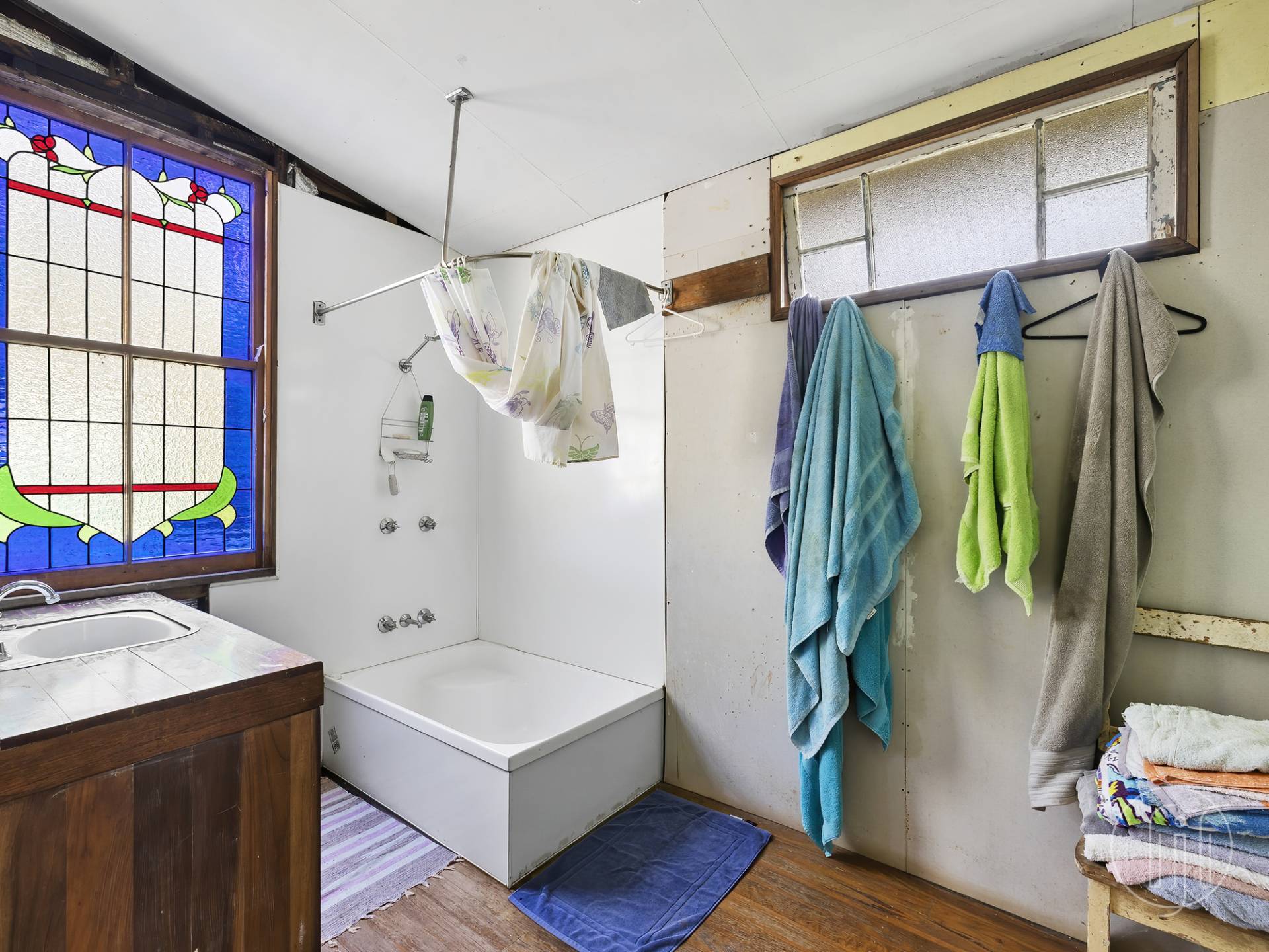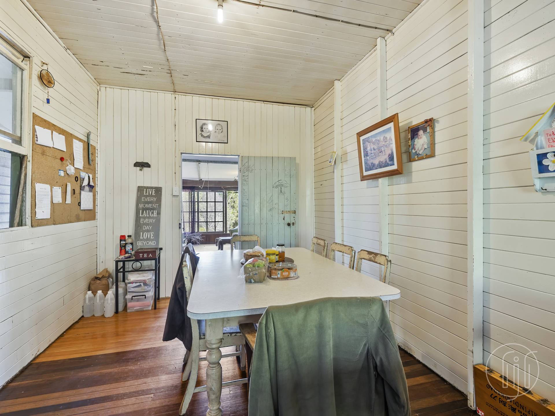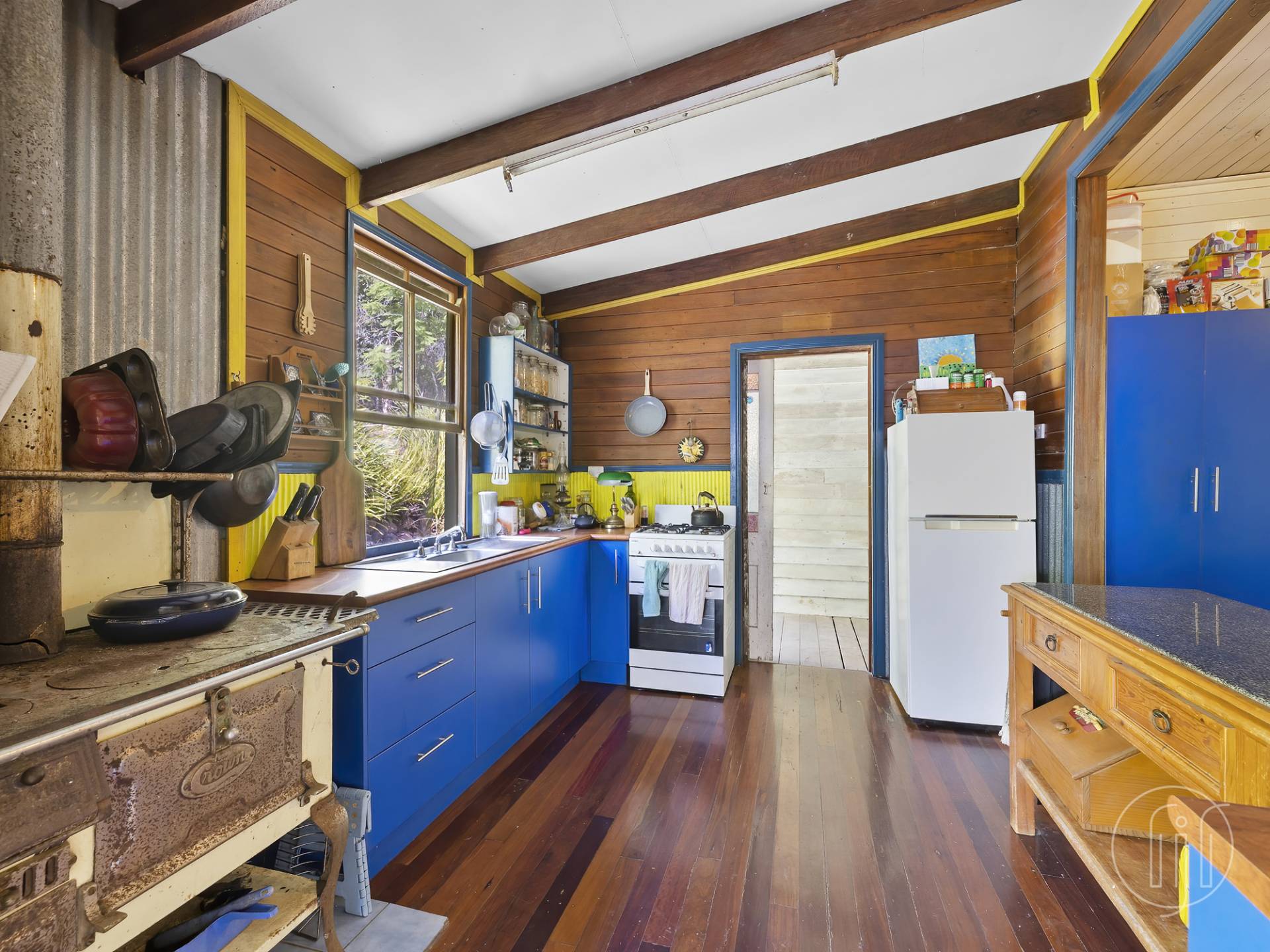 The kitchen is tucked away at the back of the home and is an open planned space with the dining room. There is a freestanding gas cooker, wood burner stove, feature corrugated walls and an island bench for additional cupboard storage.  You can access outside from either side of the kitchen - the left-hand side leads out to a second covered deck and the right-hand side to the covered breezeway.