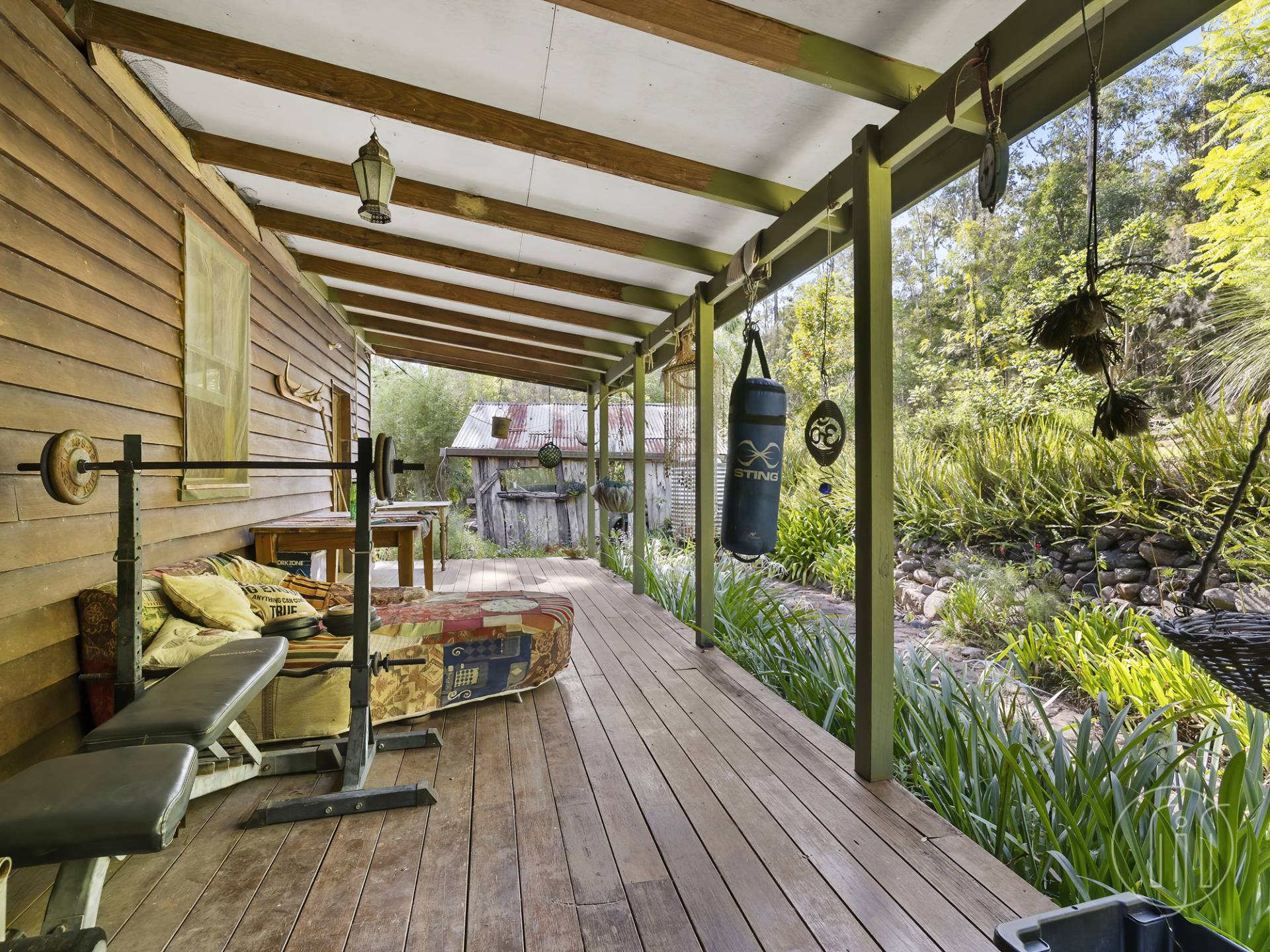 There is a separate Colourbond double garage, water tank and small dam, plus the creek flowing through the base of the property.  An older style timber carport housing the generator and solar system complete the scene.