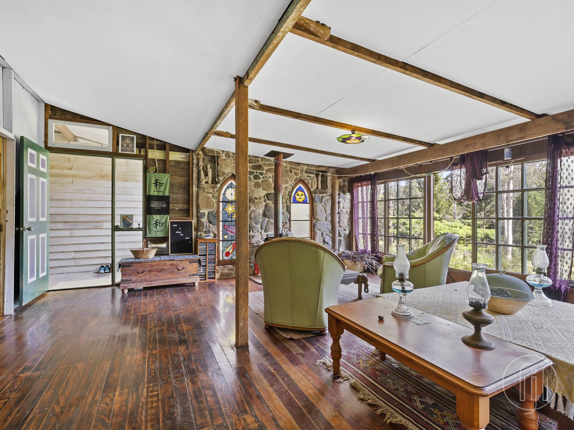 Inside, the lounge room is cosy and has numerous features to take in – big French windows, timber floors, and an amazing stone wall behind the slow combustion fireplace, with beautiful leadlight windows.