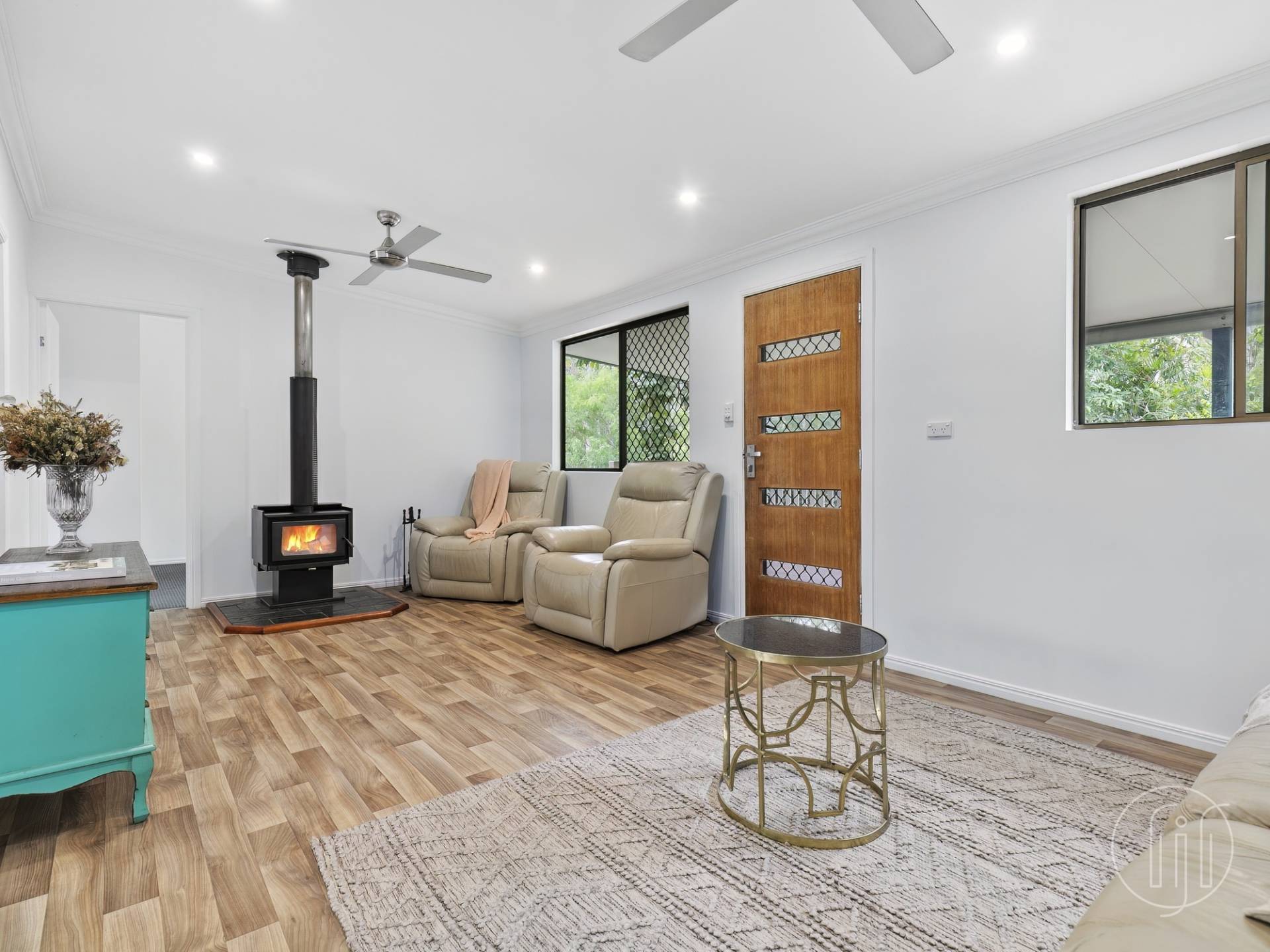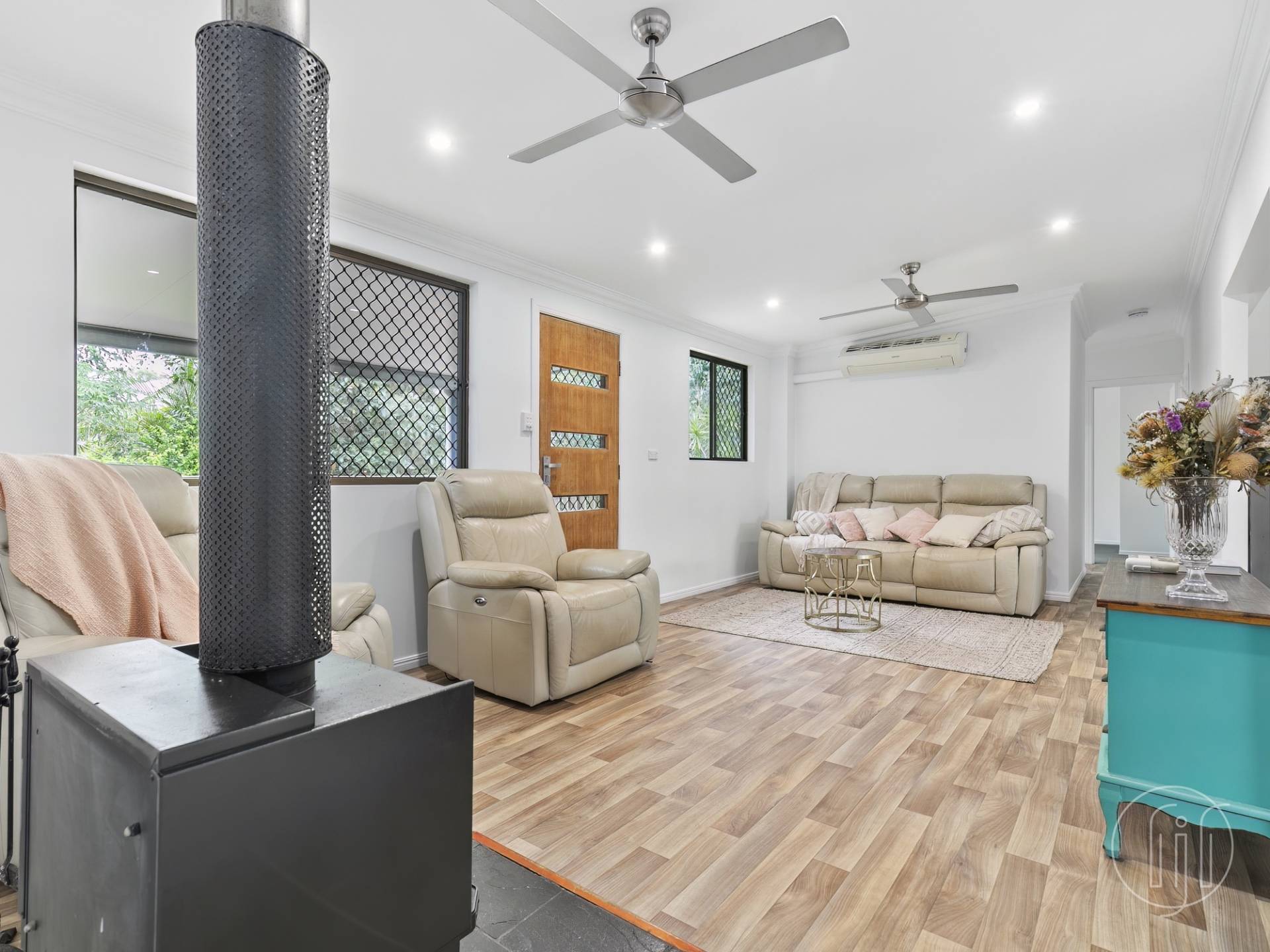 Once inside, the open planned lounge room has big windows, air conditioning and a separate slow combustion fireplace. The timber look vinyl floor coverings run throughout the living, dining and kitchen areas and give the home a modern feel.