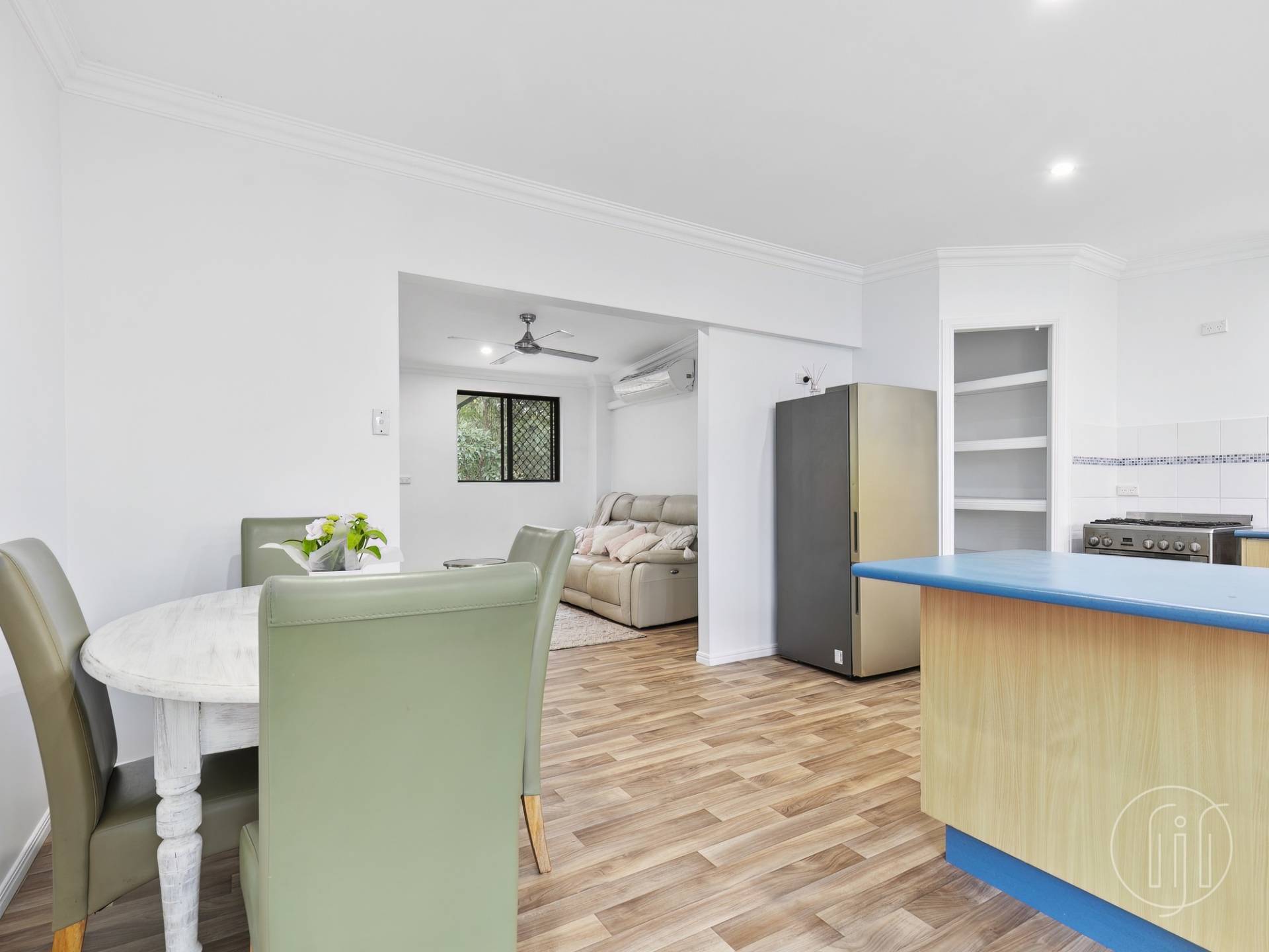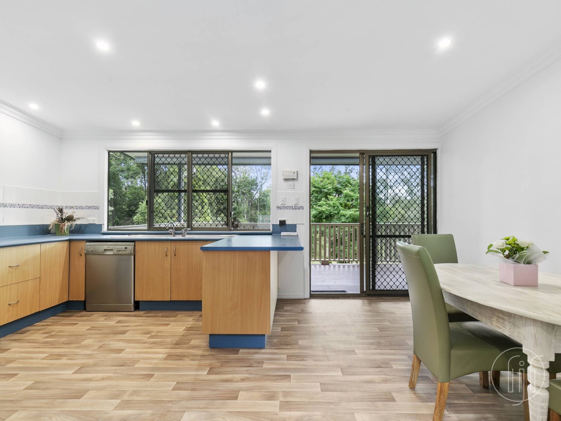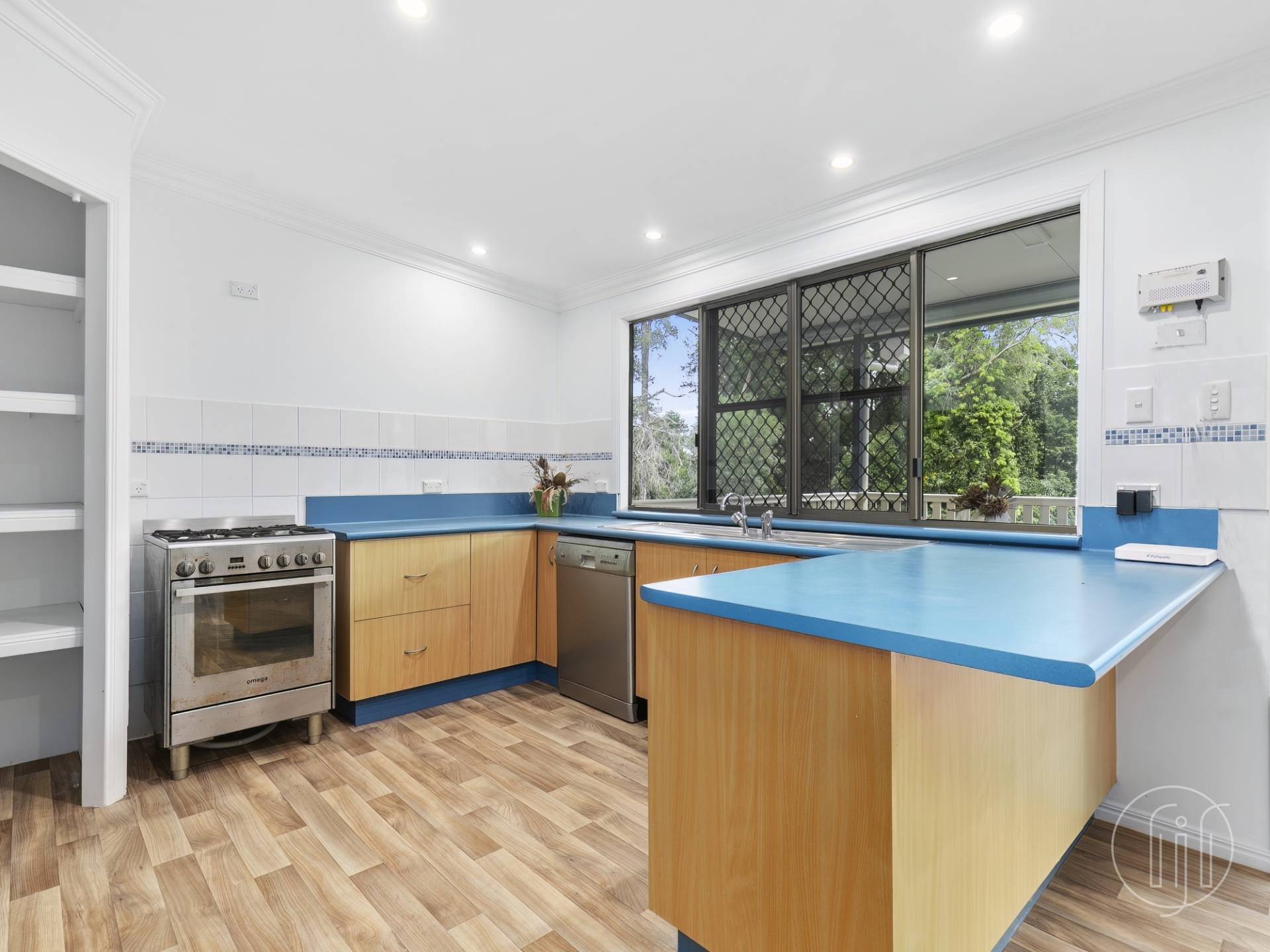 The kitchen is open planned and separated from the dining room by a breakfast bar. There is a dishwasher, ample cupboard storage plus an open style pantry, and enough space for an enormous fridge. This combined area has great light with large window and sliding doors to the rear covered veranda.