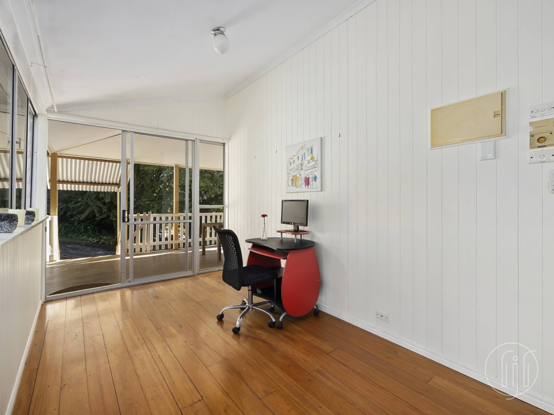 Let’s start with the commercial building to the left of the home, where a pathway leads down from the street to a wide covered veranda generous enough for relaxed seating or dining.  Access is via sliding glass doors into an open room with multiple windows, reverse cycle air conditioning and basin.
