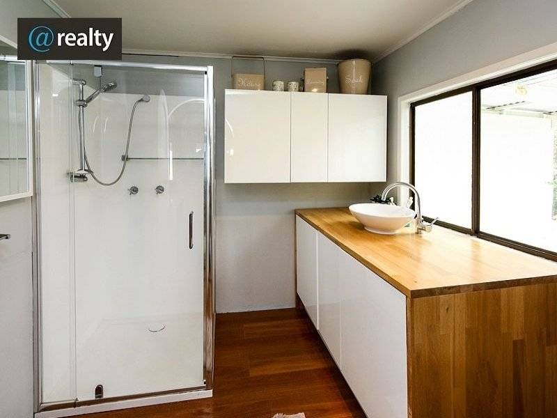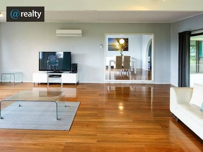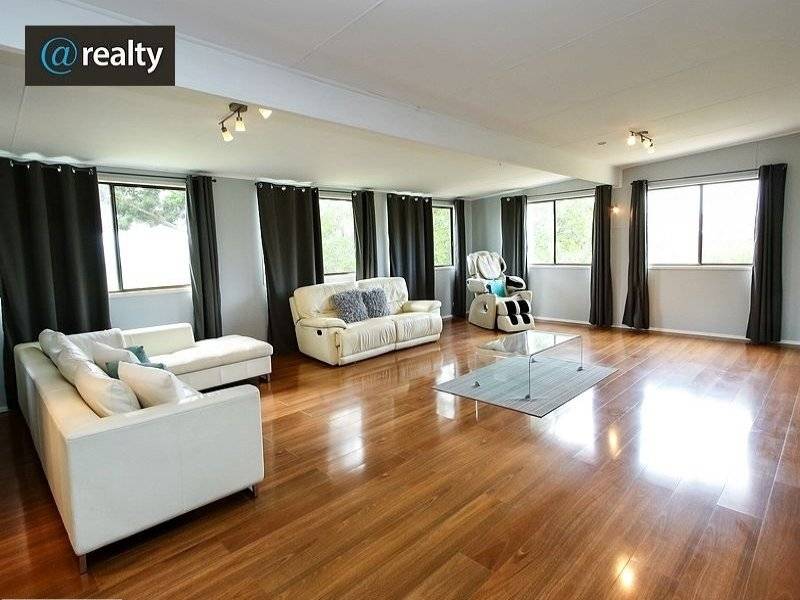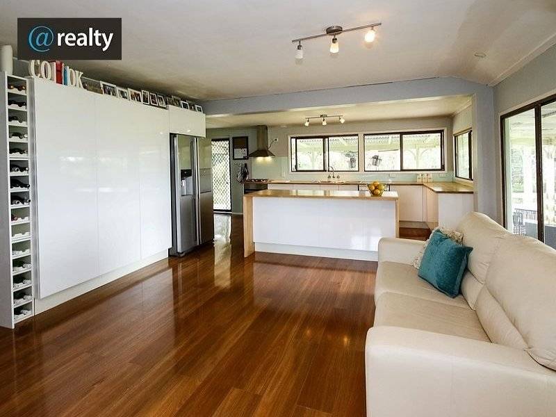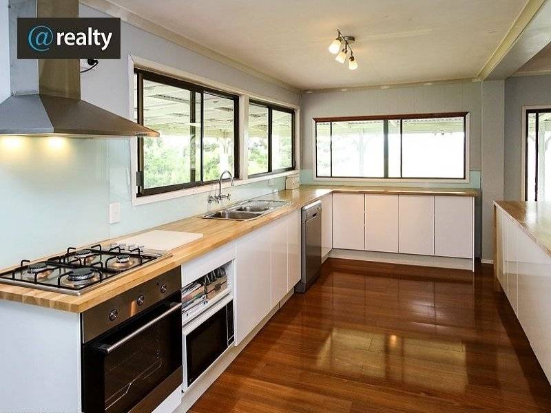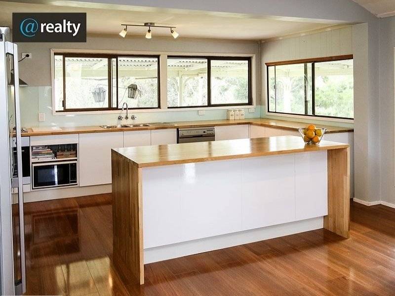 From the veranda you enter a very spacious living room, with plenty of natural light. It has windows on three sides and great north easterly views over the fertile Tuchekoi river flats. There are three separate living areas, currently used as lounge, dining and family rooms. The kitchen has a fresh look, with white cupboards and timber bench tops. The kitchen is well appointed with an island bench, a gas cook top, a dishwasher and loads of cupboard storage. Laminated timber flooring, featured right through the home, compliments the decor of the kitchen. The bathroom continues the kitchen's fresh look. White and timber! There are three bedrooms with a large walk-in-robe off the main.