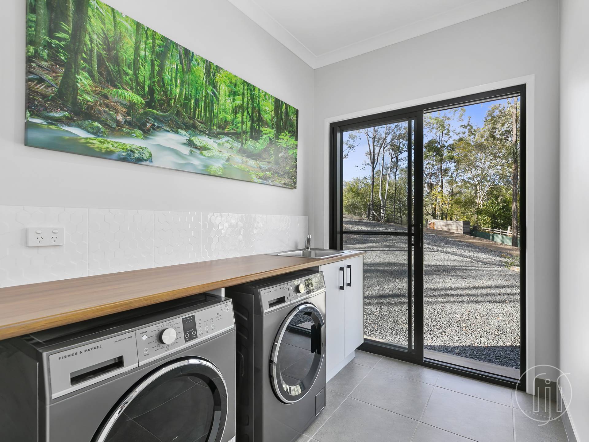 The home has a full-sized laundry with built in washing machine and dryer spaces, timber benchtops and sliding door to outside.