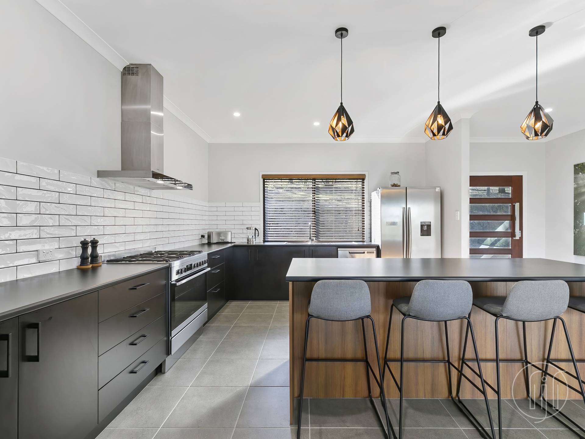 The kitchen is beautiful and with ample cupboard and bench space, hanging pendant lights plus freestanding gas cooker and feature rangehood, it is guaranteed to impress the fussiest of chefs.  The black benchtops and cupboards plus feature timber look along the breakfast bar bring some of the moody feeling from outside in.
