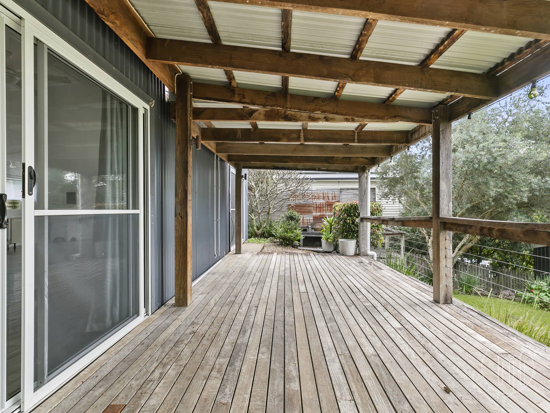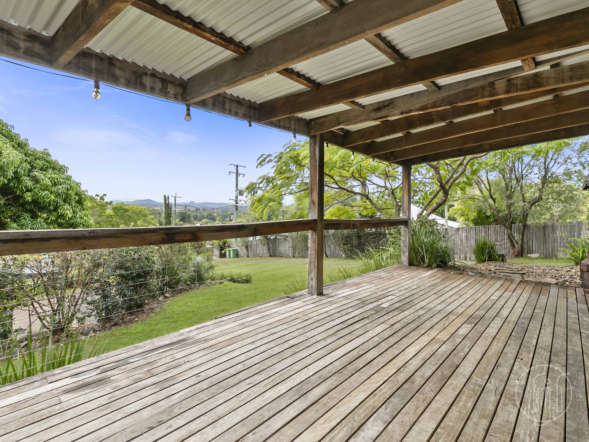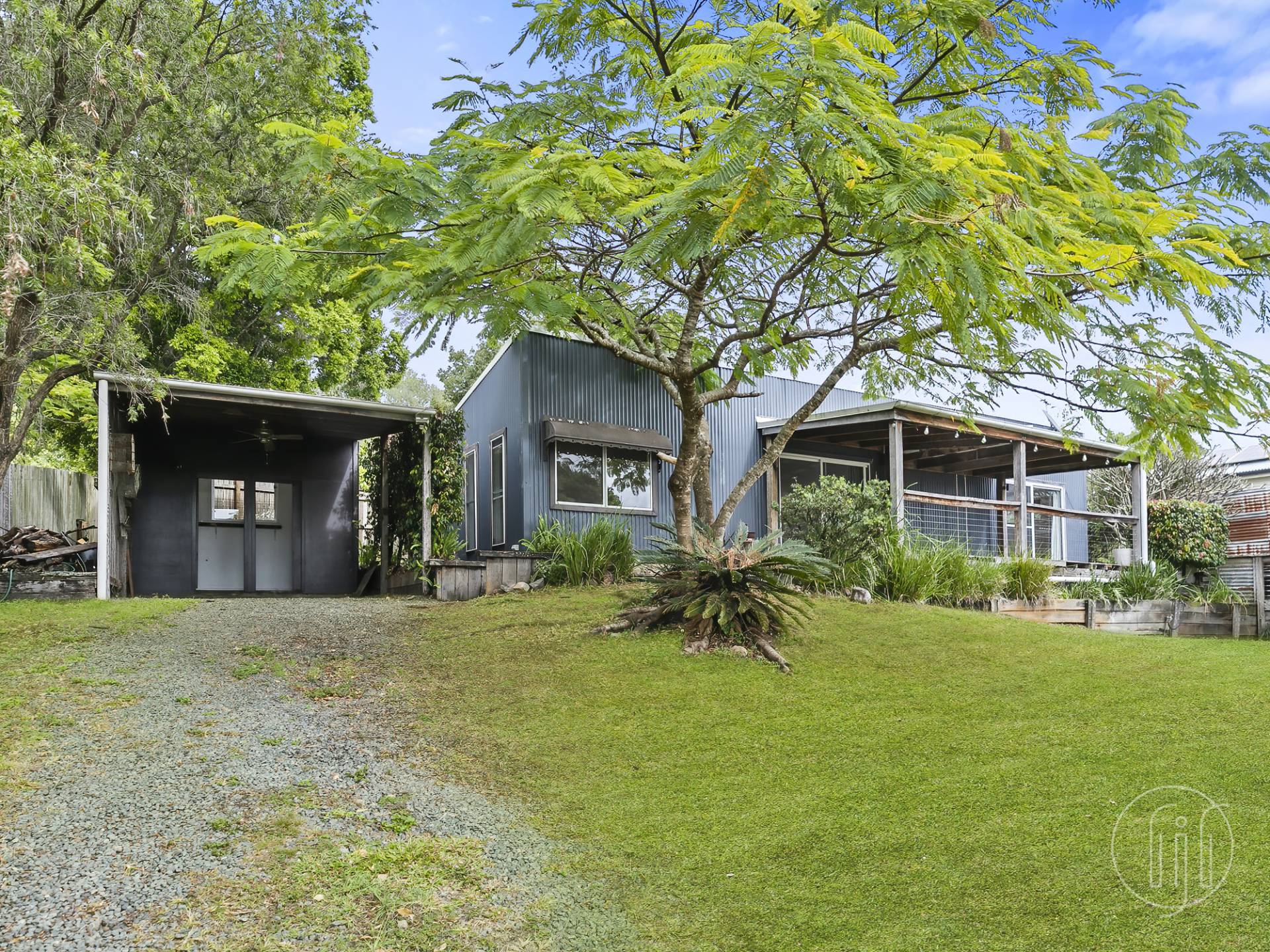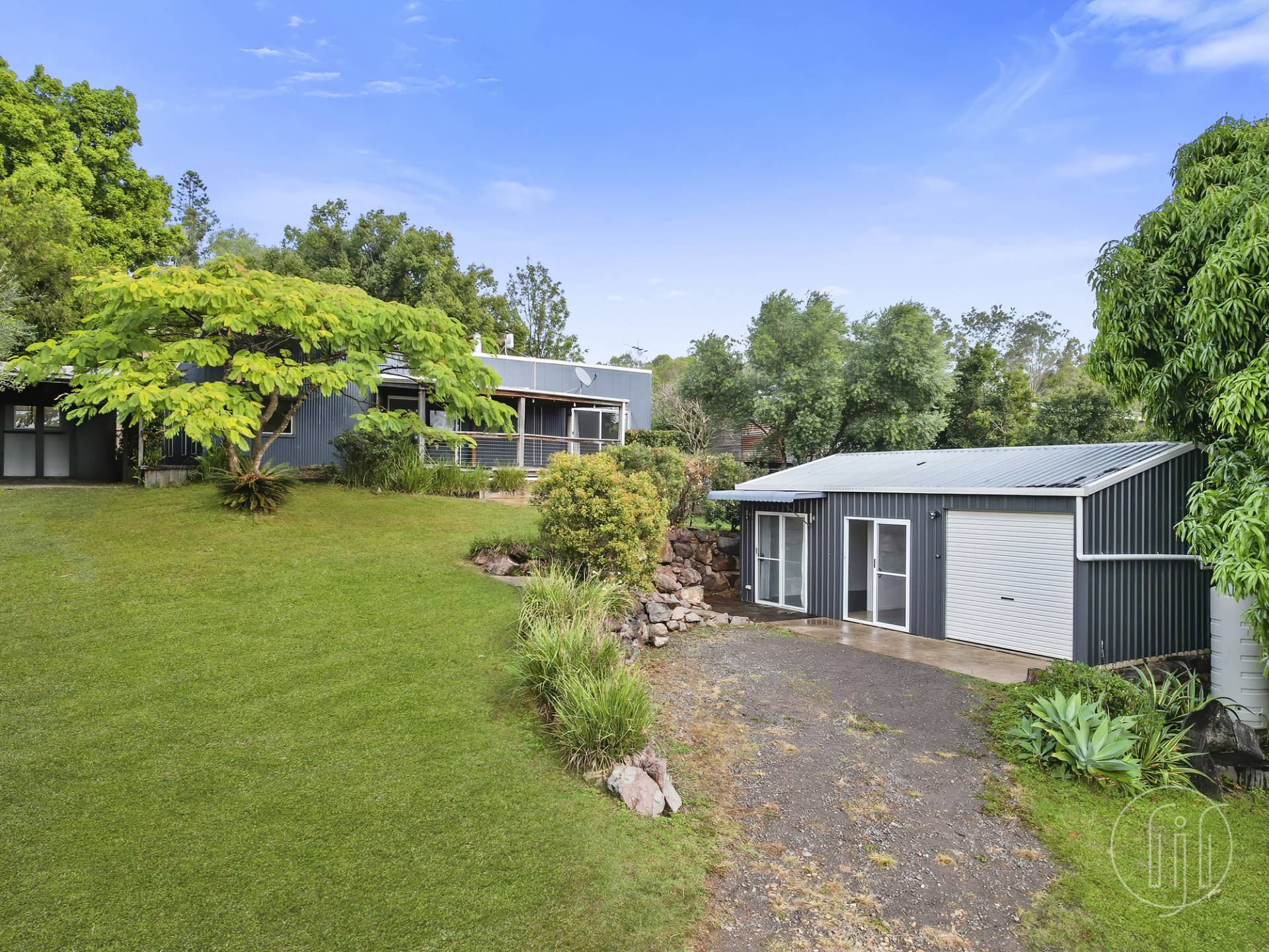 Sitting at the rear of the 1,012m2 block amongst rustic easy-care grounds, there are sleeper stairs and large stepping stones walking you through the feature pebbles.  The front of the house has a covered veranda for all your entertaining, a north facing warm space looking out amongst the mature trees to the hills beyond Imbil village.