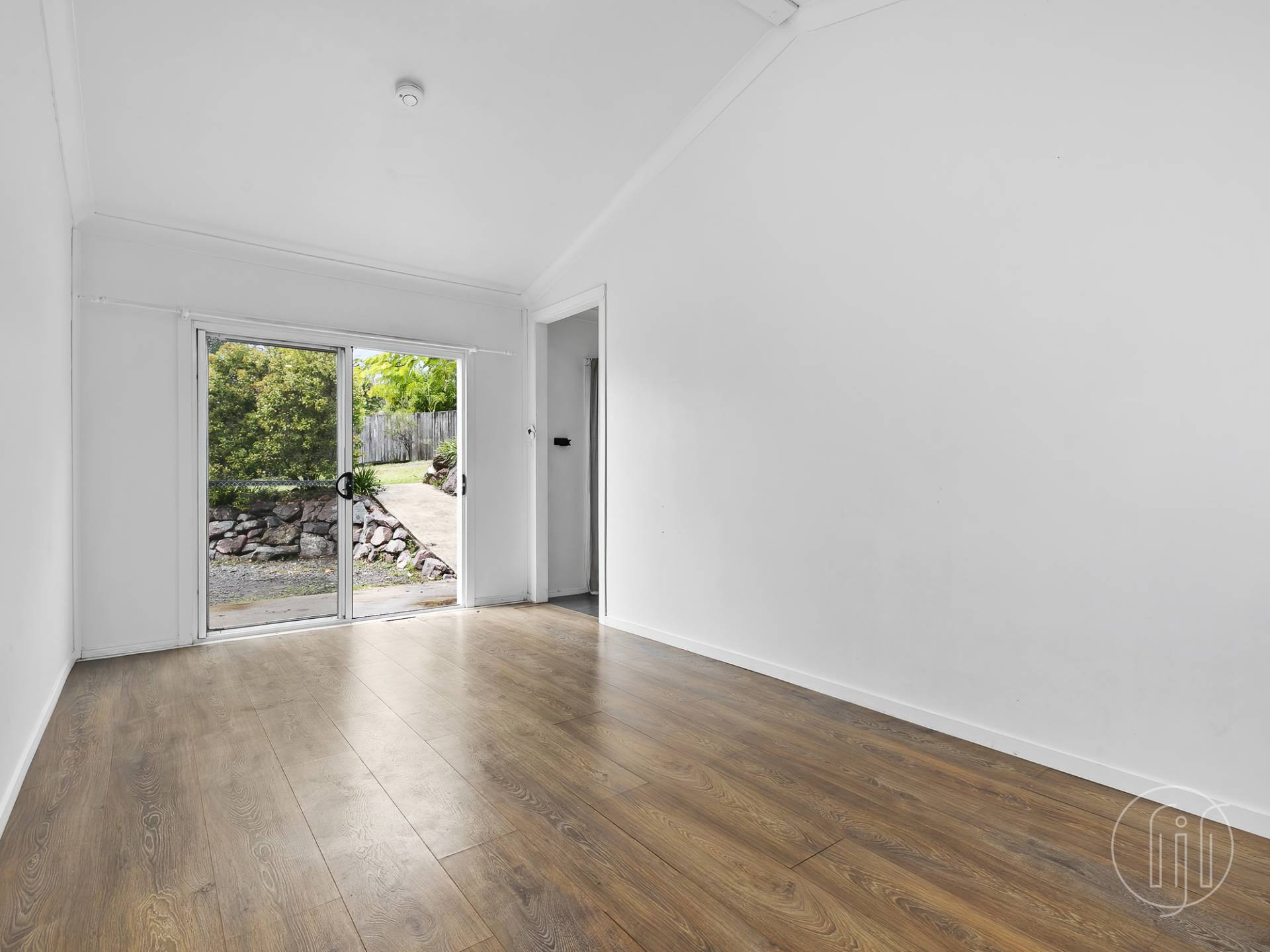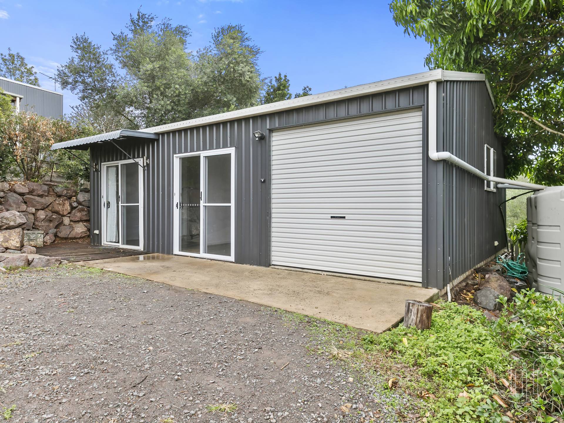 The studio sits below the main house and into the garden.  Single lock up garage, timber & concrete sitting area out the front plus sliding glass door access into both rooms.  Divided into two equal areas and with cathedral ceilings throughout, this studio has a large room on the right with timber look flooring and kitchen setup at the back, and a room on the left, tiled right through to the full-sized bathroom with shower, toilet and basin.