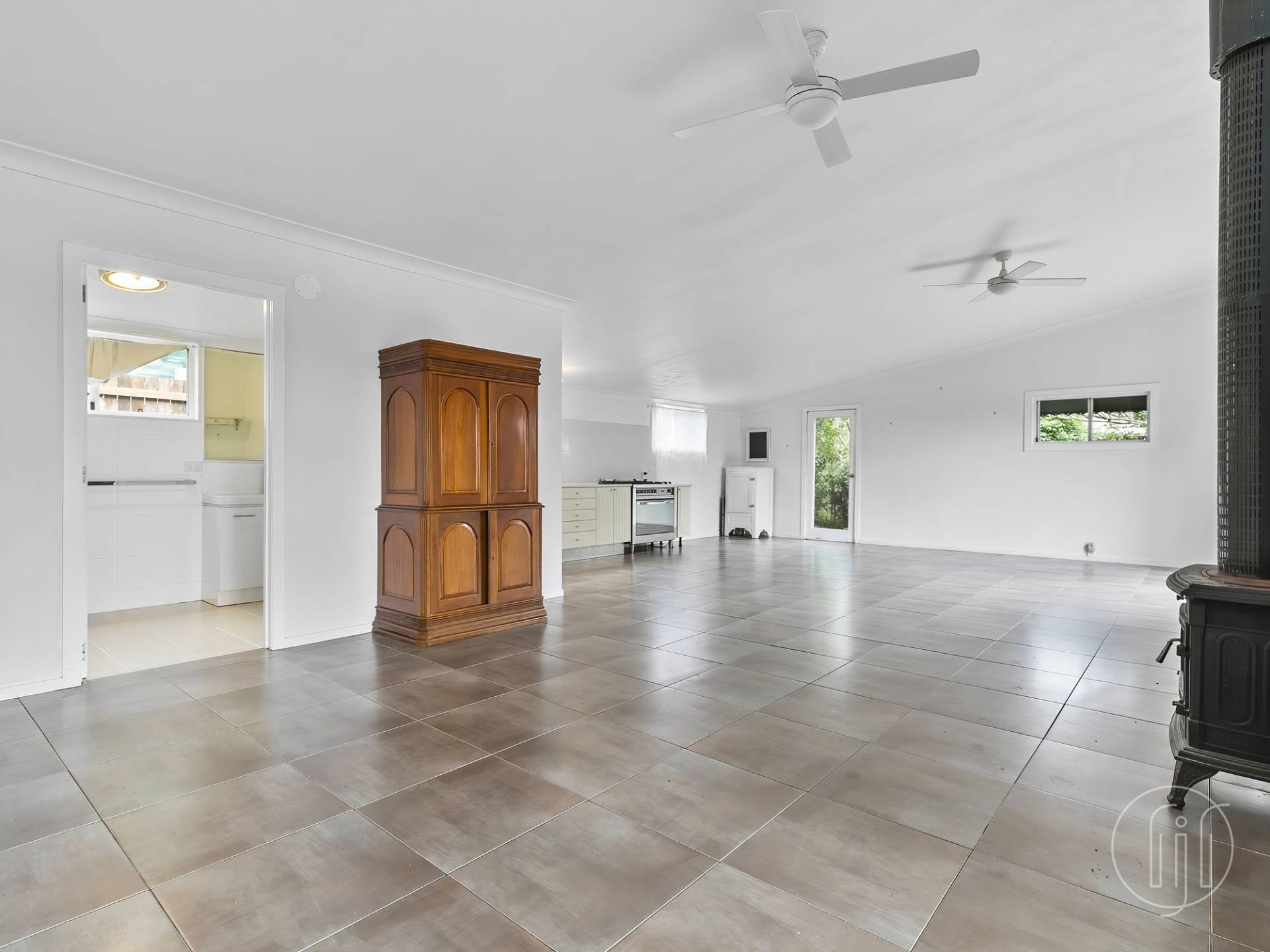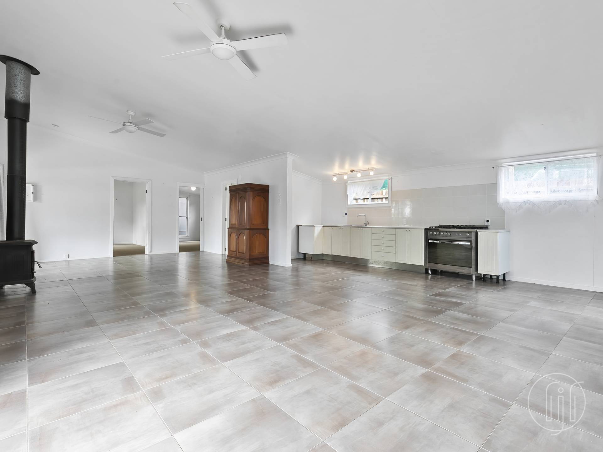 You can access the living and dining room via two glass doors from the veranda.  This area is all open planned and features a central slow combustion fireplace, and galley style kitchen along the back wall with as new 5 burner cooker.
