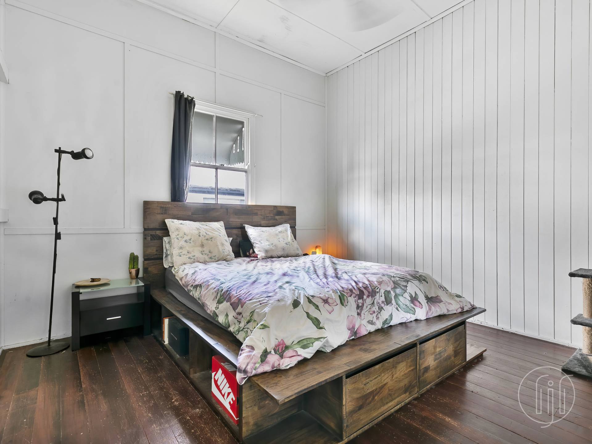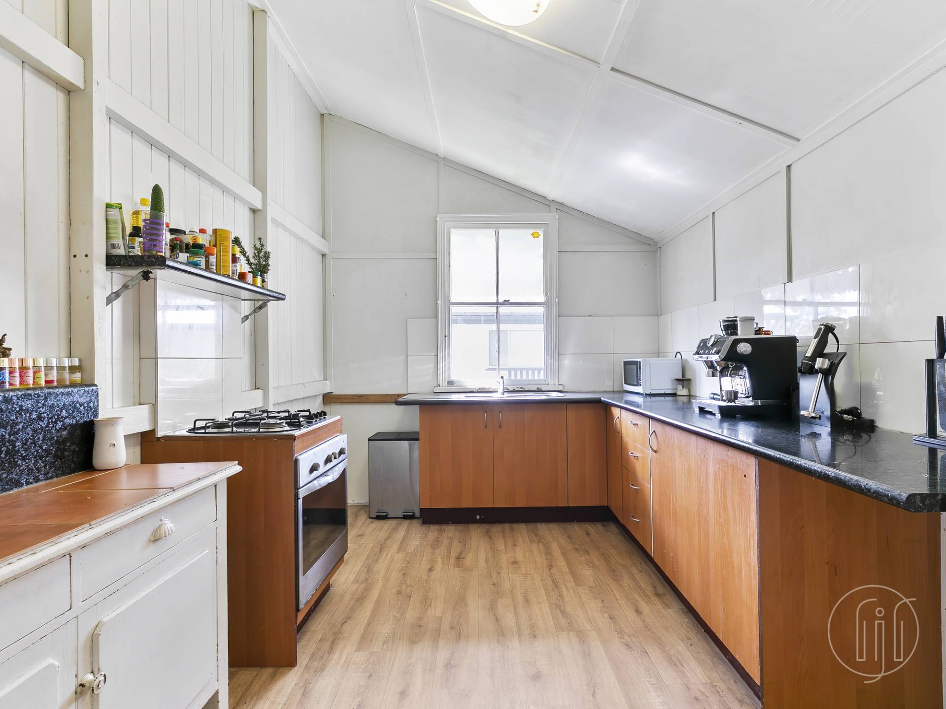 Climb your way up the front staircase to the north facing sitting porch and enjoy a drink with friends or a private coffee.  The house is accessed by sliding glass doors into the cozy living space featuring high ceilings, VJ walls, coloured glass windows and original timber floors.