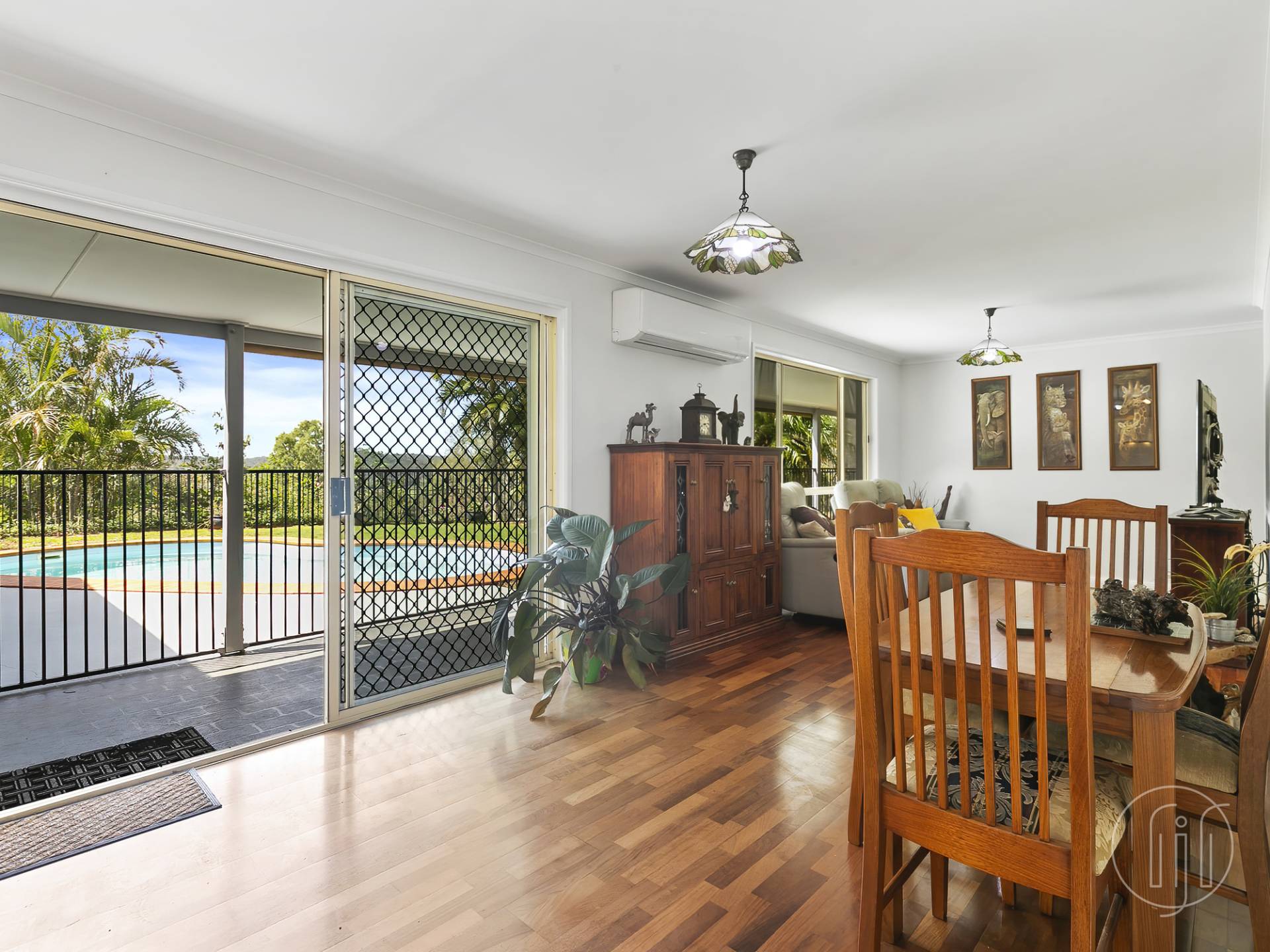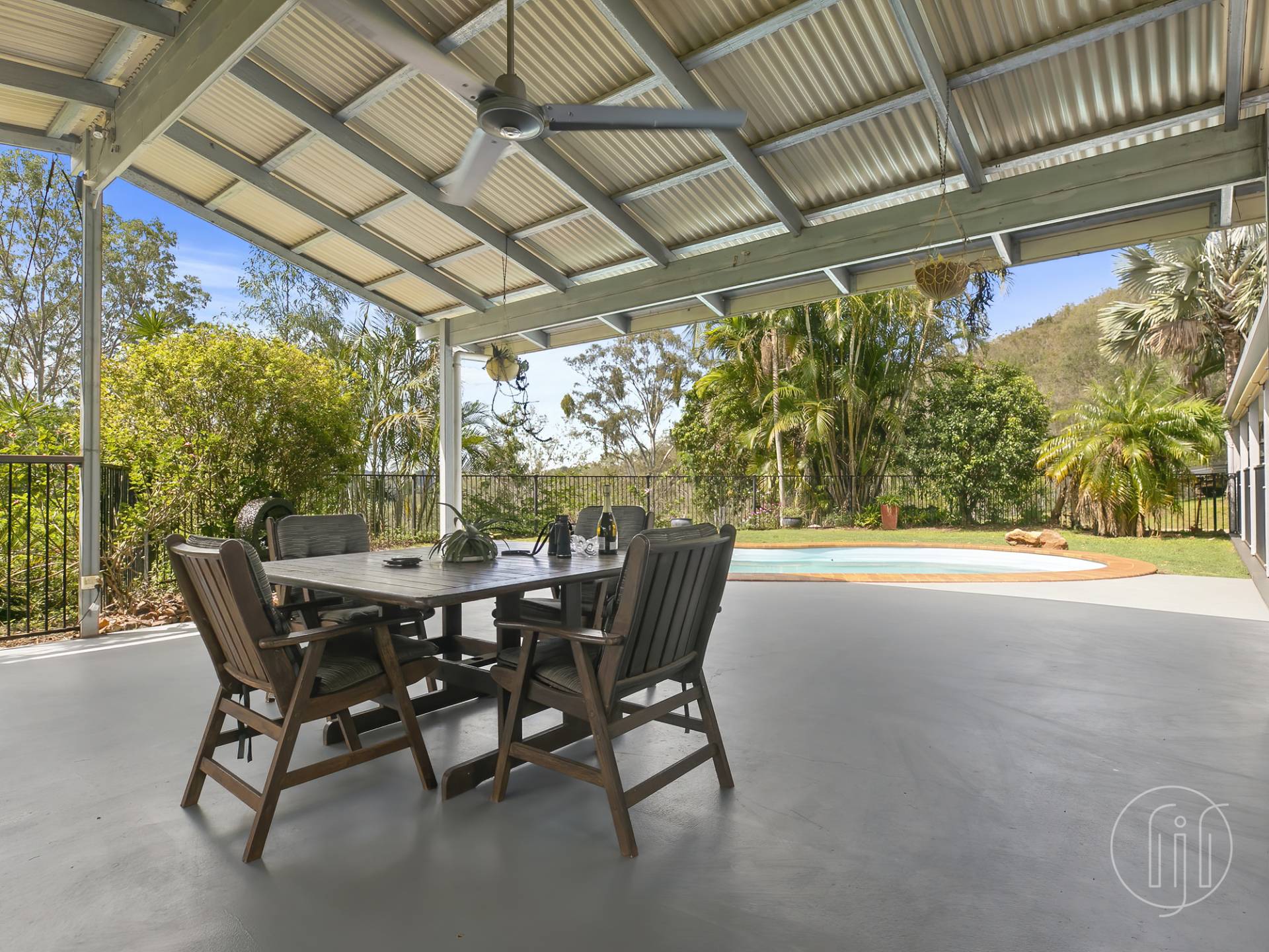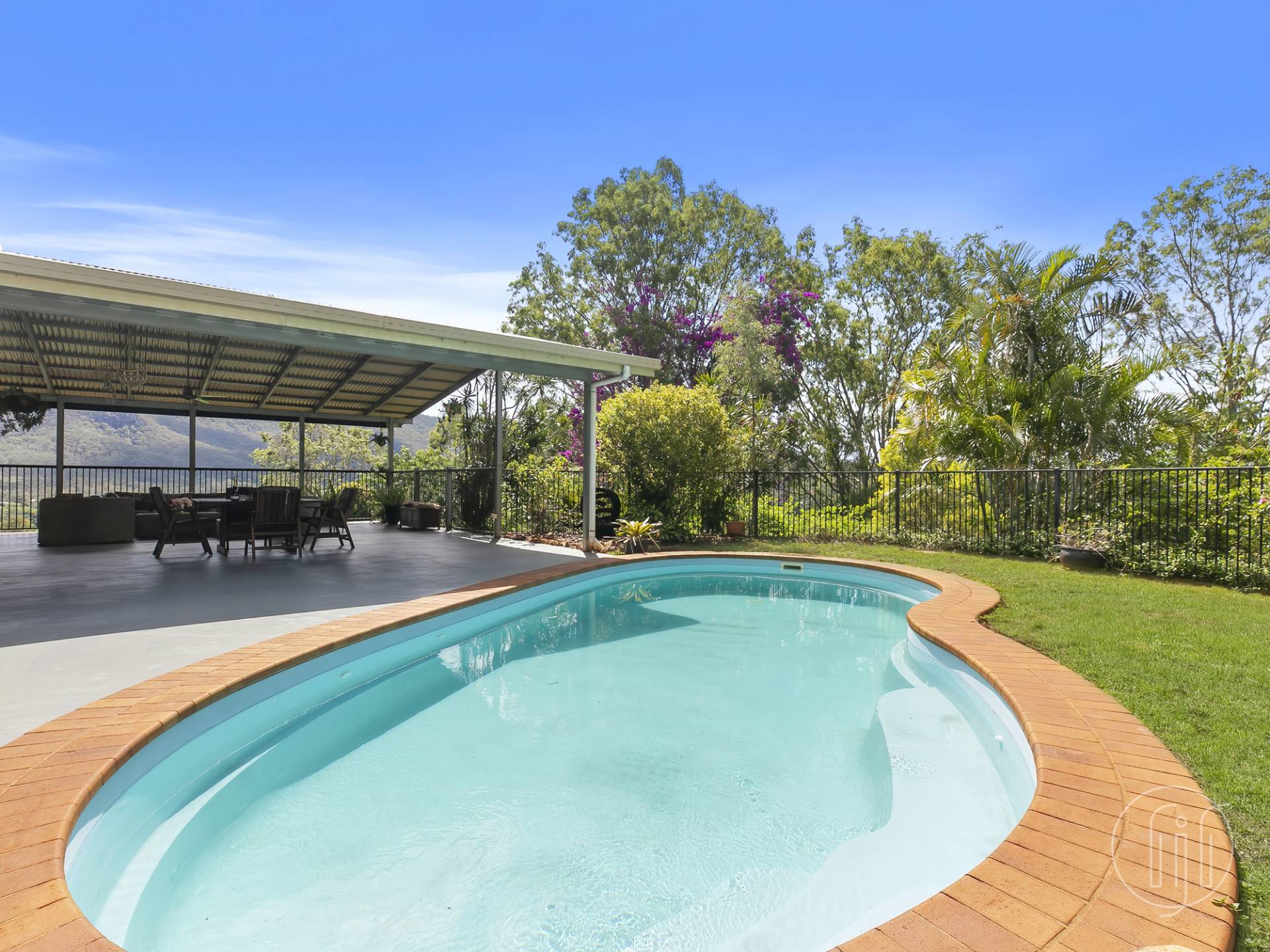 The cathedral style pergola offers approximately 90m2 of lounging and dining space that really must be seen to be believed.  Beautiful views through the flowering mature trees, plus an inground swimming pool and calming water feature.