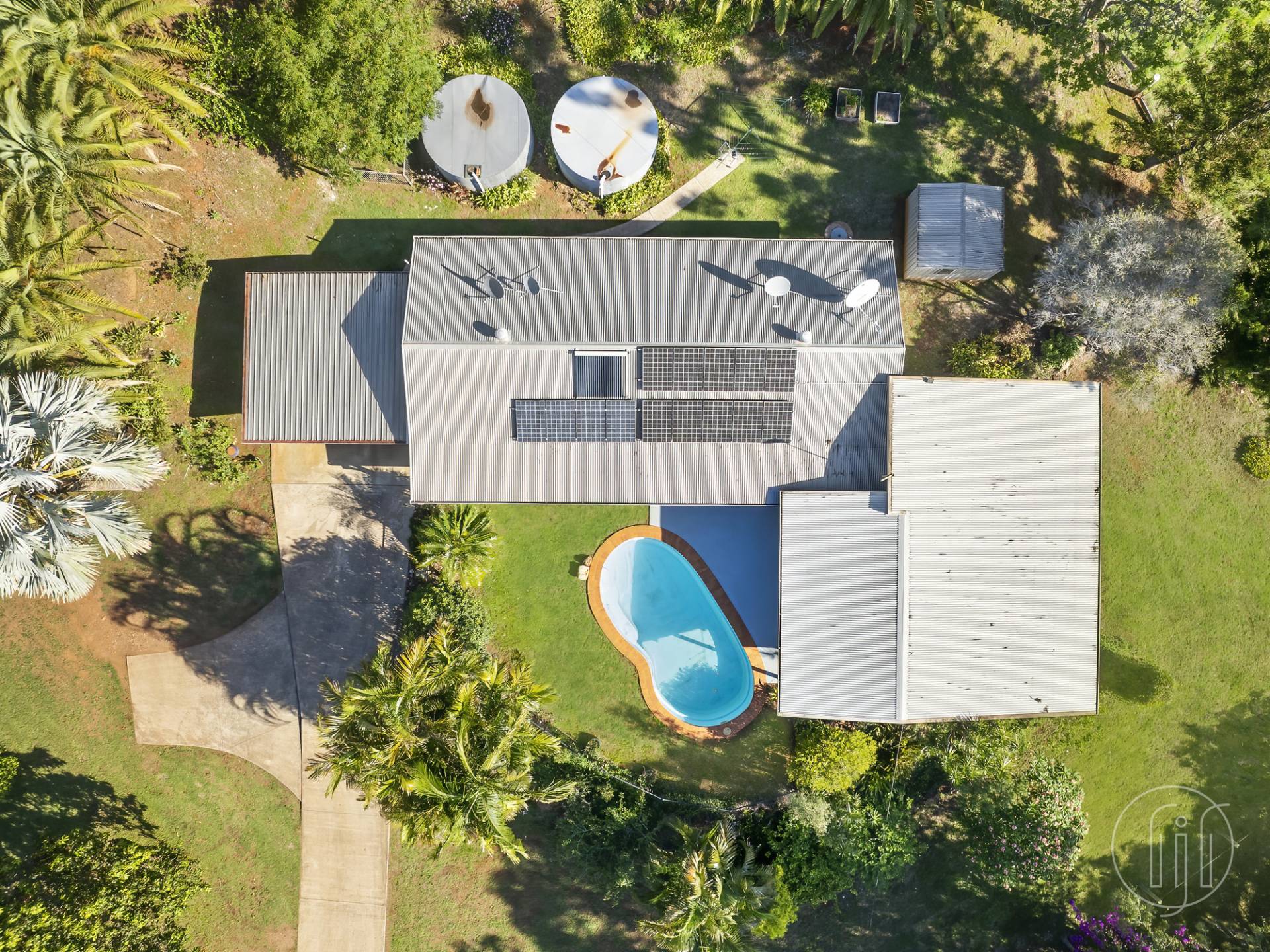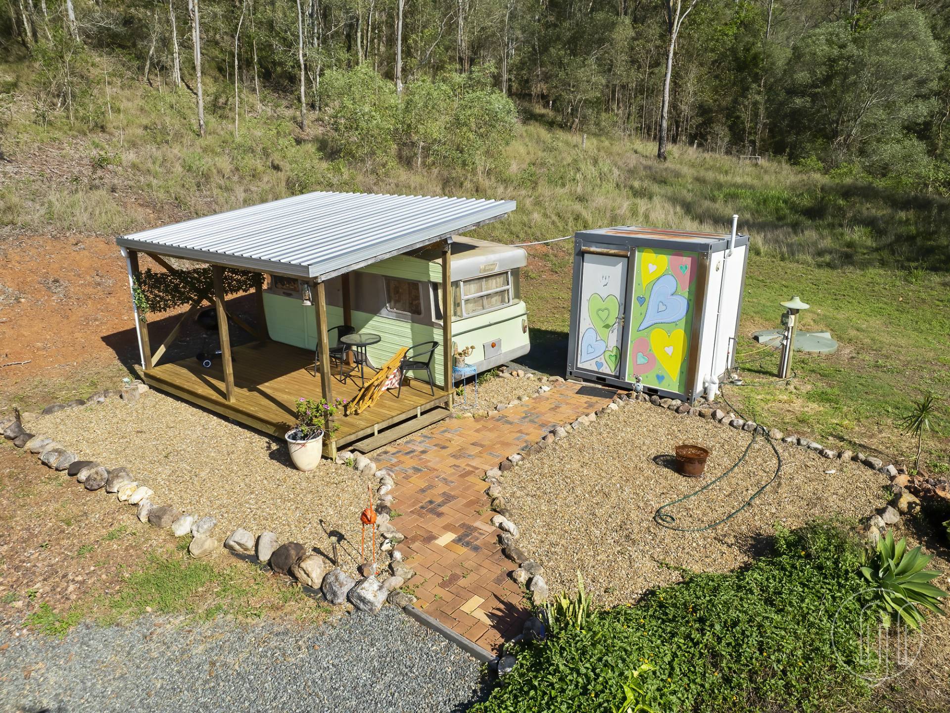 This property is set up with 4 additional accommodation options.  There are 2 bed-sit style cabins, 1 two-bedroom cabin, plus a caravan.  All set up with their own bathrooms, kitchenettes, covered entertaining areas and septic systems.  Ideal for extended family or visitors... or you decide!  These cabins are scattered throughout the lower section of the property with the main house located at the end of a long concrete drive up on the hill.