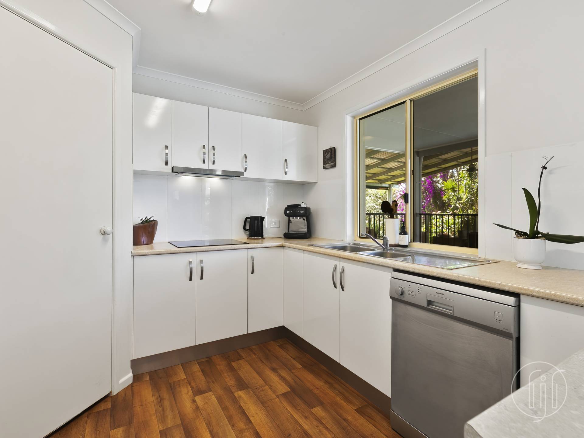 The lounge room is a light and cosy space with timber floors and air conditioning.  The kitchen is open planned and allows you to be cooking and chatting with family in the lounge room at the same time.  There is electric cooking appliances, a dishwasher and good cupboard space.