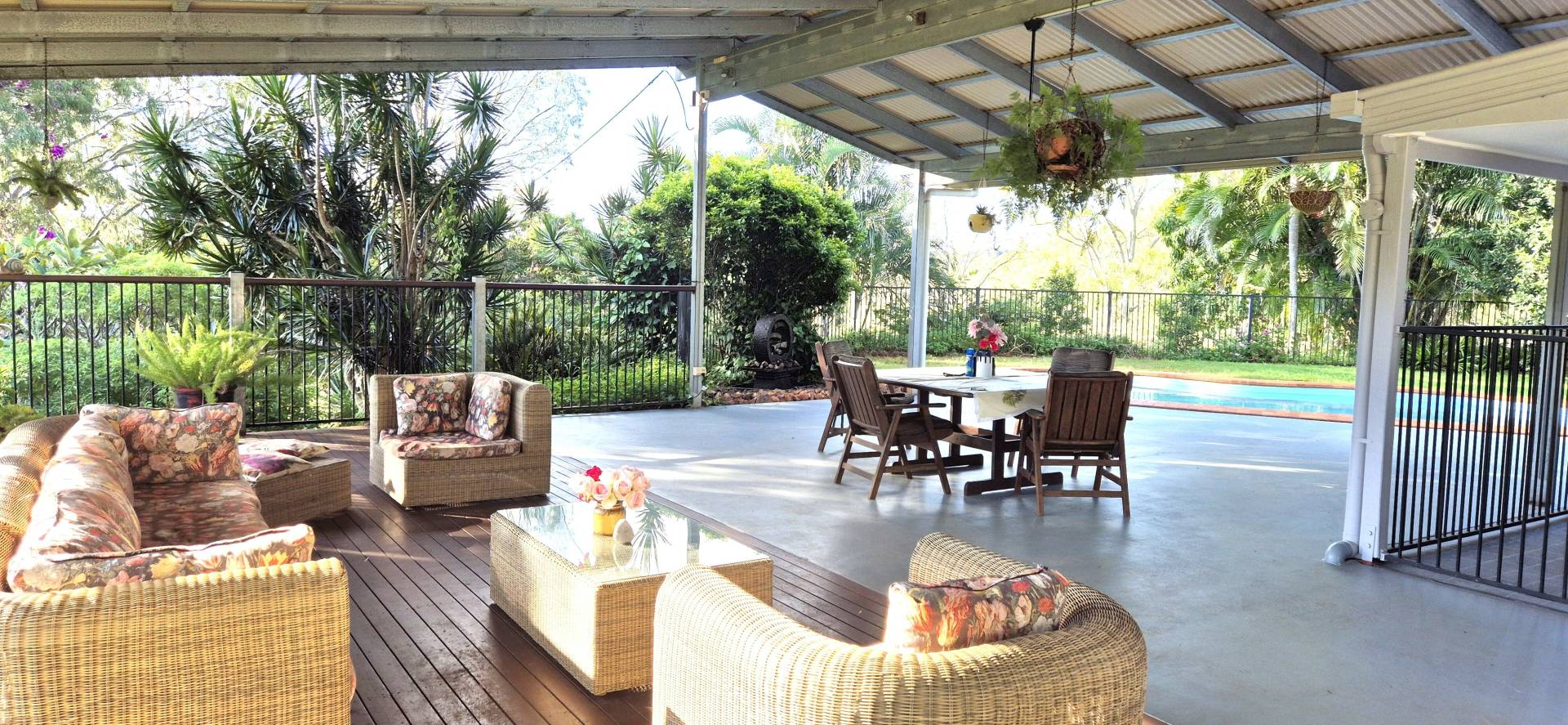 The covered veranda connects the home and entertainment area with access into the house via glass sliding doors.