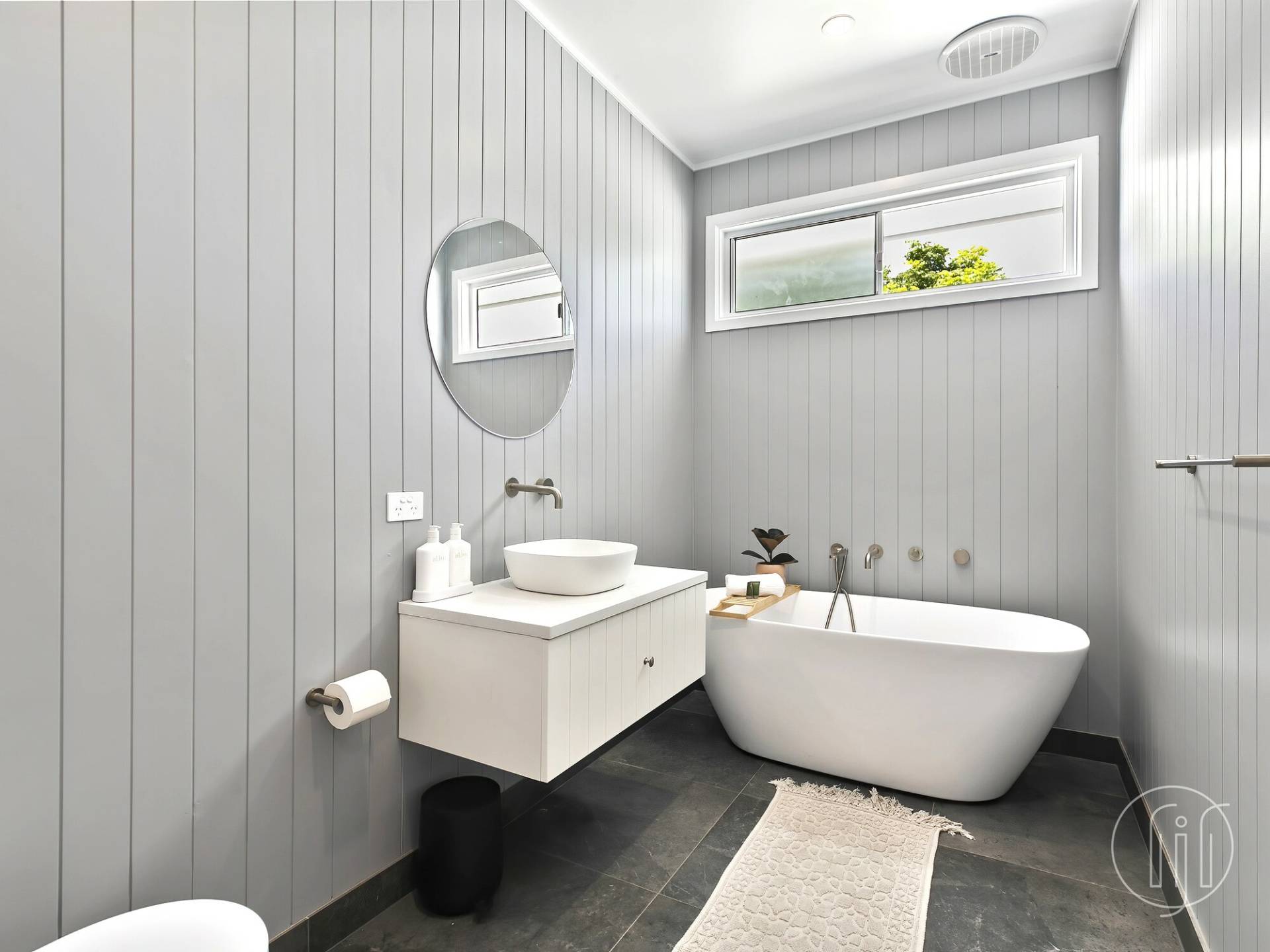 There are three bedrooms, all with ceiling fans plus 2 beautiful bathrooms.  The first located near the laundry with a large walk-in shower, and the second amongst the bedrooms with a stunning free-standing bathtub.