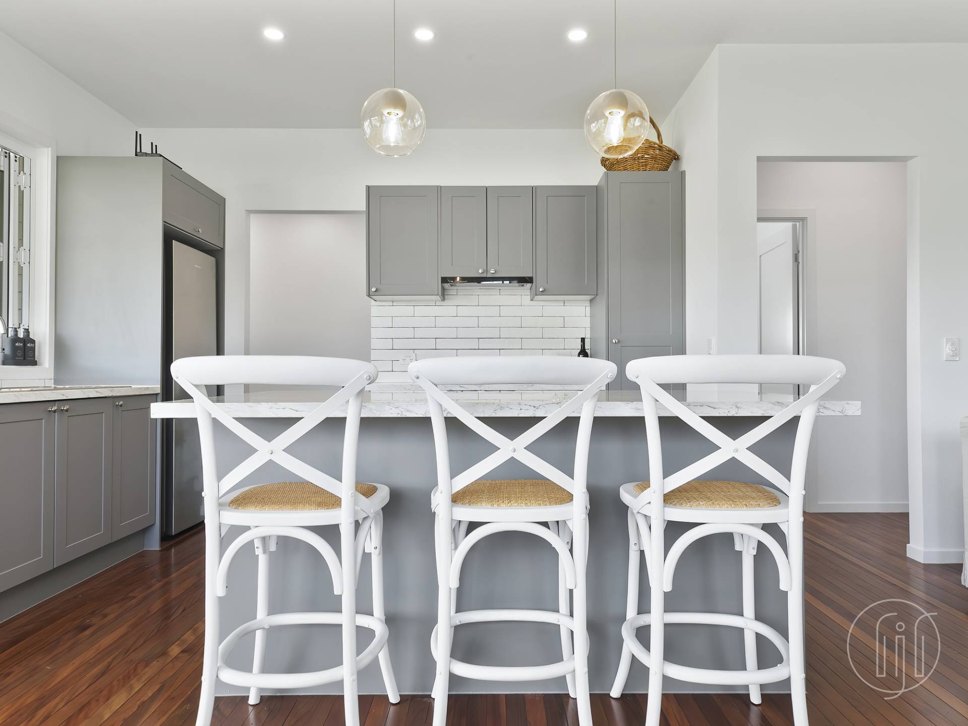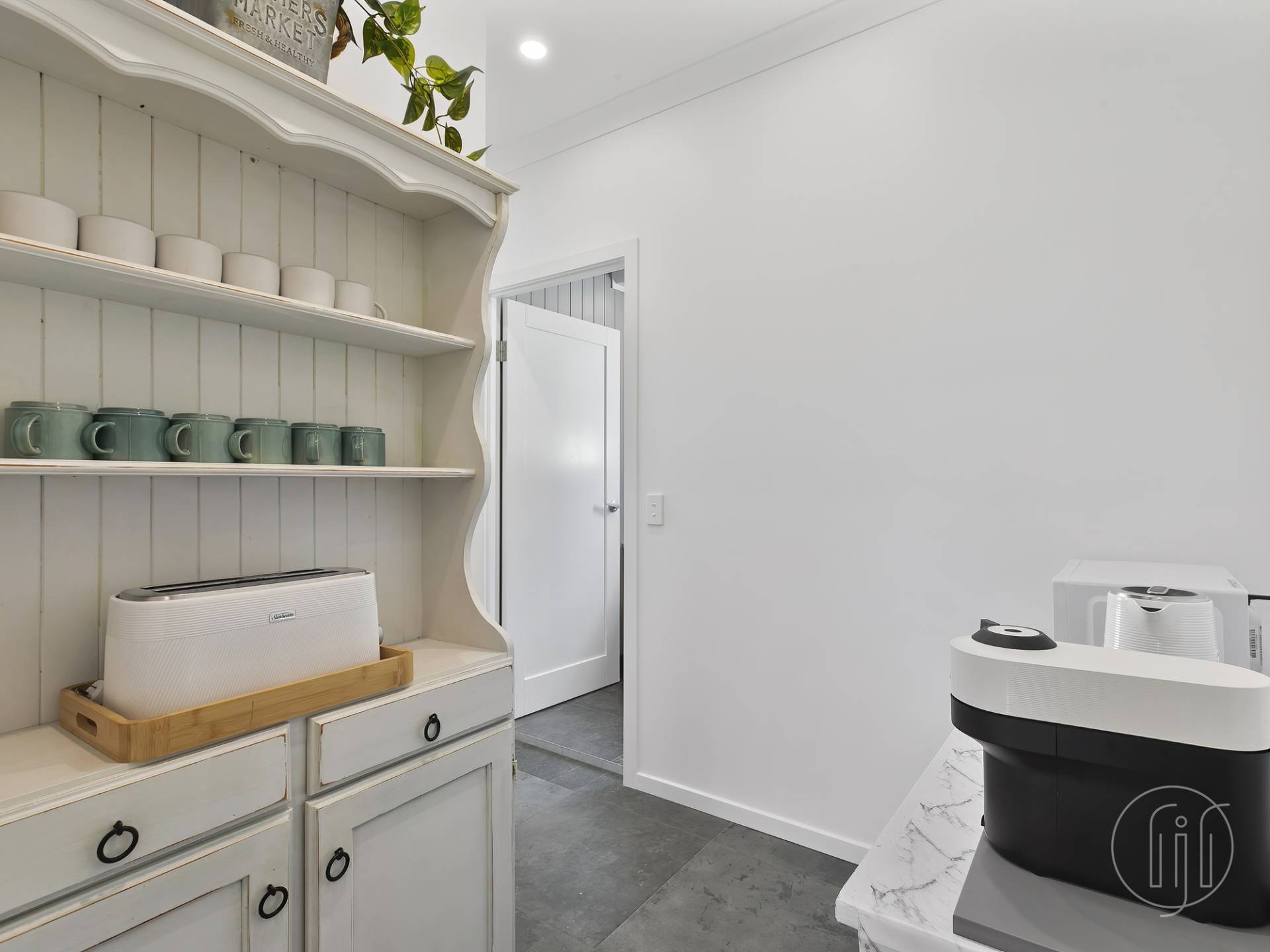 The kitchen has a modern colour palette, a large island breakfast bar and with the overhead lighting really brings the Hampton styling into play.  There is good storage, marble look laminate benchtops, gas hotplates, electric oven, and a dishwasher.  On the far side of the kitchen another open area lends itself to a great butlers pantry.