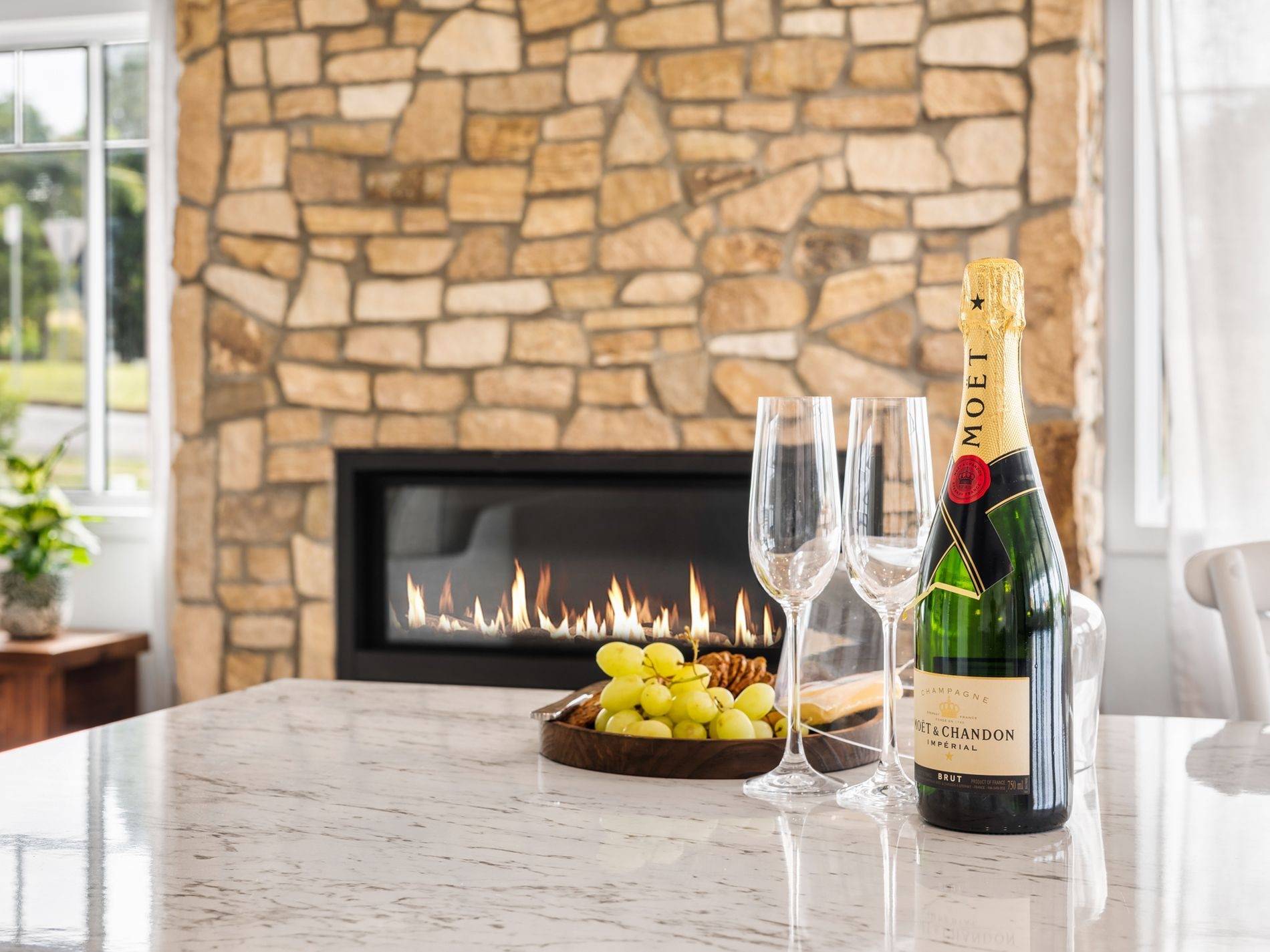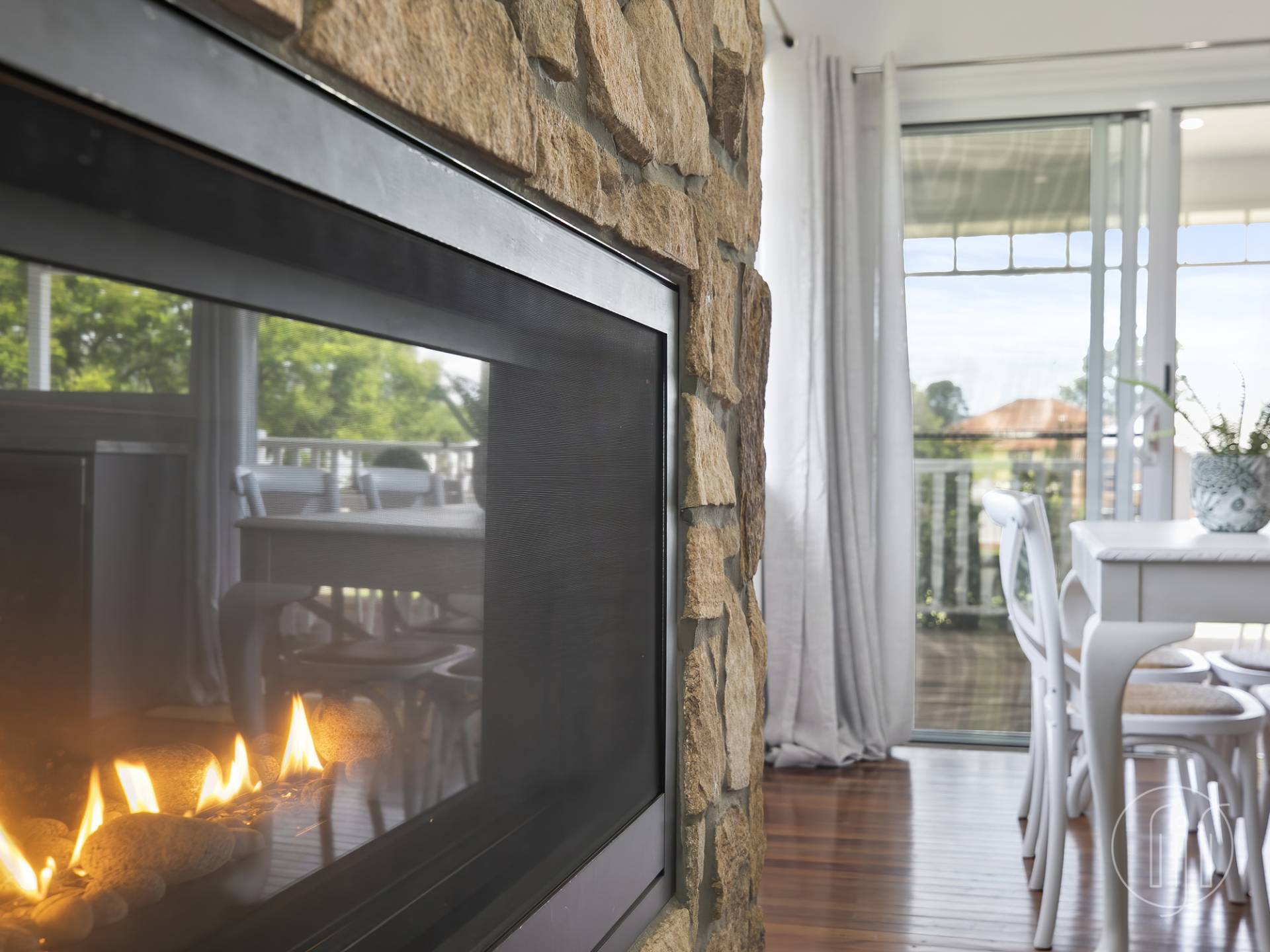 Entry is from the front covered porch into the open planned living, dining and kitchen area.  Whilst all spaces are set up as separate zones, they all merge easily with polished timber floors right through, selected walls with VJ paneling, large windows and an incredible full height gas fireplace.  This certainly completes the room and is a great entertaining feature.
