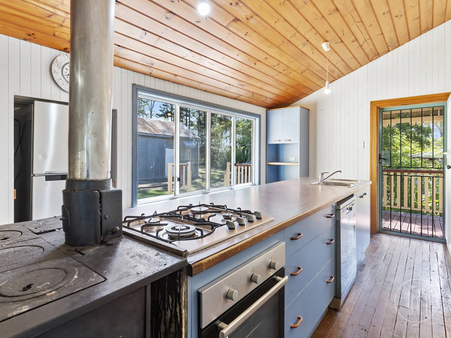 Corner steps lead you onto the open deck for outdoor entertaining, around to the covered entry porch and straight into the kitchen.  The kitchen has a long island bench in the centre with access from both sides, timber floors and VJ walls and ceilings.  There are gas hotplates, an under-bench oven and dishwasher, a great pantry and space for a dining table at the end.