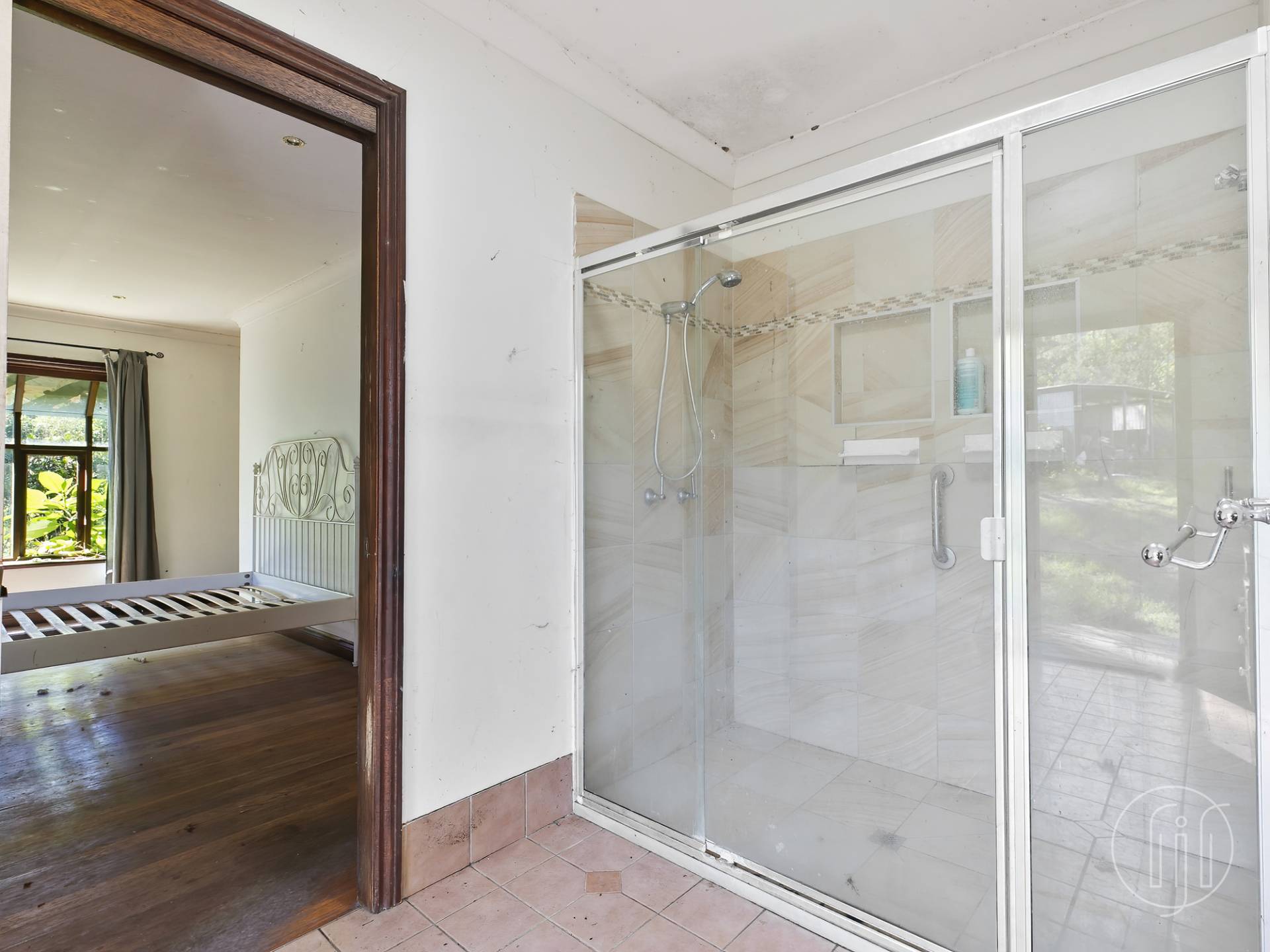 There are two bedrooms off the living room.  One near the combined laundry / bathroom, and the master with enclosed sleepout, ensuite and either a walk-in robe or office space, with rear door and timber landing.