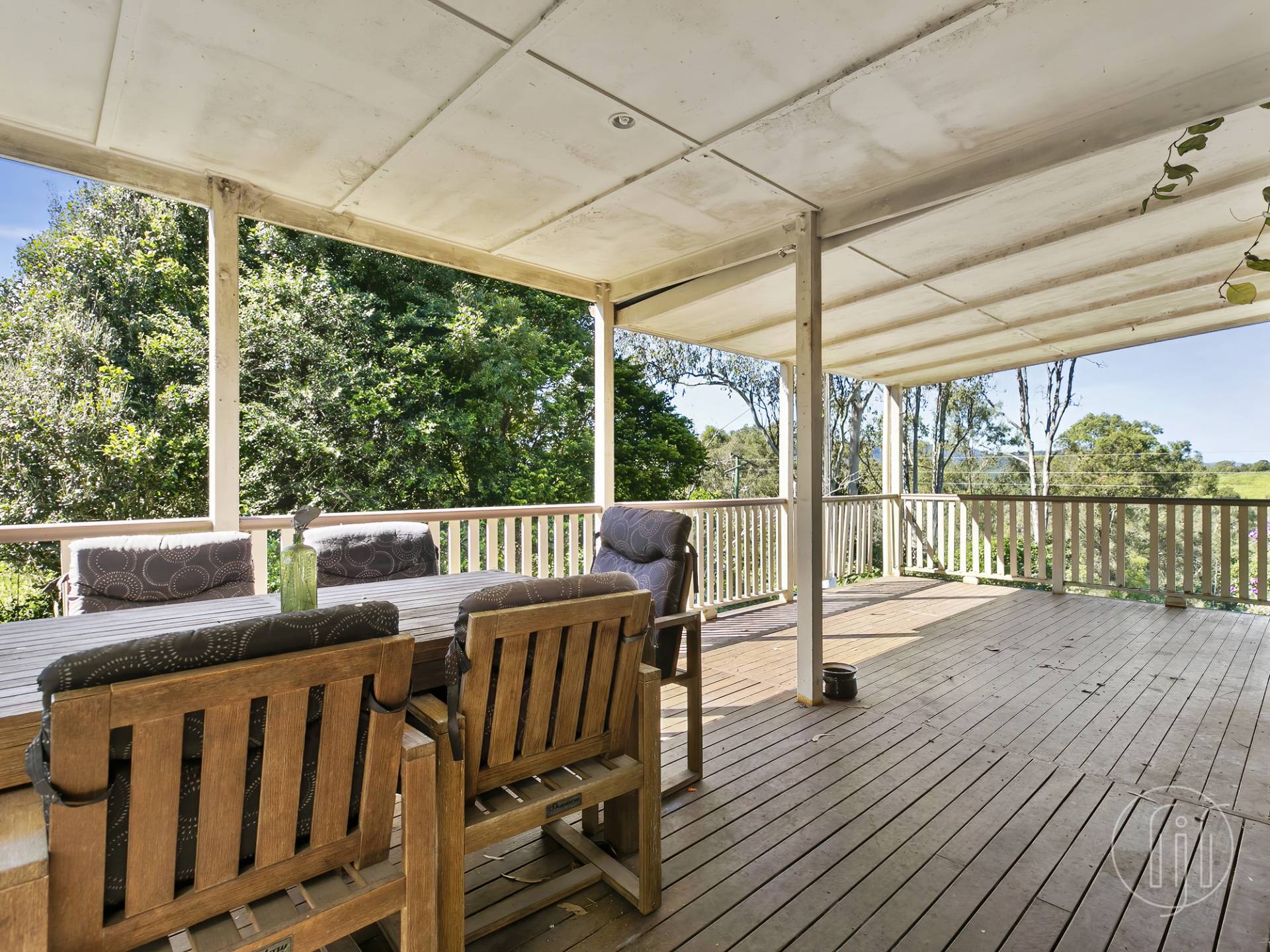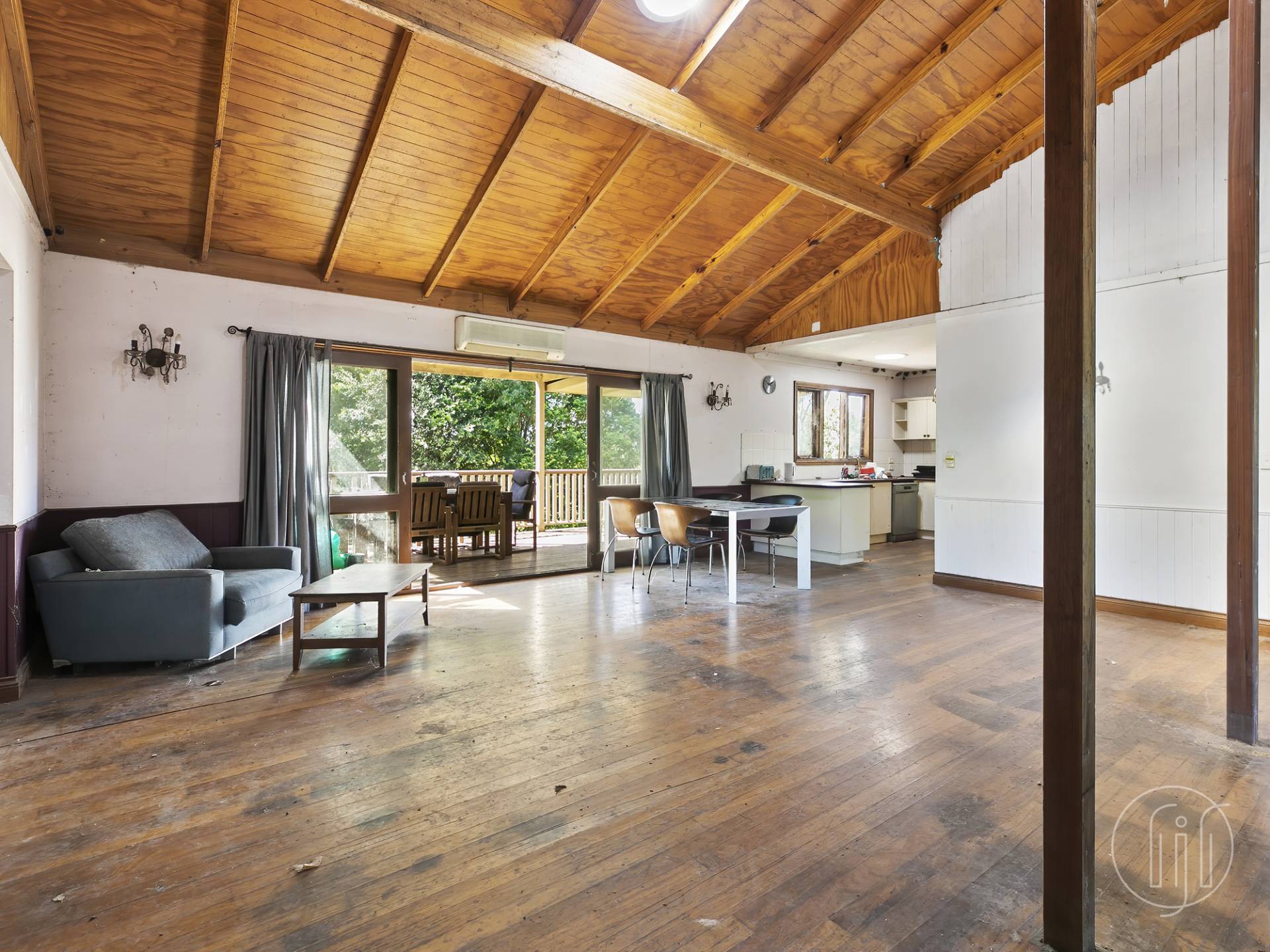 Butterfly stairs leading up to a covered veranda takes you through the front door to the living and dining room with great light, timber floors and high cathedral ceilings.