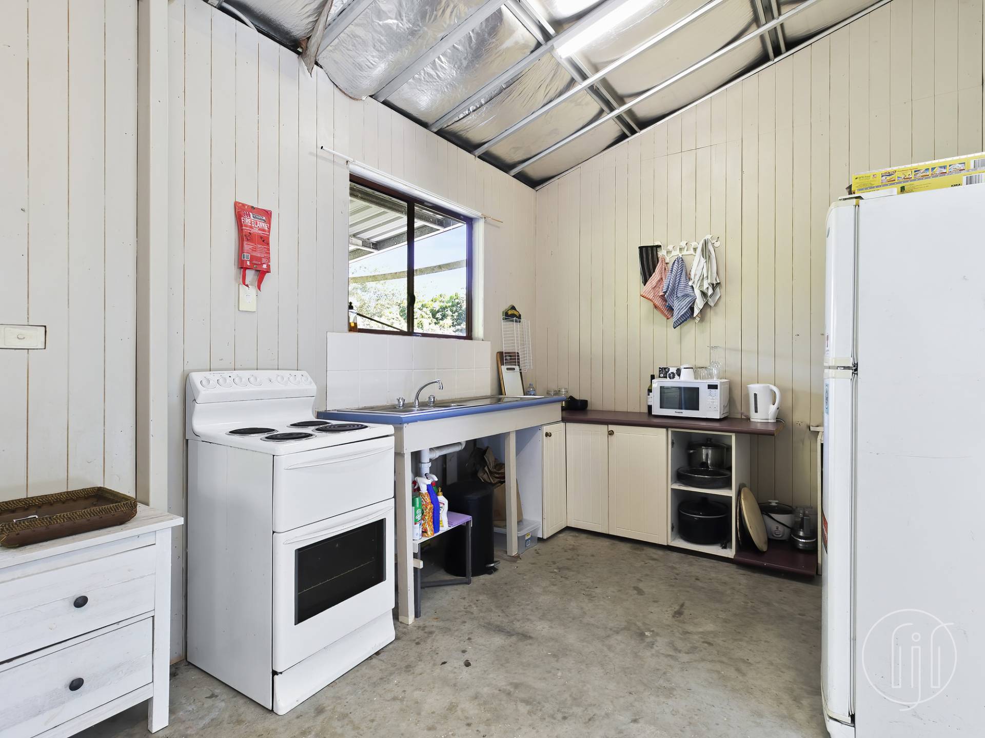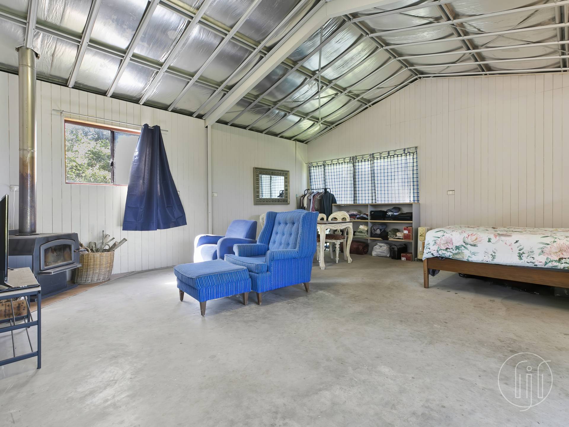The shouse is divided into zones using furniture, however, is one large open space with concrete floors, VJ walls and a slow combustion fire.  The kitchen has electric cooking facilities, and the bathroom is private with a shower over the bath and toilet.