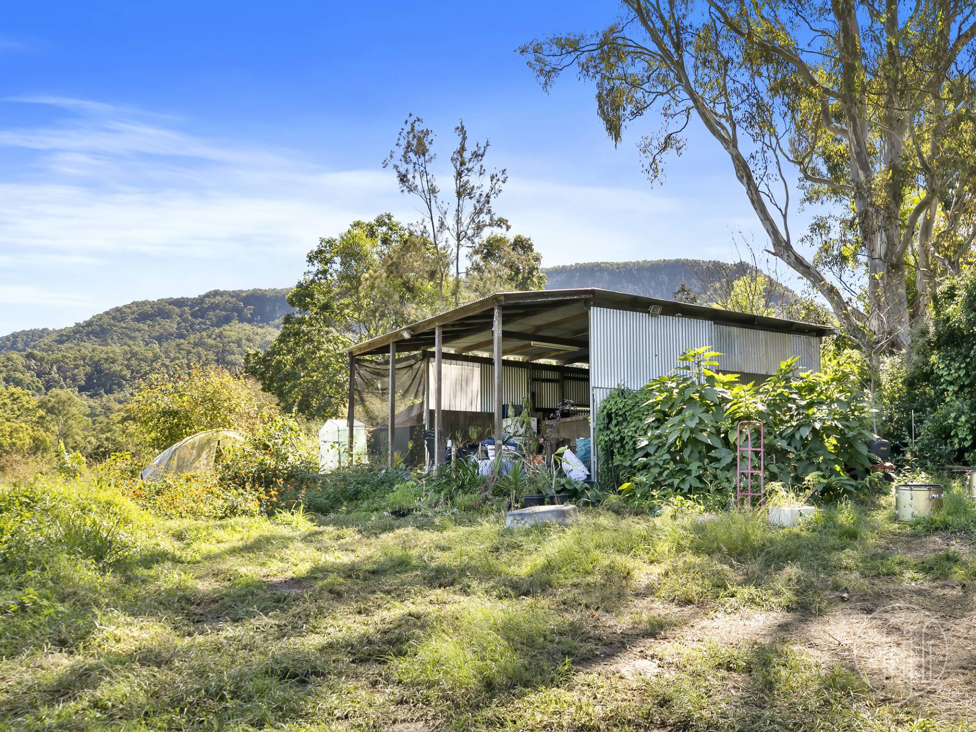 Sitting above the two homes is a greenhouse for your plants, plus an open barn style shed.  The shed was once set up with a bar for entertaining and has car accommodation on the far side.
