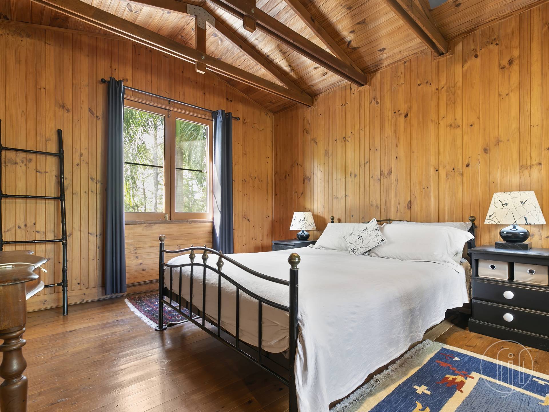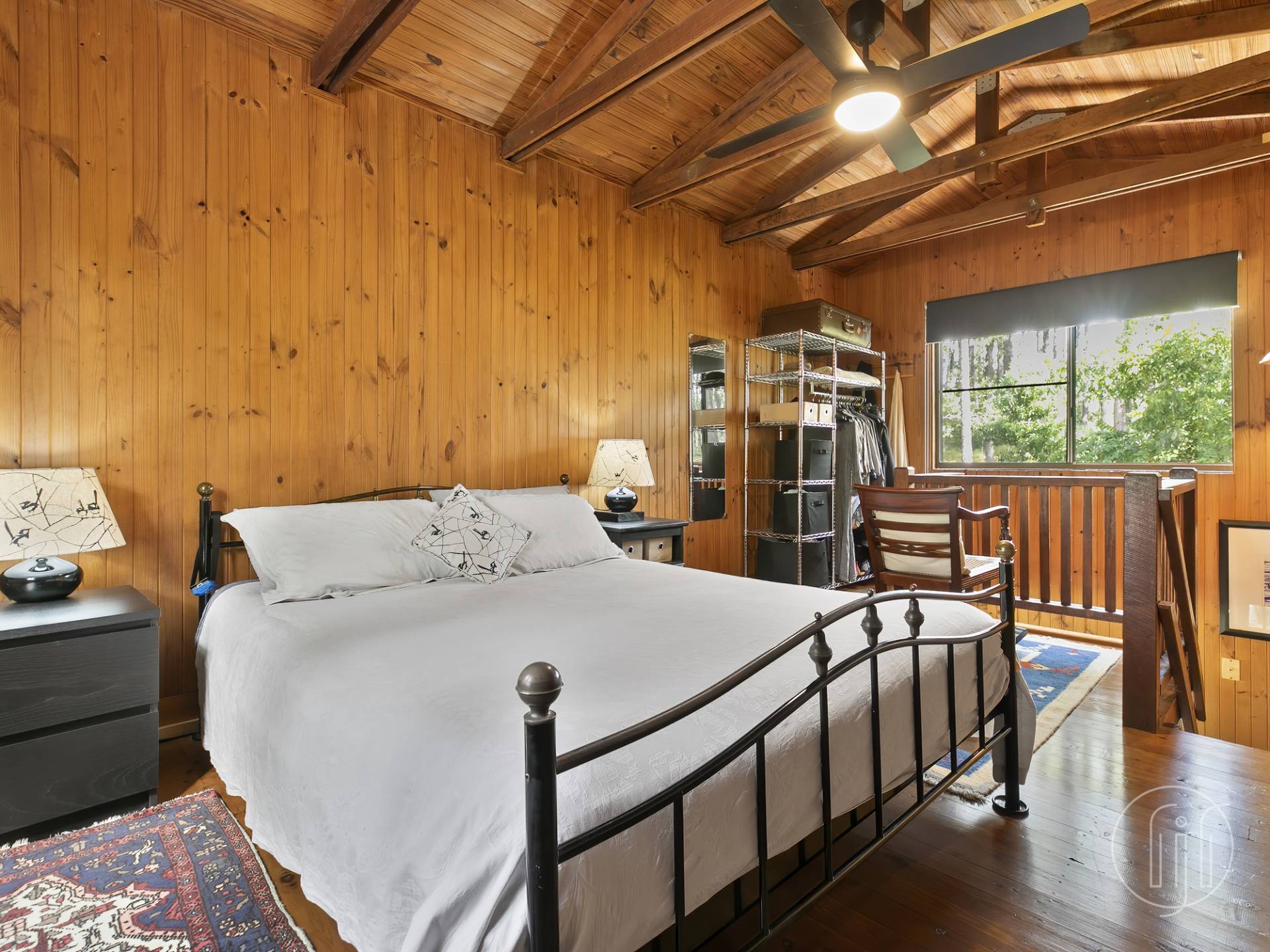Wander up the timber staircase and you will find the main bedroom highlighting more of the pine lined walls and exposed trusses.  This is a fun space and allows you to enjoy the storybook feel to the cottage.
