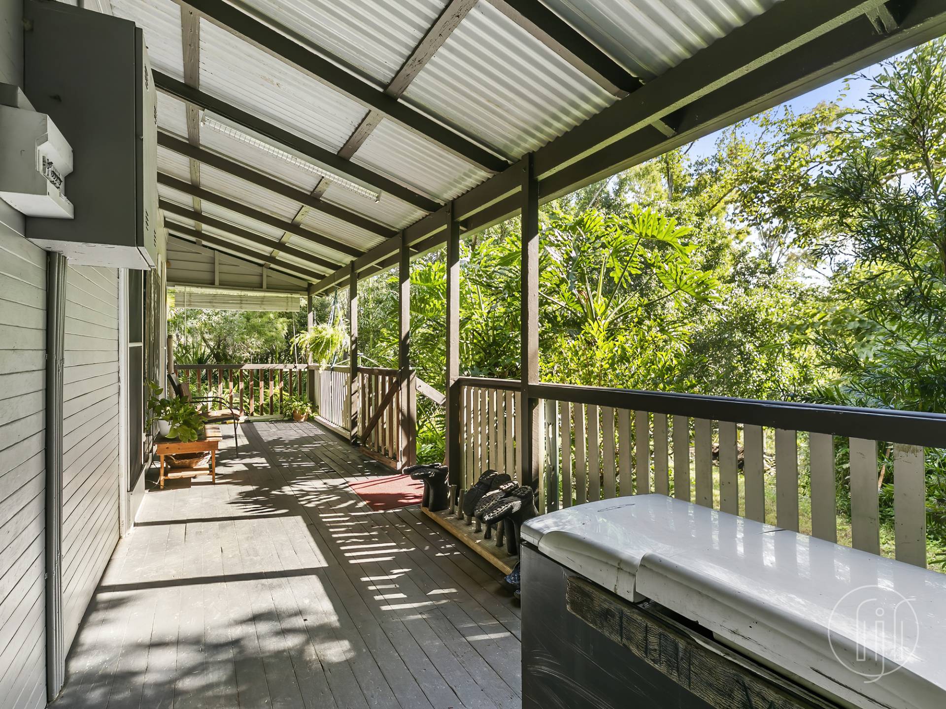 The rear covered veranda runs the length of the home – the ideal entertaining space with filtered sunlight through the beautiful trees and stairs down to the established gardens.