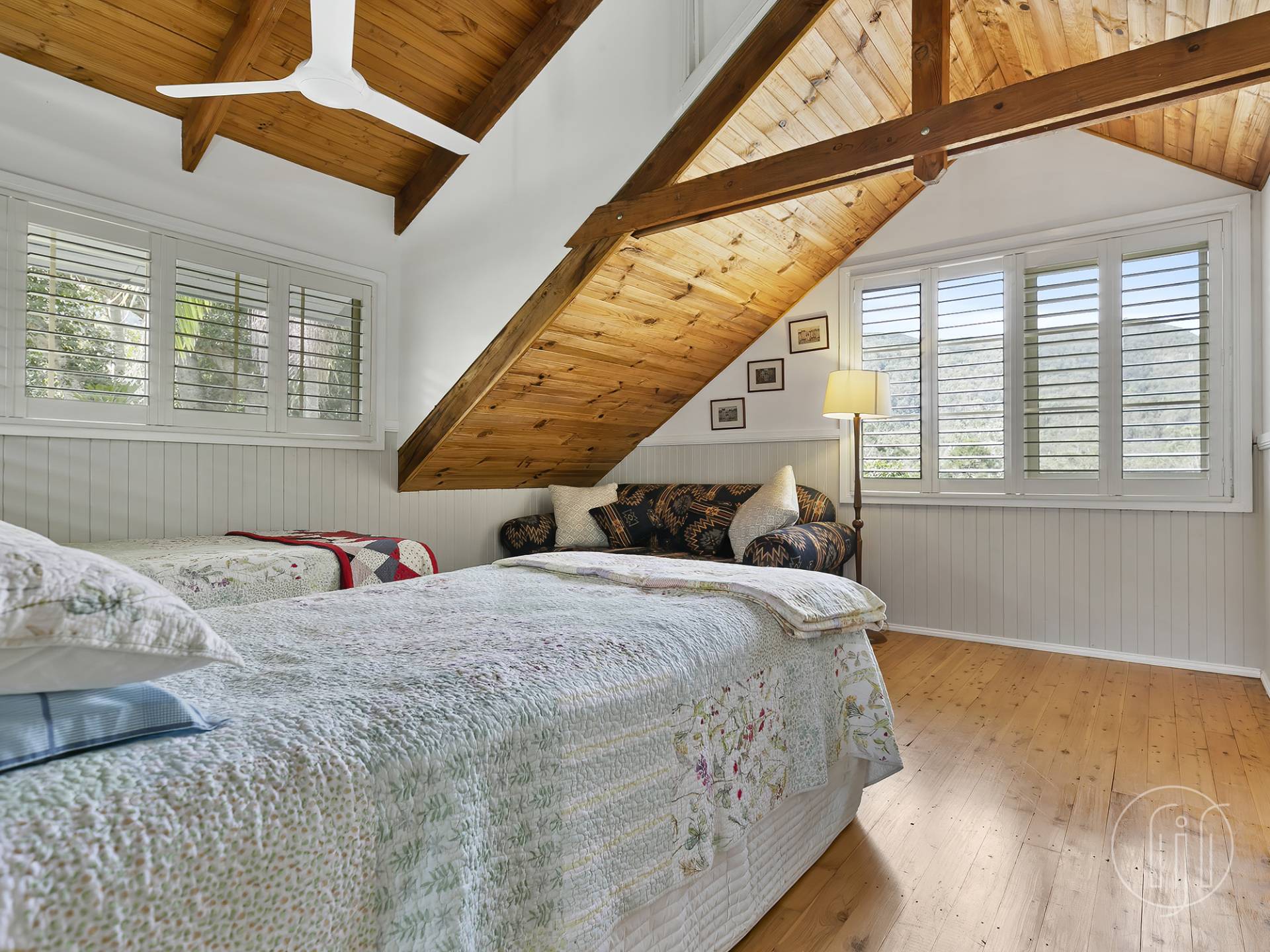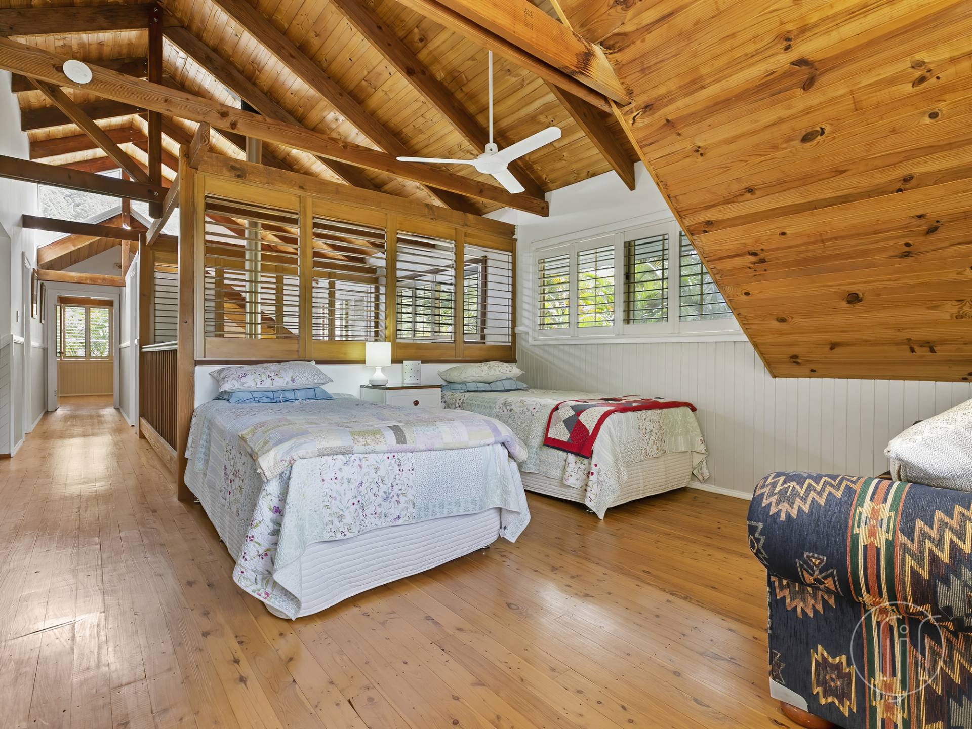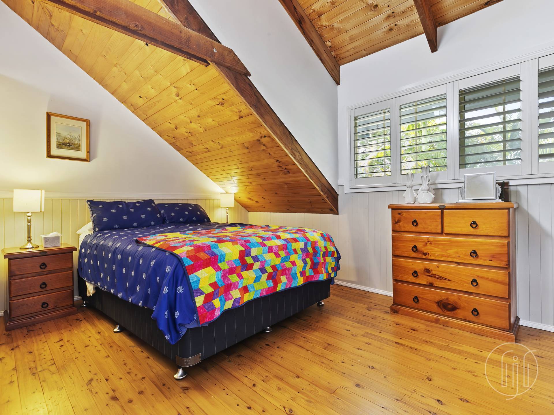 Upstairs is filled with sunshine and light and has three good sized bedrooms, two with walk in robes, and there are two bathrooms.  This level features timber shutters, polished timber floors, pine lined ceilings, exposed trusses, VJ wall paneling and RC/AC.