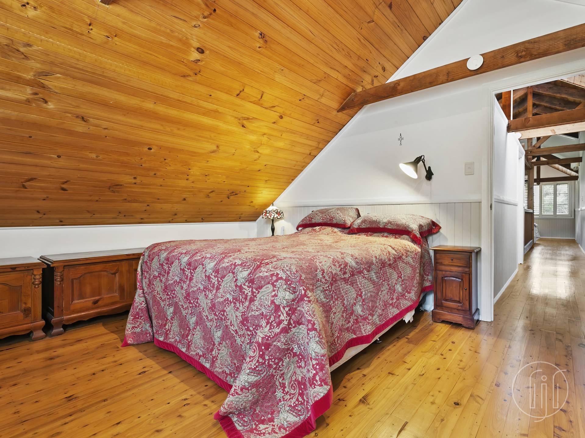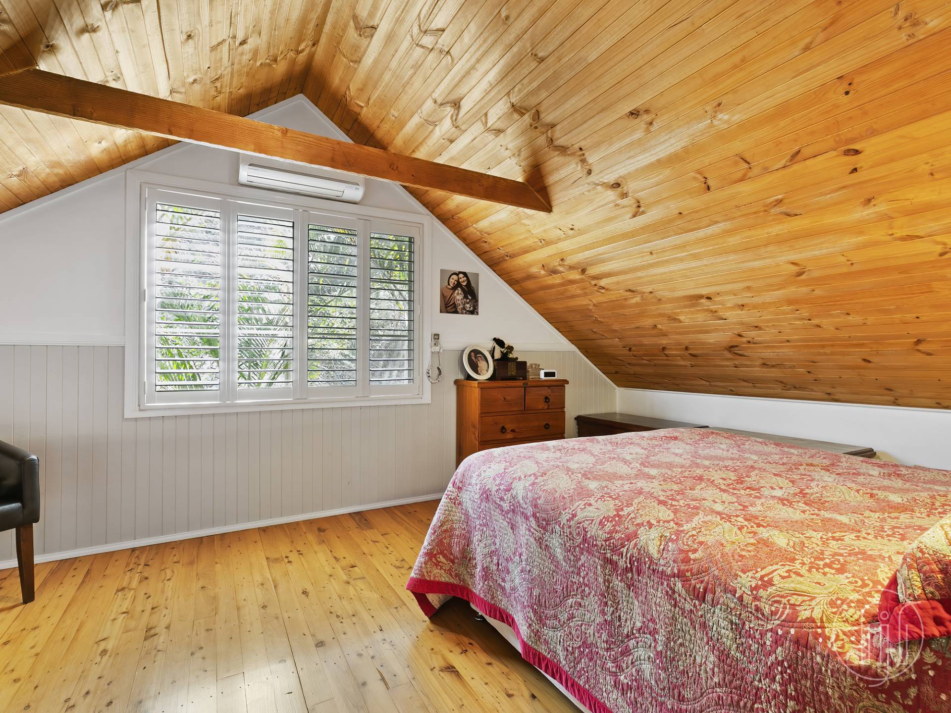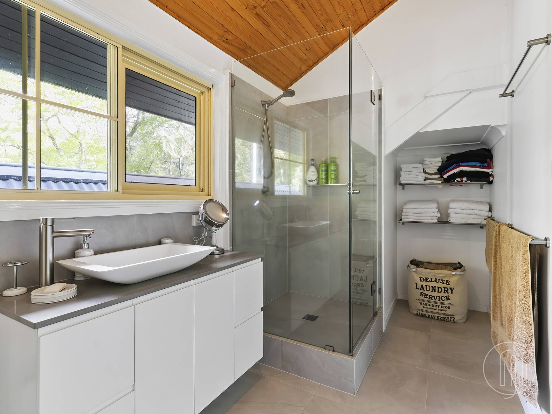 Upstairs is filled with sunshine and light and has three good sized bedrooms, two with walk in robes, and there are two bathrooms.  This level features timber shutters, polished timber floors, pine lined ceilings, exposed trusses, VJ wall paneling and RC/AC.