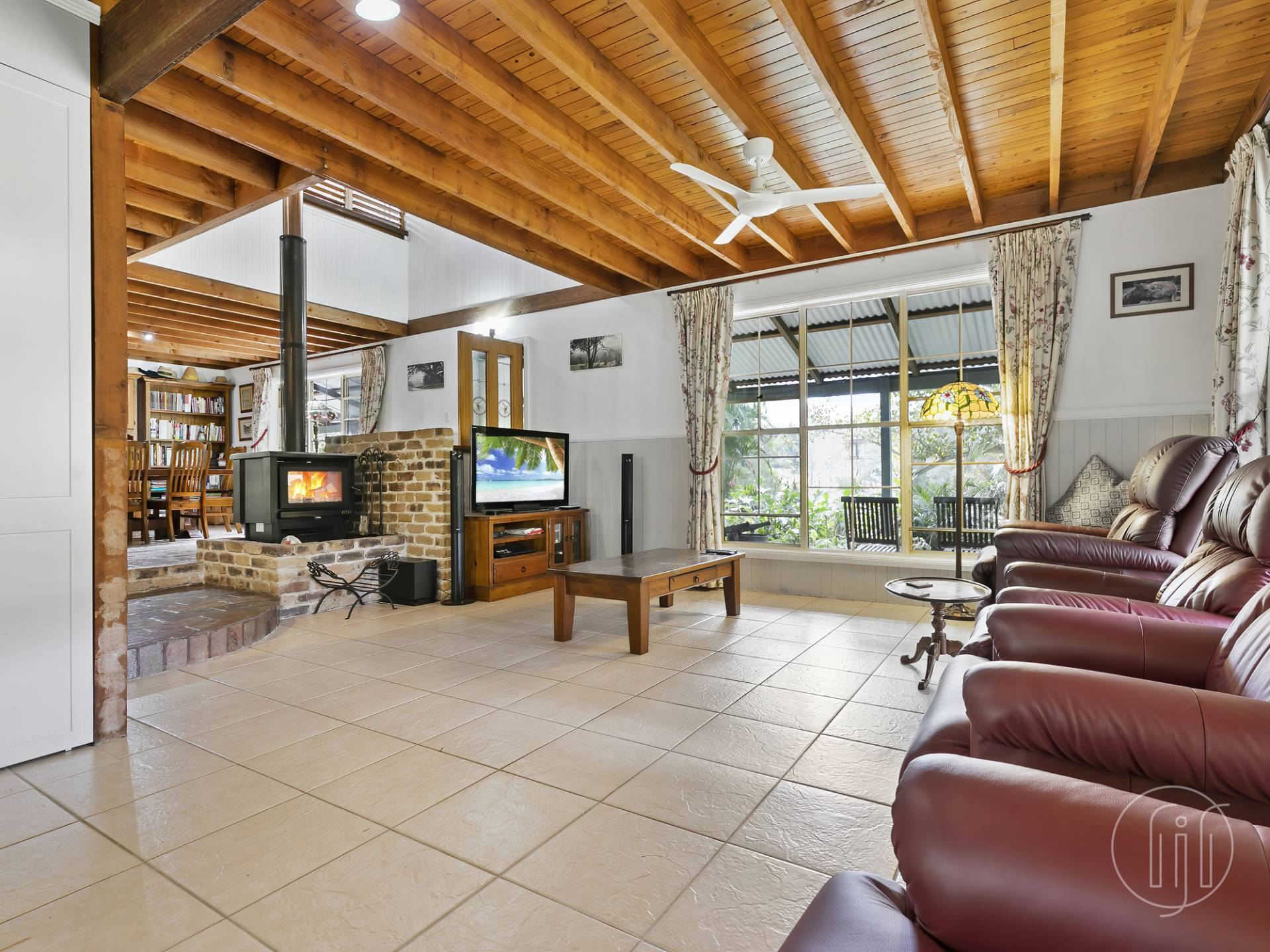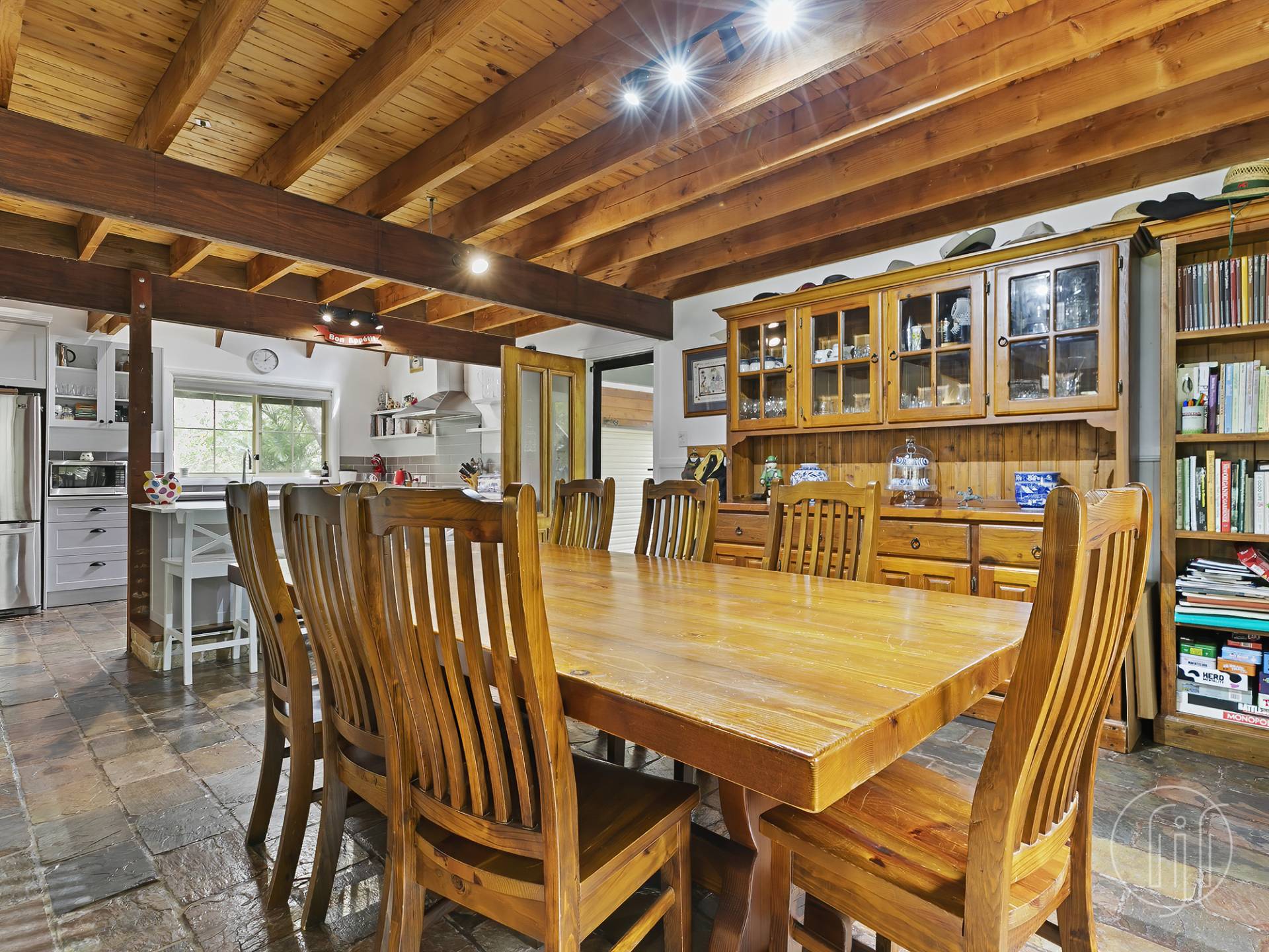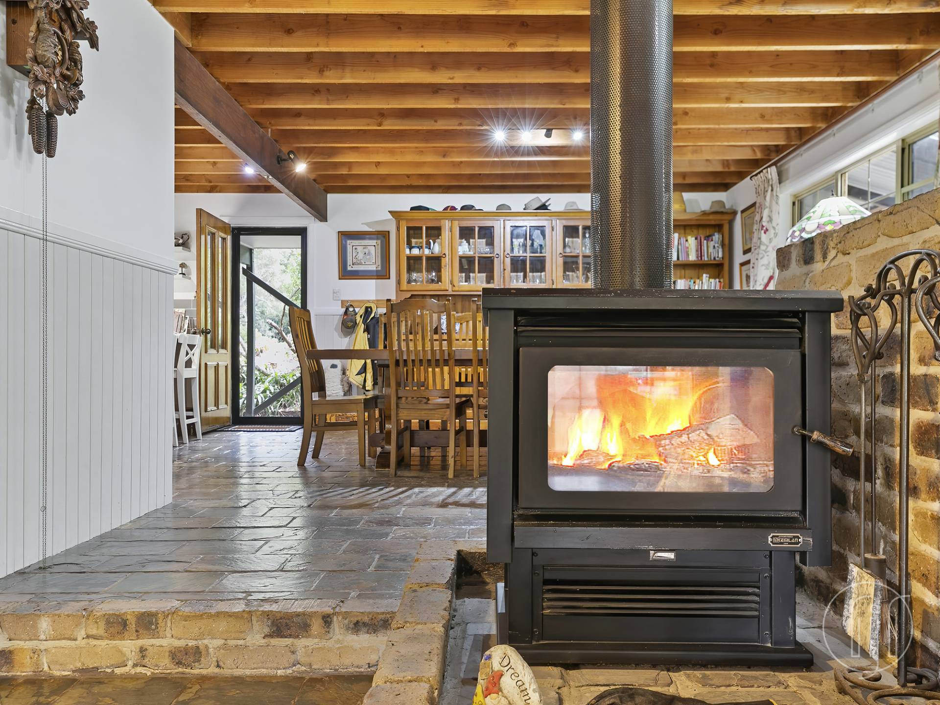 The front entrance takes you into a dual living space with slate flooring, VJ wall paneling, pine lined ceiling and exposed timber beams with the sunken lounge to the left with built in study desk, and large dining room to the right.  These areas are separated by a slow combustion fireplace with glass doors on either side.