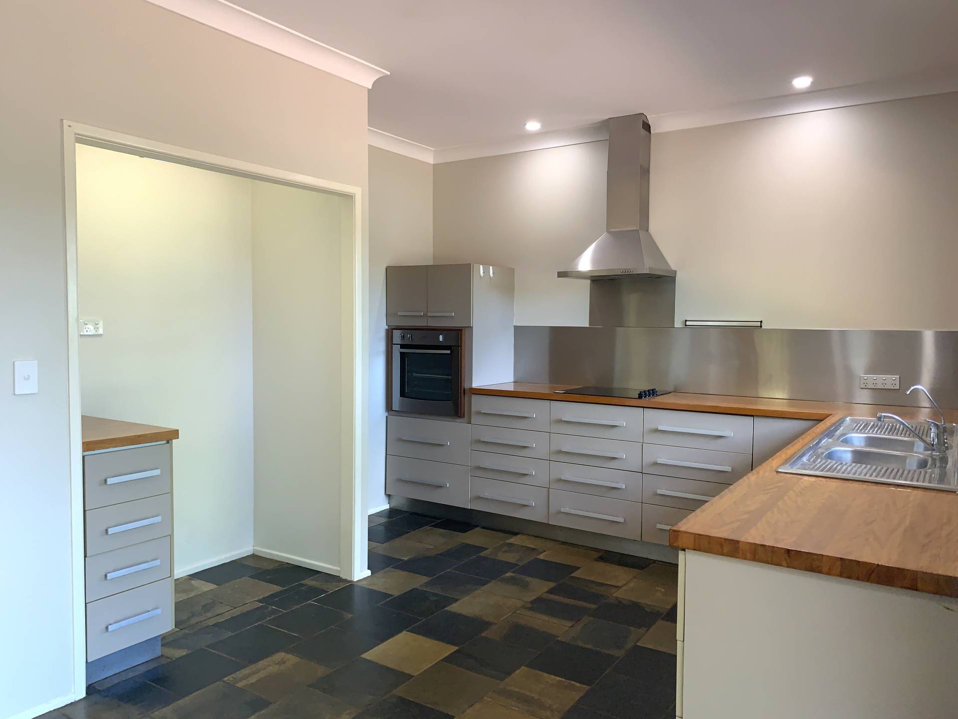 *  Spacious kitchen with electric cooking appliances, walk in pantry, wooden benchtops, ample cupboard space and room for a double fridge