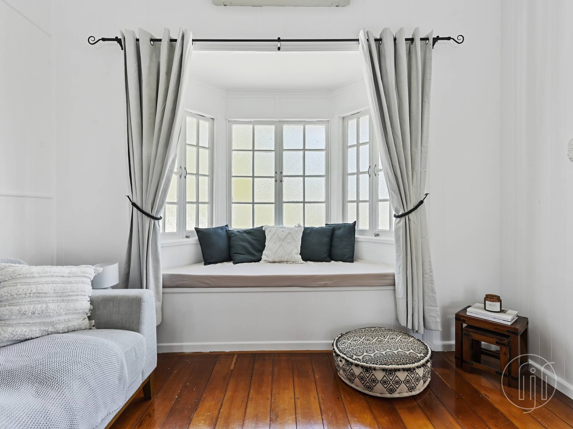 Stepping through to the lounge room the home shows off its high ceilings, VJ walls and ceilings, and polished timber floors.  However, the real feature in this room is the stunning sitting space and casement windows at the front.