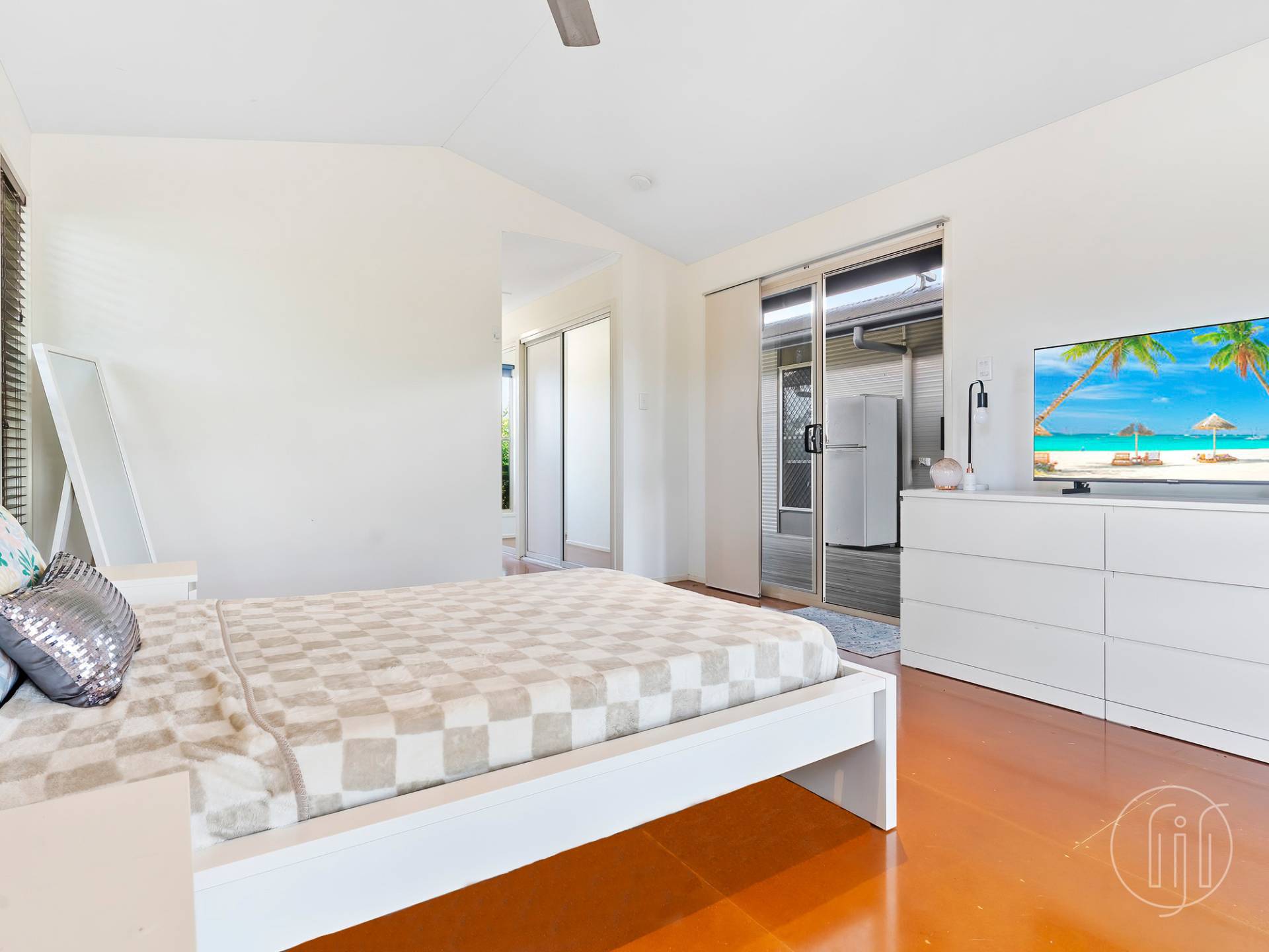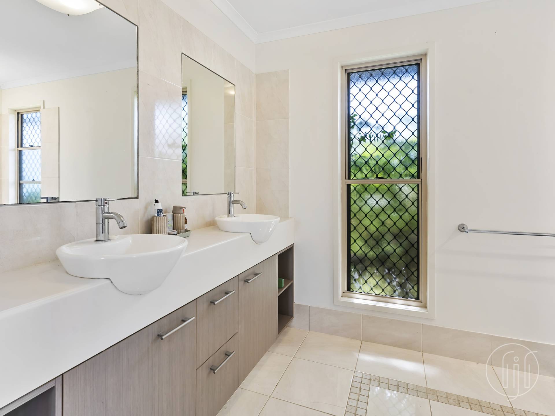The studio wing to the left features the main bedroom with cathedral ceilings, large built-in robe, and a generously sized ensuite bathroom with double vanity, shower and toilet.  Separated by the breezeway, this section of the home provides great privacy.