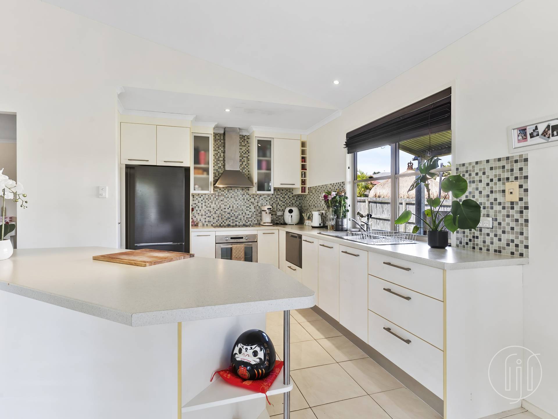 The main wing is accessed via sliding doors on either side of the lounge room.  The lounge, dining and kitchen areas are open planned with cathedral ceilings and large modern tiles throughout.  The kitchen is separated by an island bench, has a modern fit out, ample cupboard storage, and stainless-steel appliances including single drawer dishwasher, under bench oven, feature rangehood & glass hotplates.