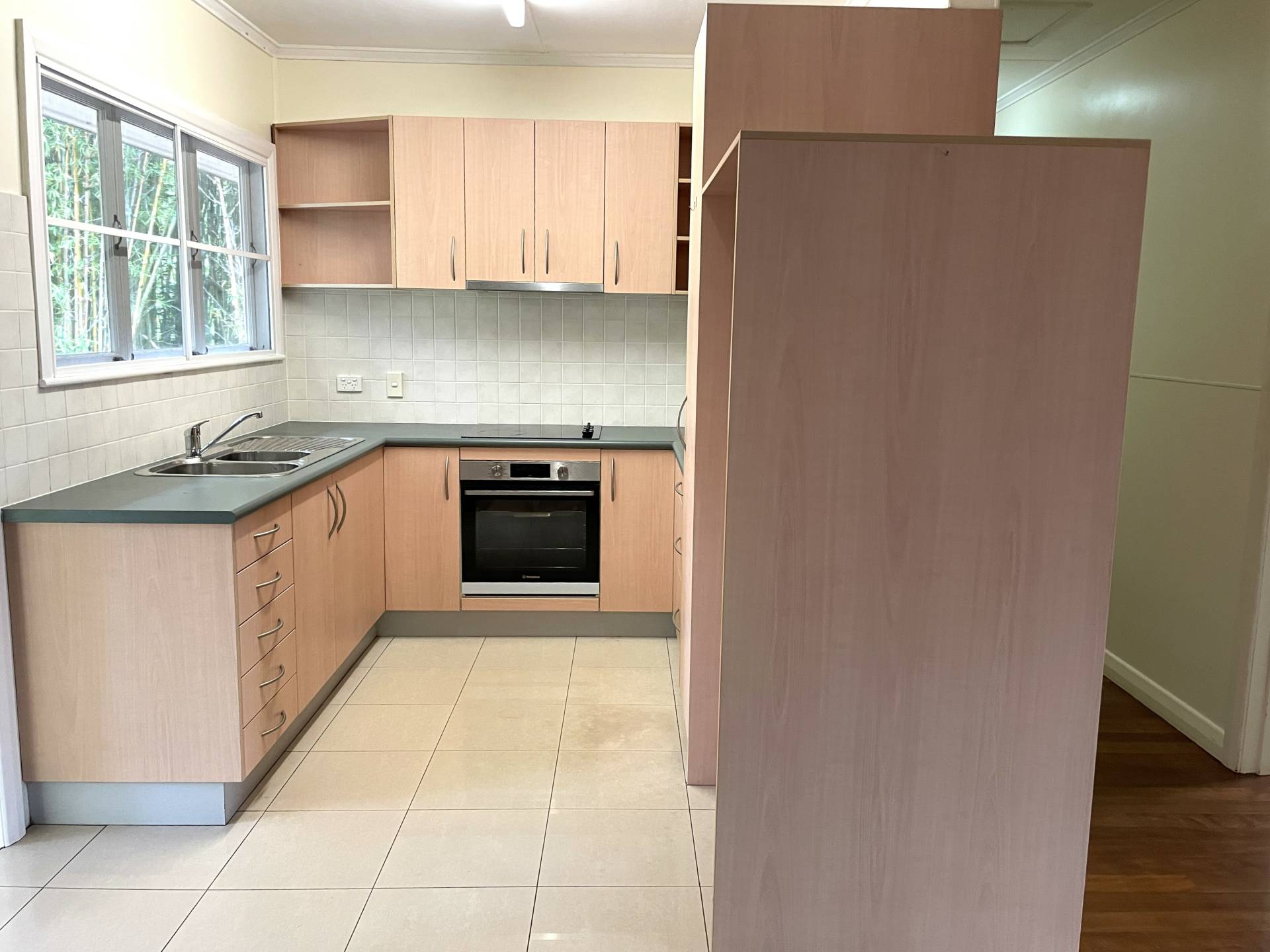 The kitchen is light and bright with ample cupboard storage, a separate pantry, and electric cooking facilities.