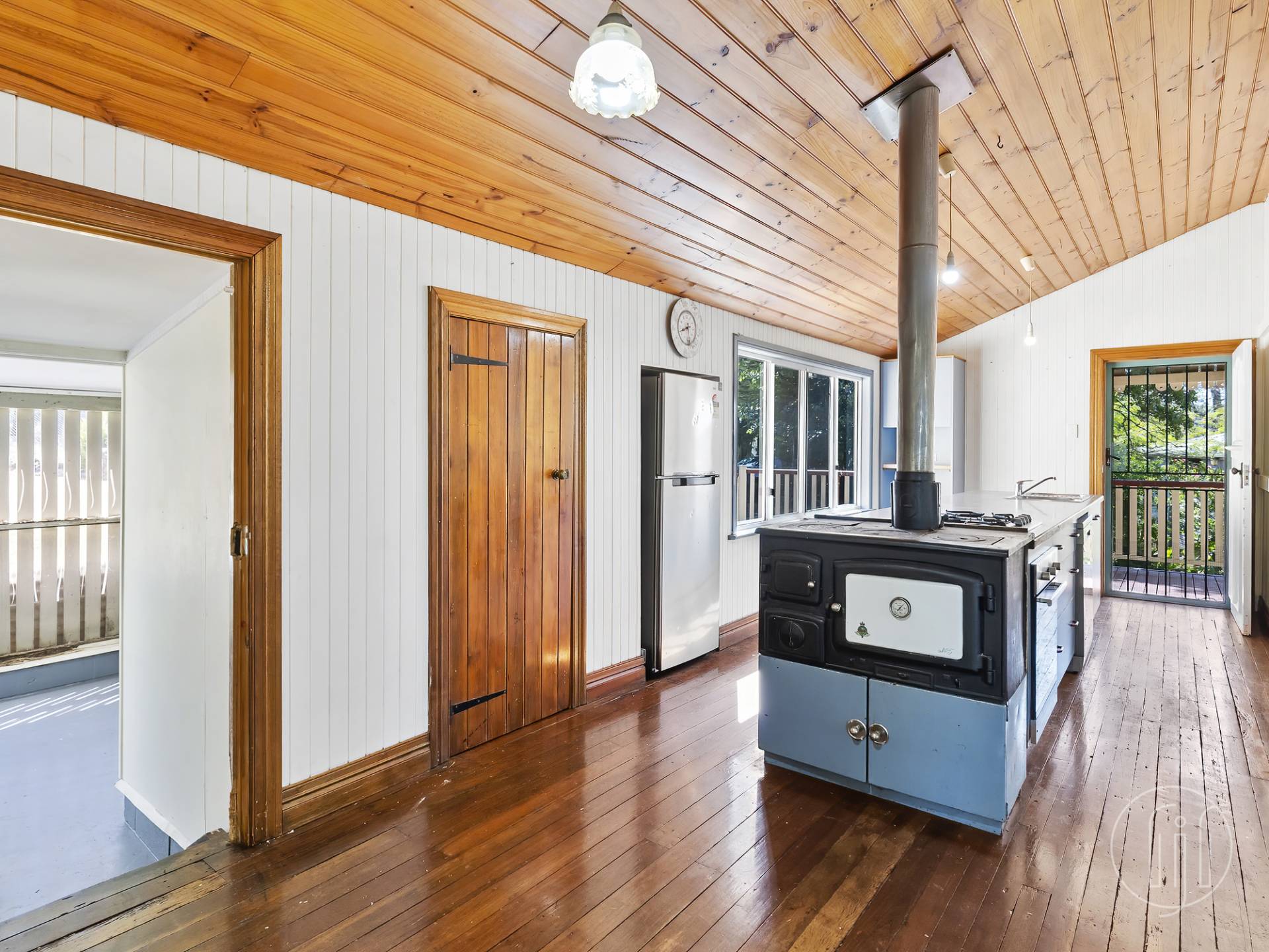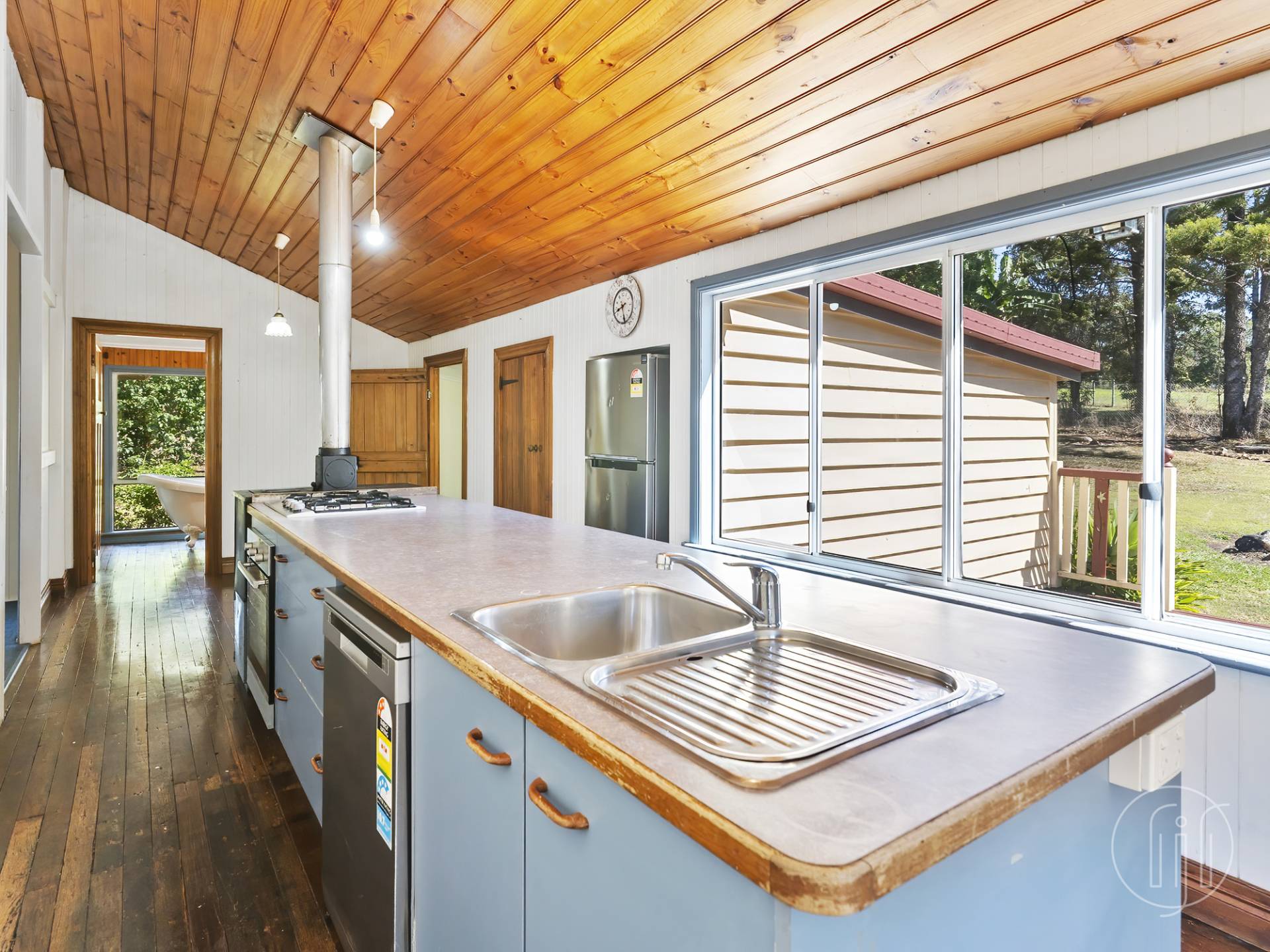 Corner steps lead you onto the open deck for outdoor entertaining, around to the covered entry porch and straight into the kitchen. The kitchen has a long island bench in the centre with access from both sides, timber floors and VJ walls and ceilings. There are gas hotplates, an under-bench oven and dishwasher, a great pantry and space for a dining table at the end.